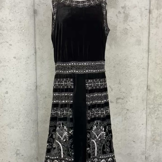 Exceptional Antique 1920s Black Velvet Dress with Silver Beadwork & Geometric Motifs, M - L