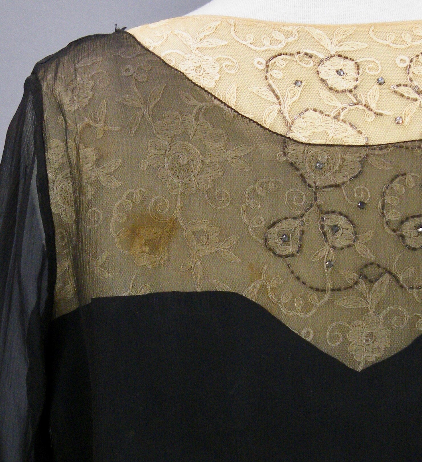 The dress is styled with a sleeveless under-bodice of creamy beige floral embroidered net lace, finished with a graceful scoop neckline. The neckline is subtly accented with prong-set rhinestones and glass bugle beads, all mounted onto a solid black silk foundation. Over this, the sheer silk georgette overlay forms a wide-set V-shaped cowl neckline, weighted at the center front with a small covered weight to ensure elegant drape and placement.