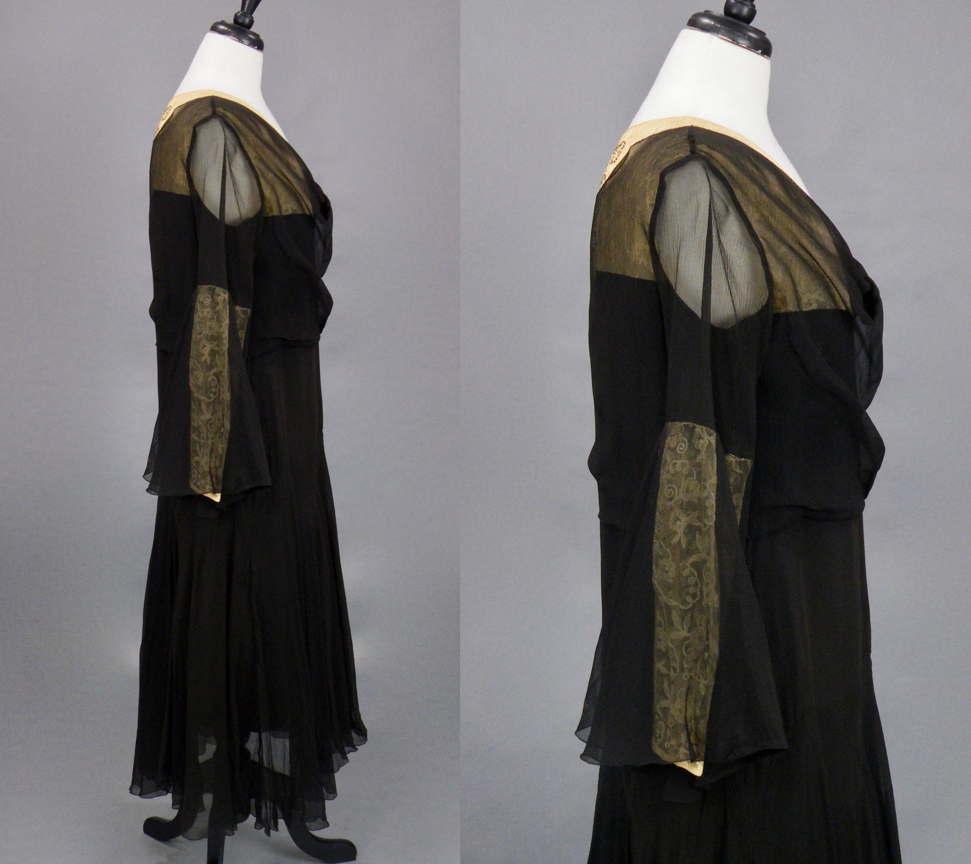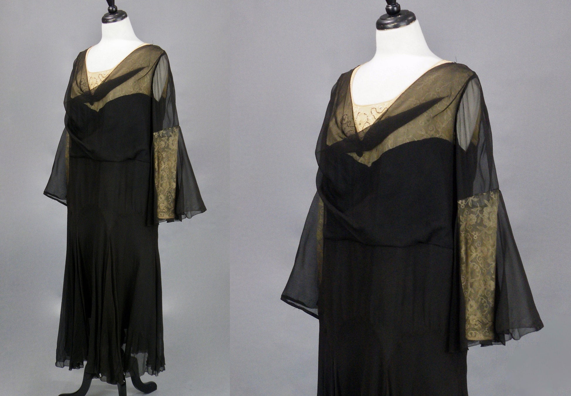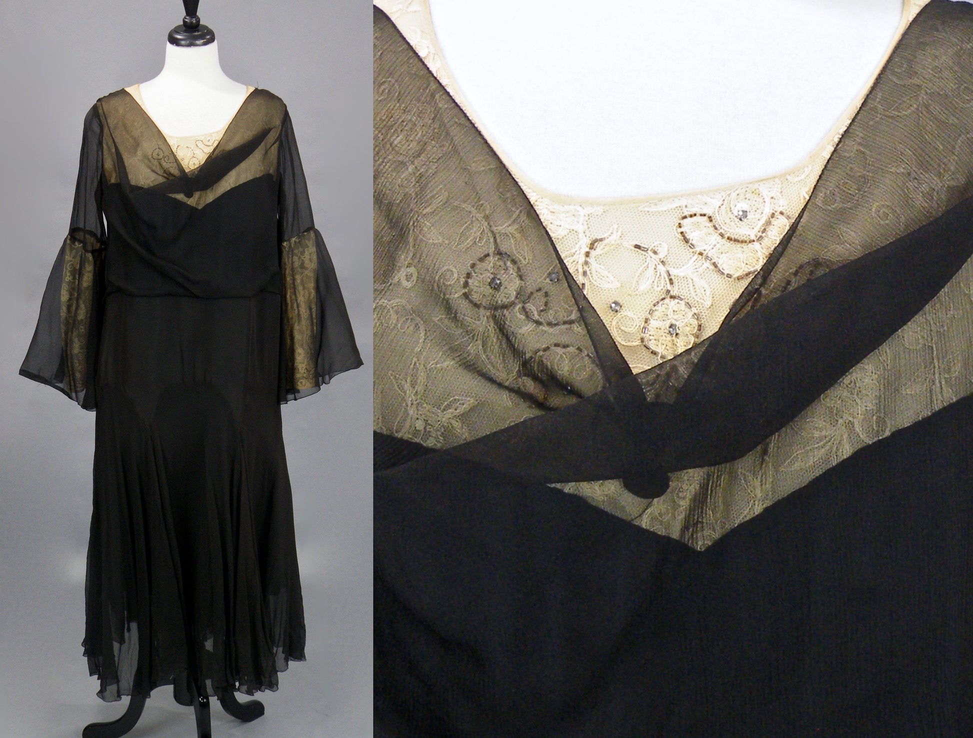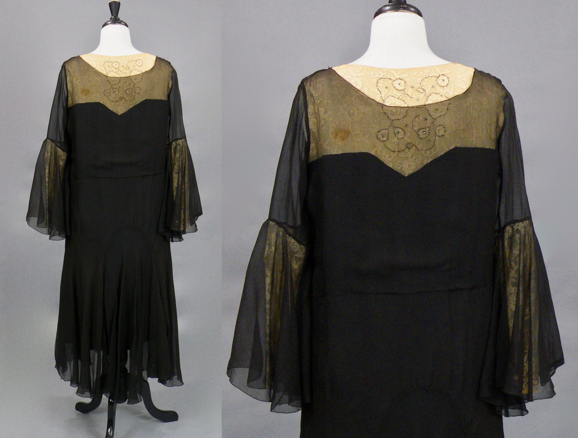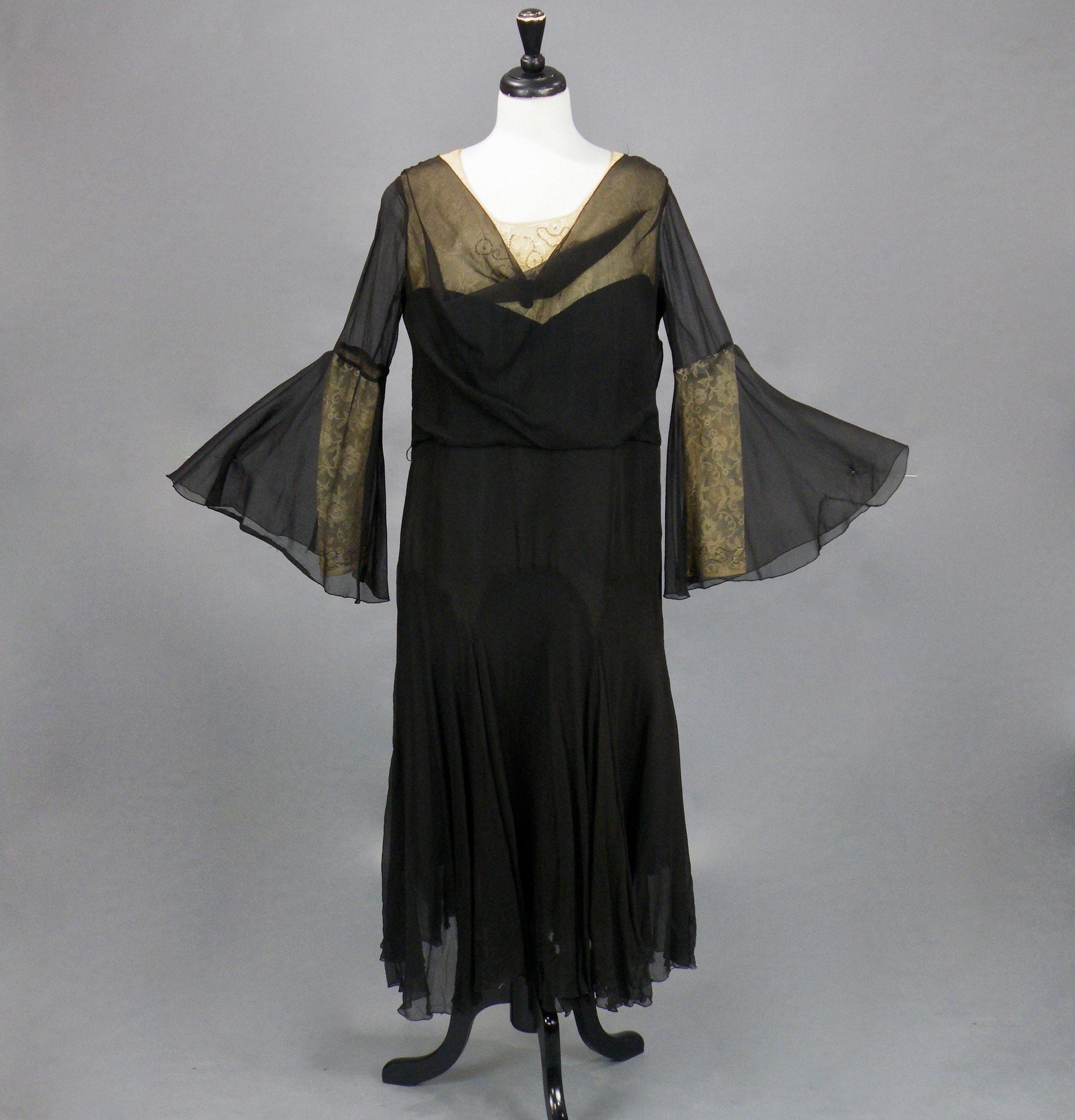 Striking vintage late 1920s to early 1930s evening dress crafted in sheer black silk georgette layered over embroidered and beaded net lace, featuring truly spectacular bell sleeves.