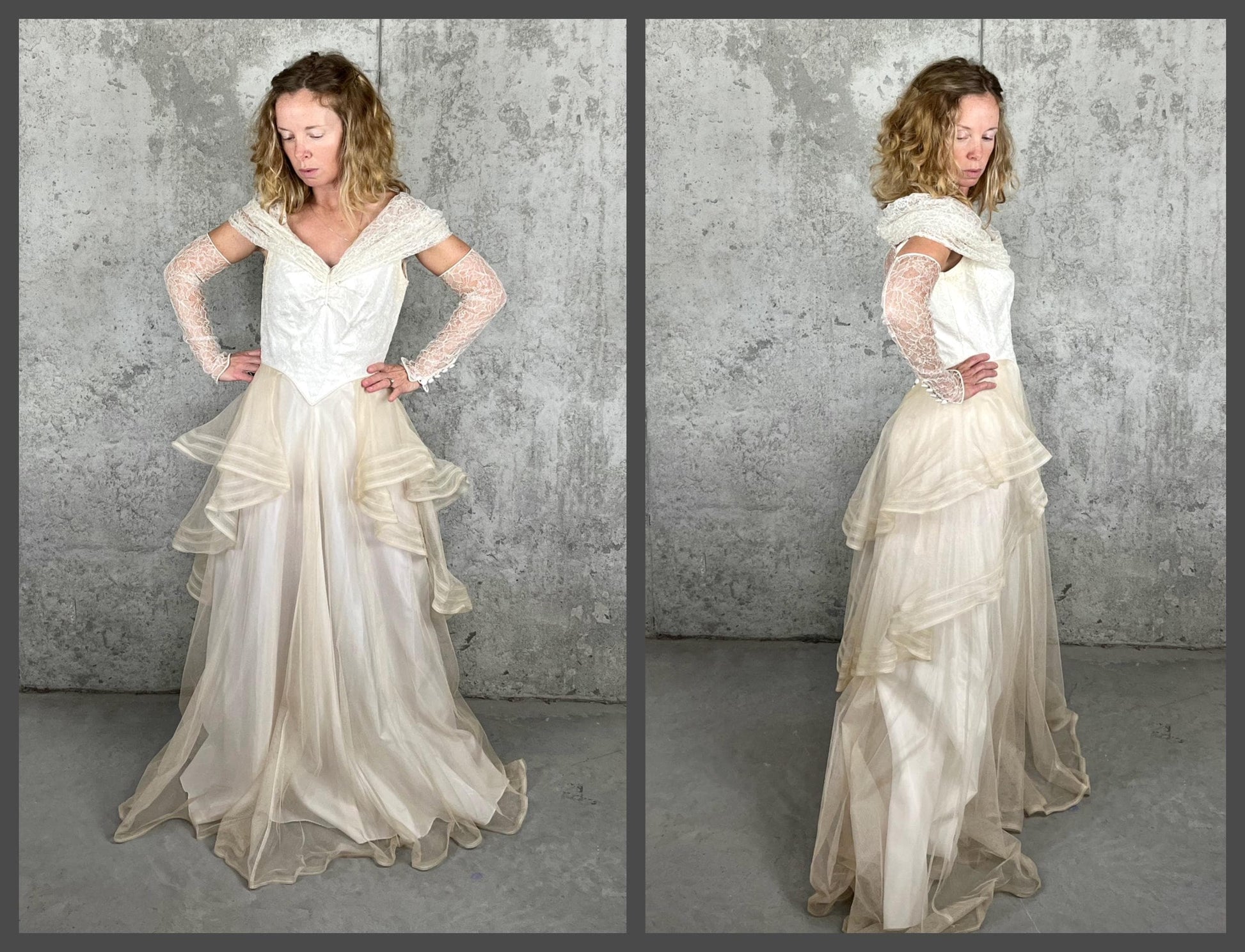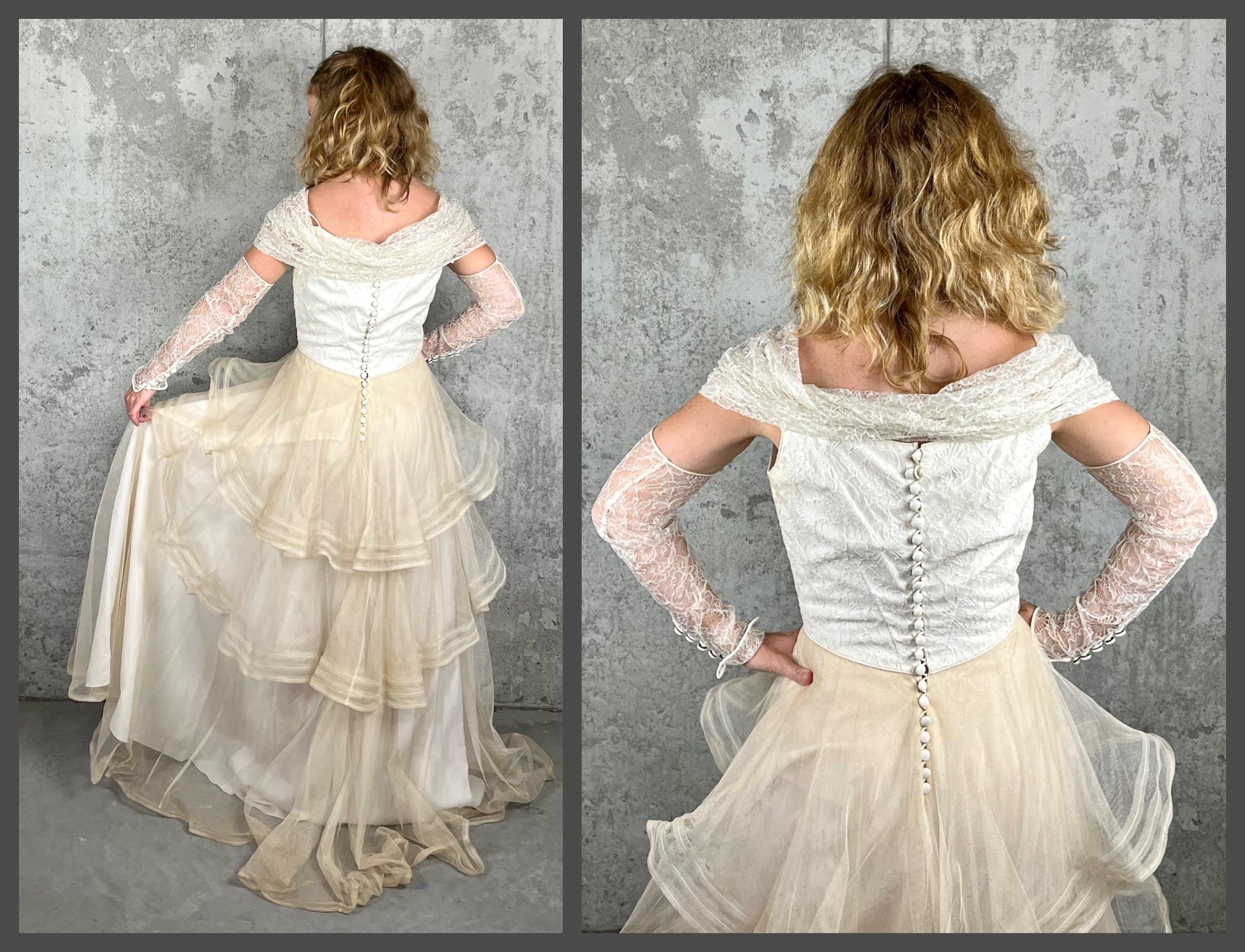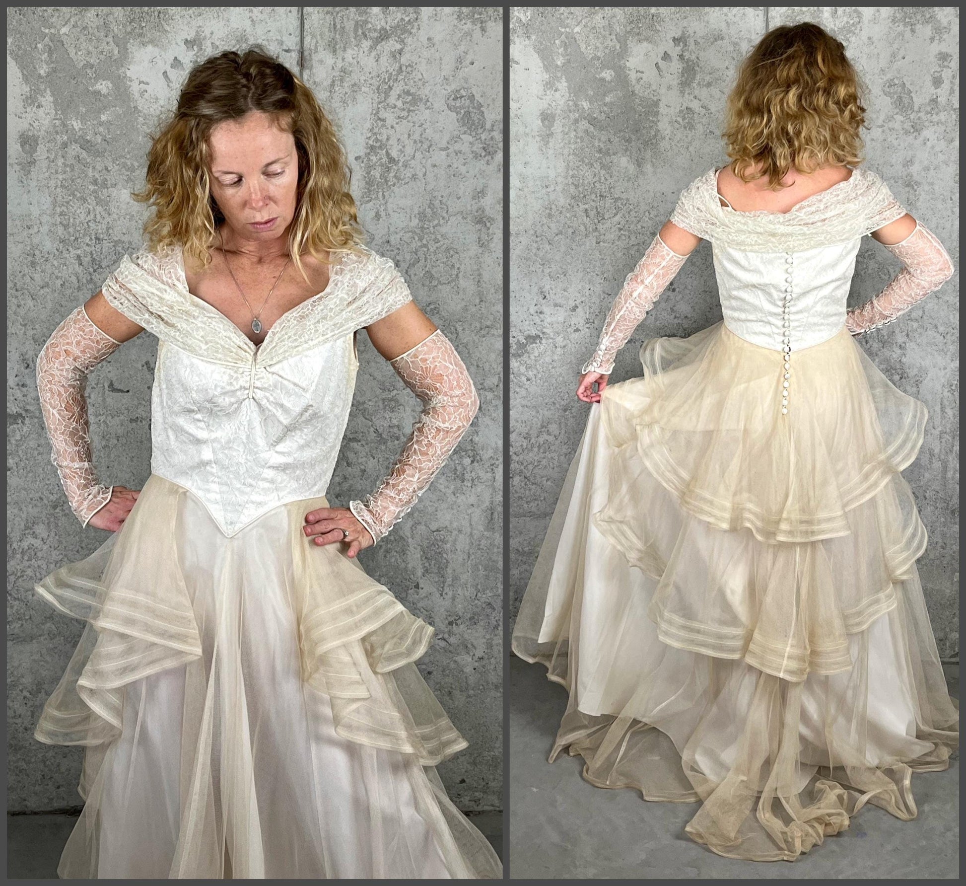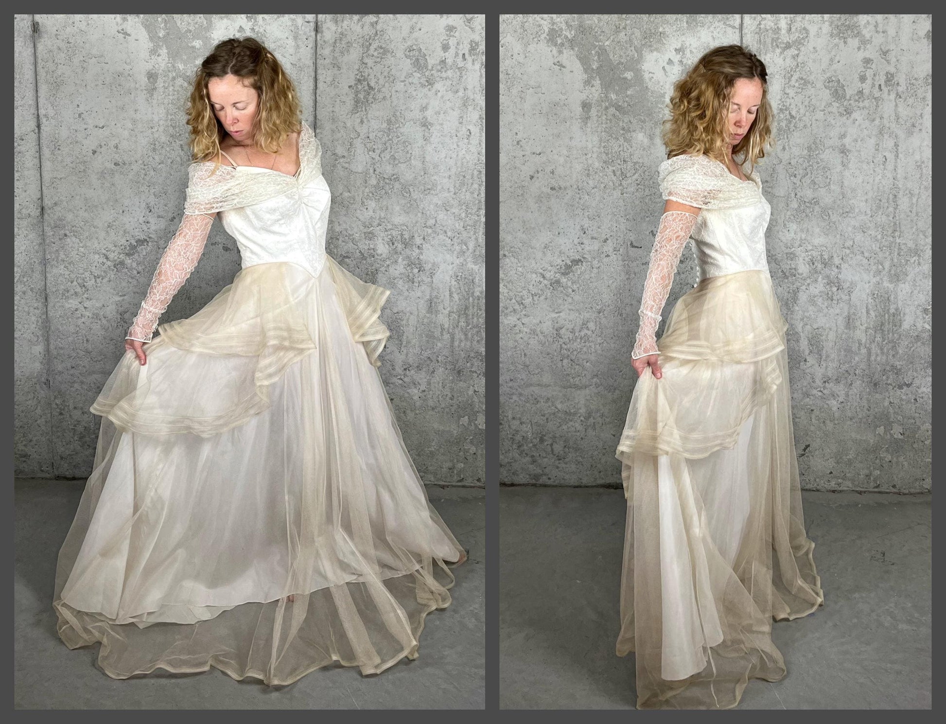 Vintage Late 1930s–1940s Wedding Dress, Satin & Net Lace Bridal Gown with Off-Shoulder Collar, Small