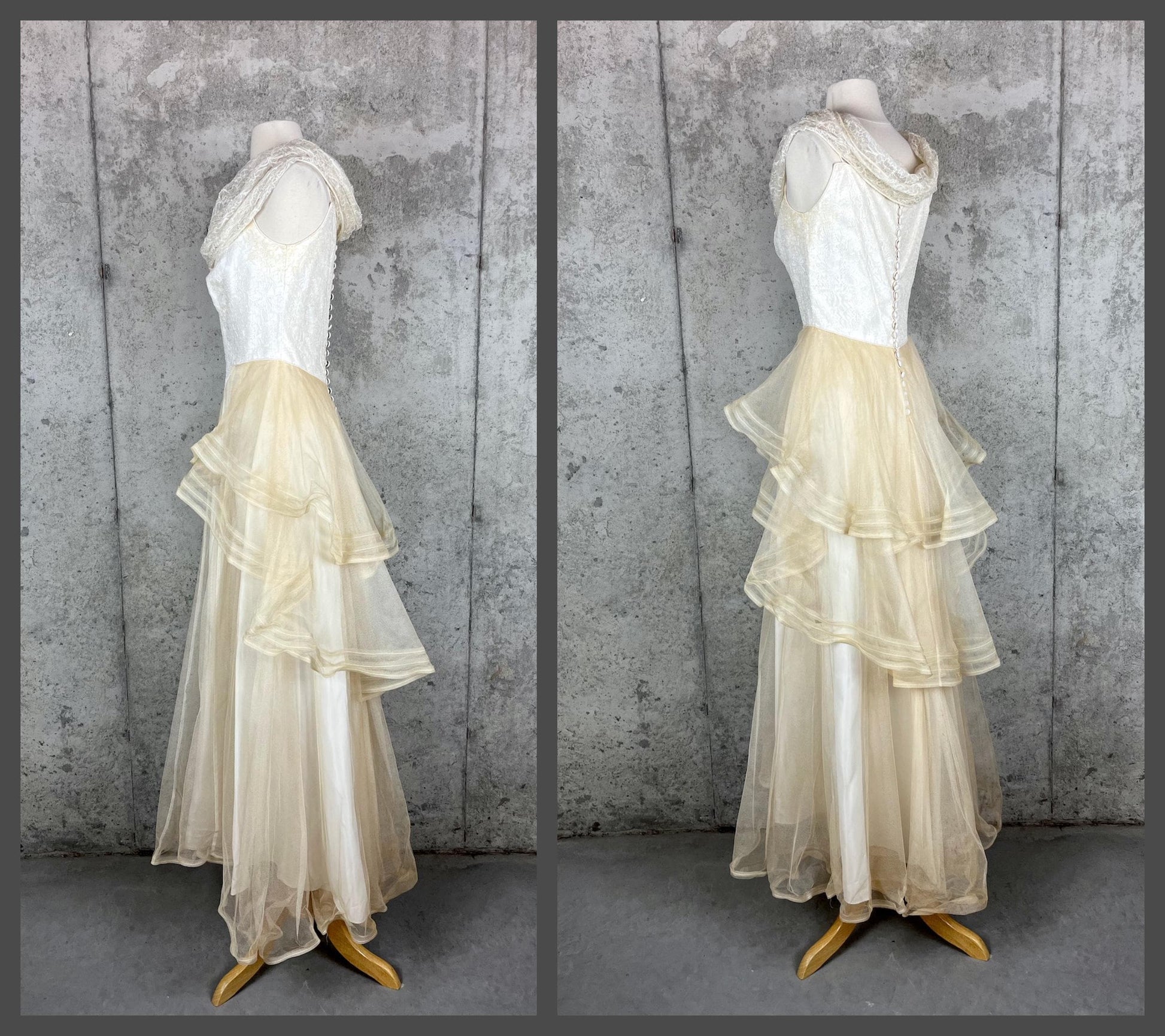 Beautiful vintage late 1930s to 1940s wedding gown crafted in creamy ivory satin with a soft ecru net lace overlay. This elegant bridal dress features a sculpted V-neck bodice of patterned net lace layered over satin, with a gently ruched center front that flatters the bust. A gathered lace shawl collar wraps gracefully around the shoulders, creating a refined off-shoulder effect characteristic of late-1930s bridal design.