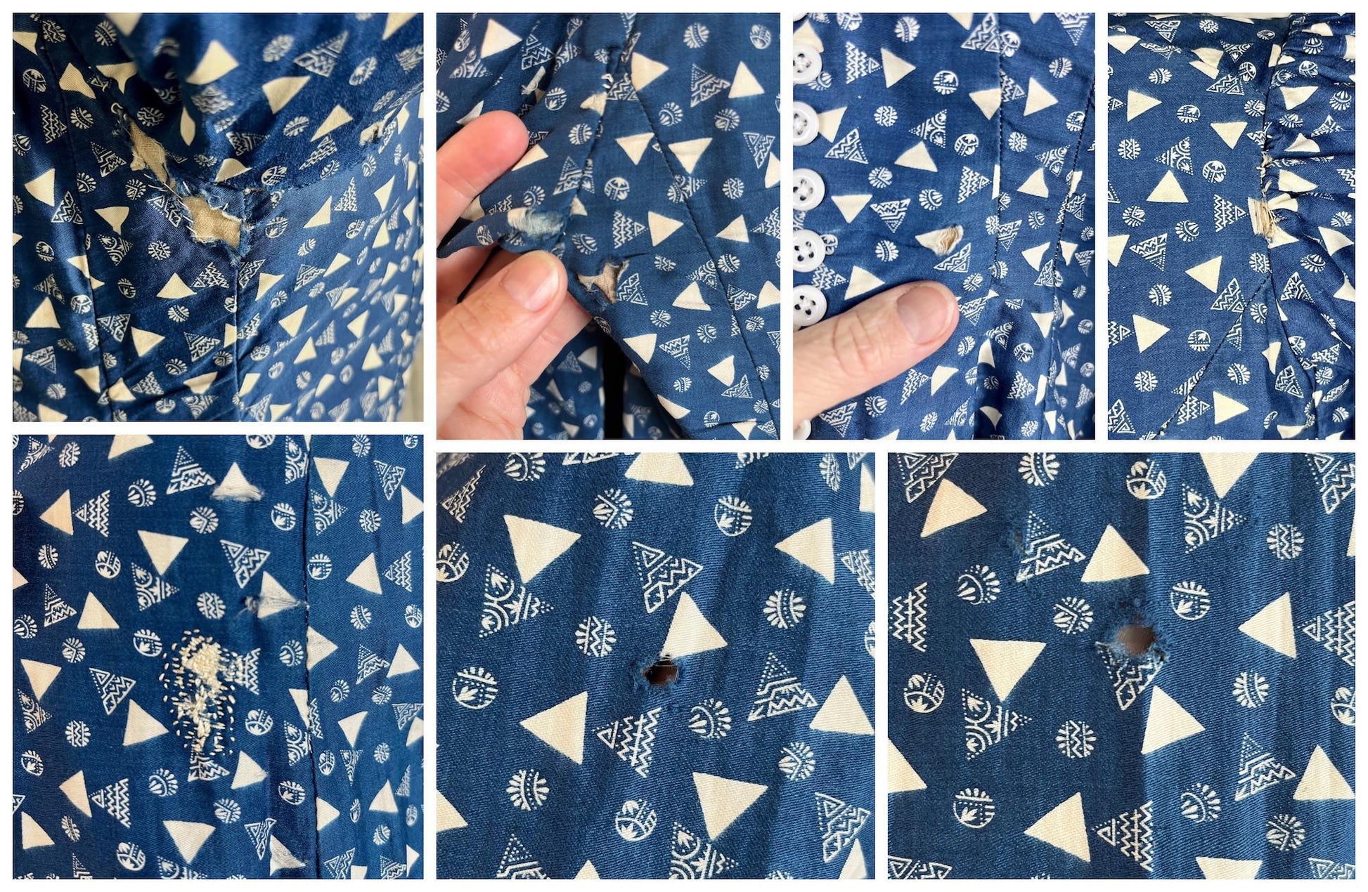 Skirt: One period darn is present, along with two minor holes. Modern bias tape and hook-and-eye closures have been added for stabilization and wearability.