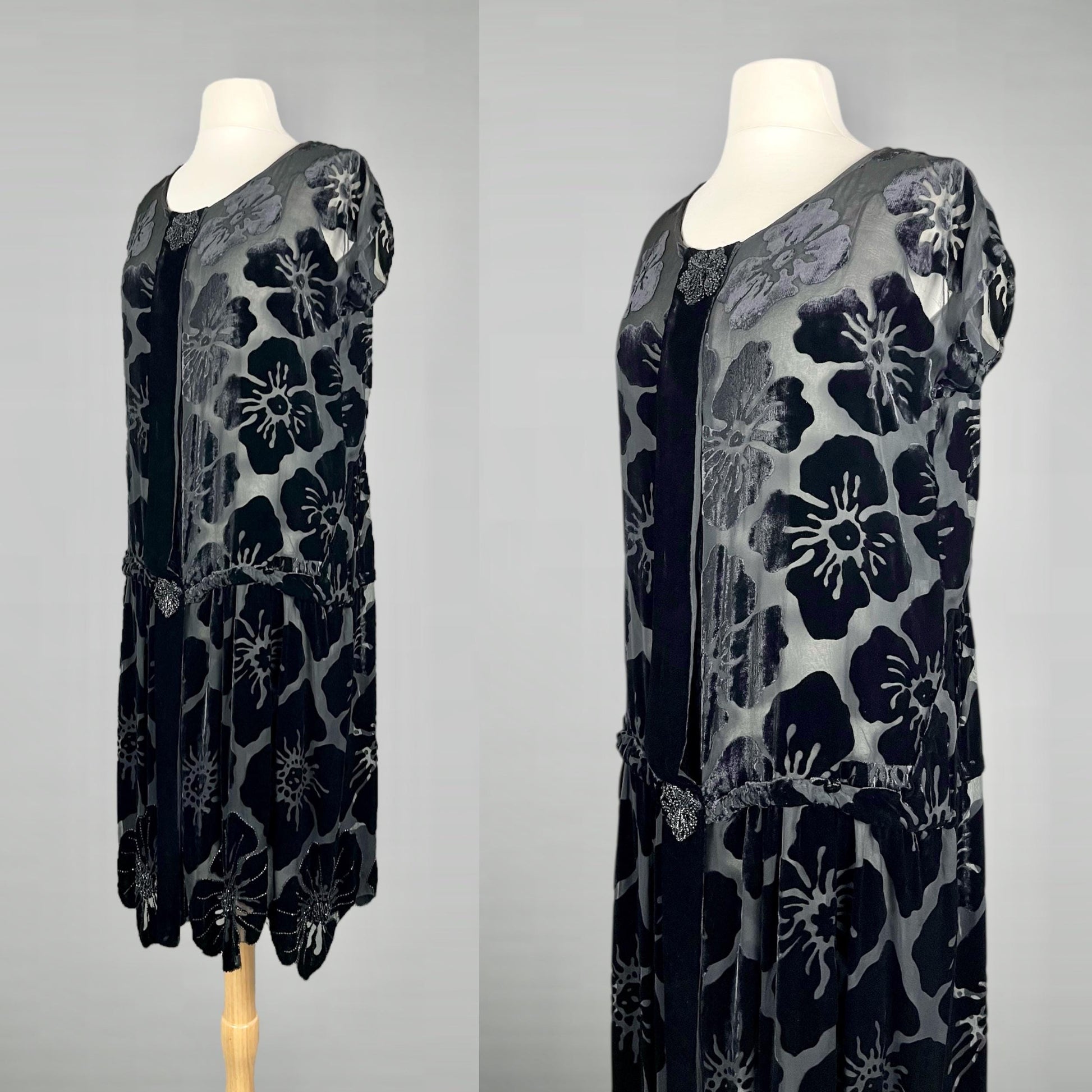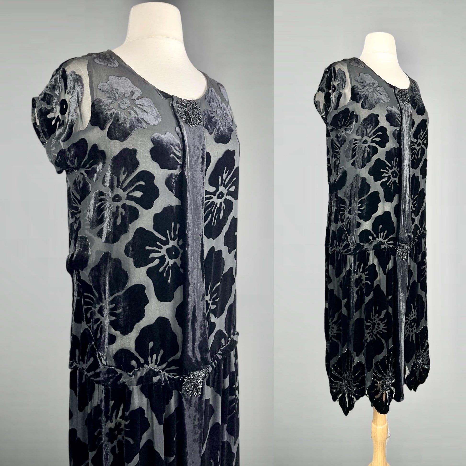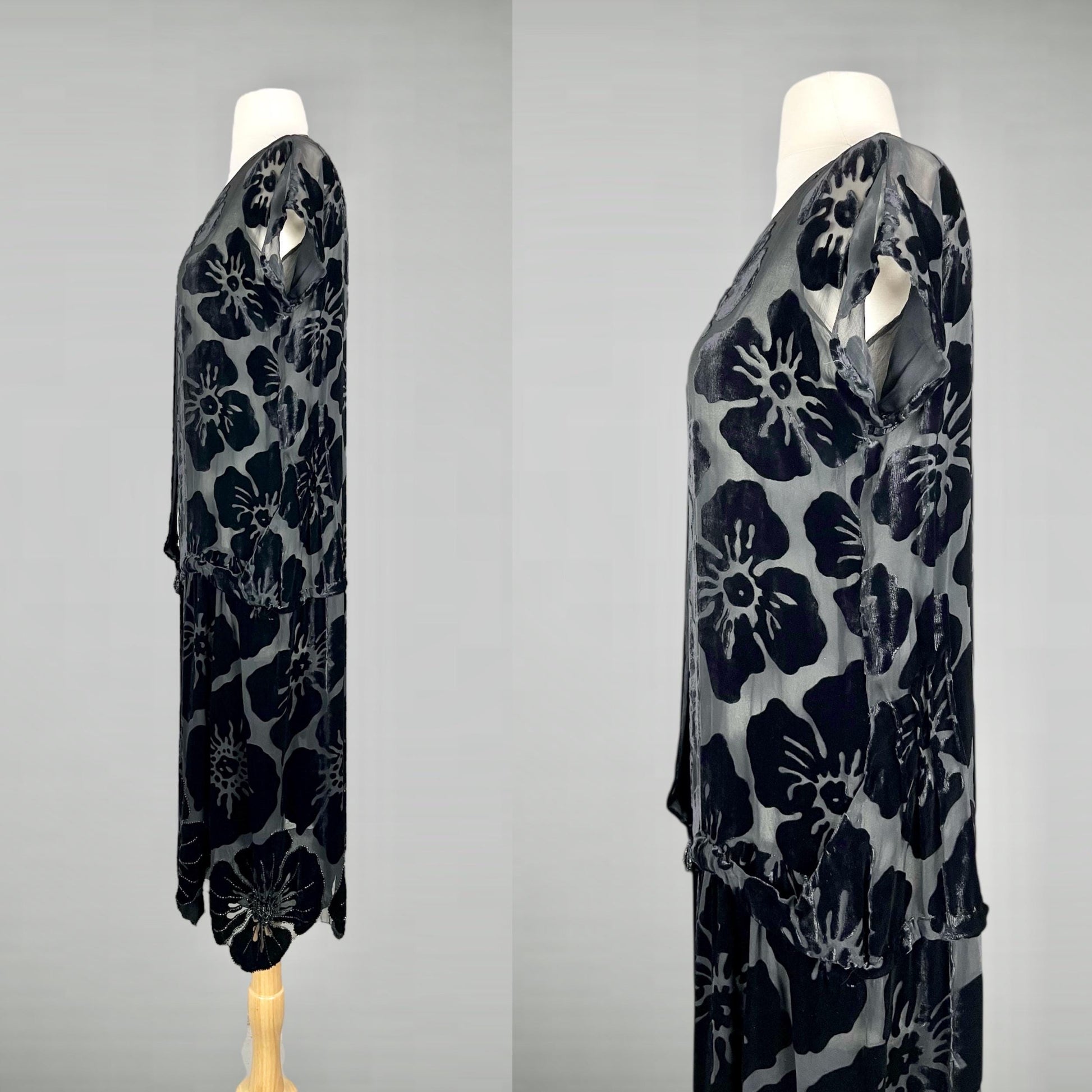 Exquisite vintage 1920s burnout silk velvet flapper dress rendered in rich, inky black with striking tonal contrast. The design plays beautifully with texture and light — plush black silk velvet floral motifs bloom against a sheer silk chiffon ground that reads silvery gray in contrast, giving the surface a luminous, dimensional depth. This devoré velvet construction is a hallmark of high-quality Jazz Age eveningwear.