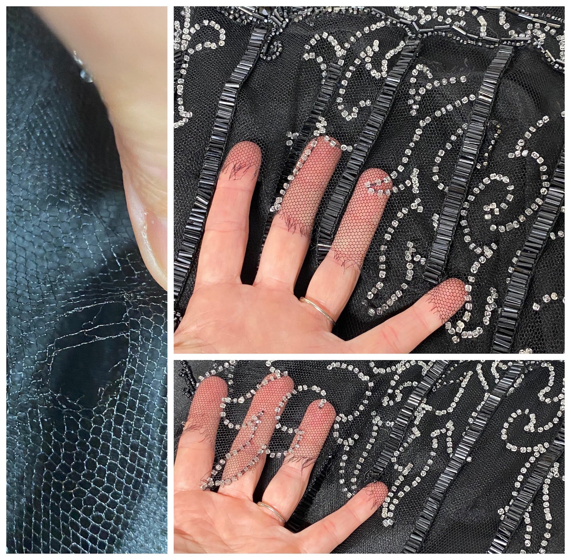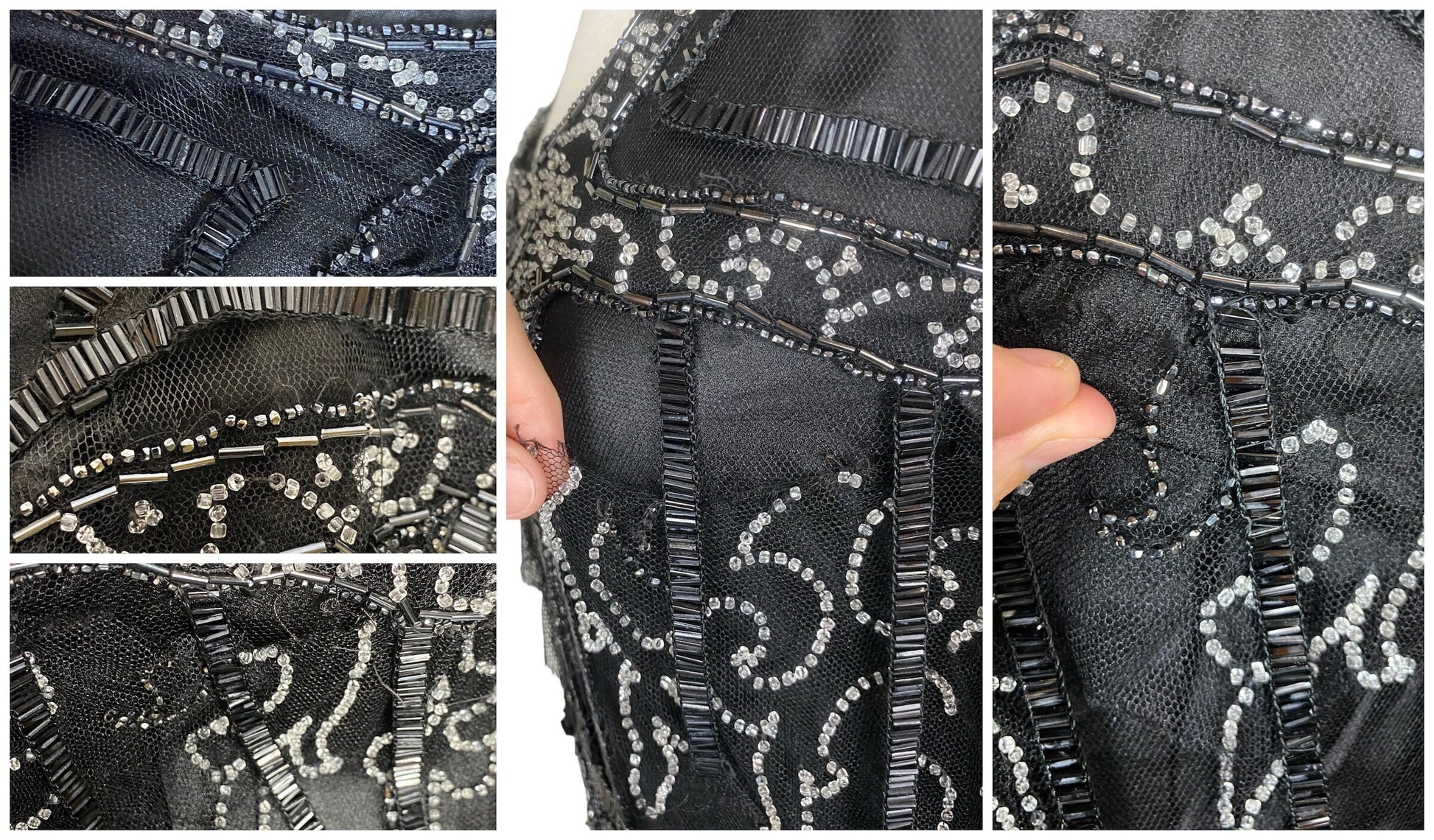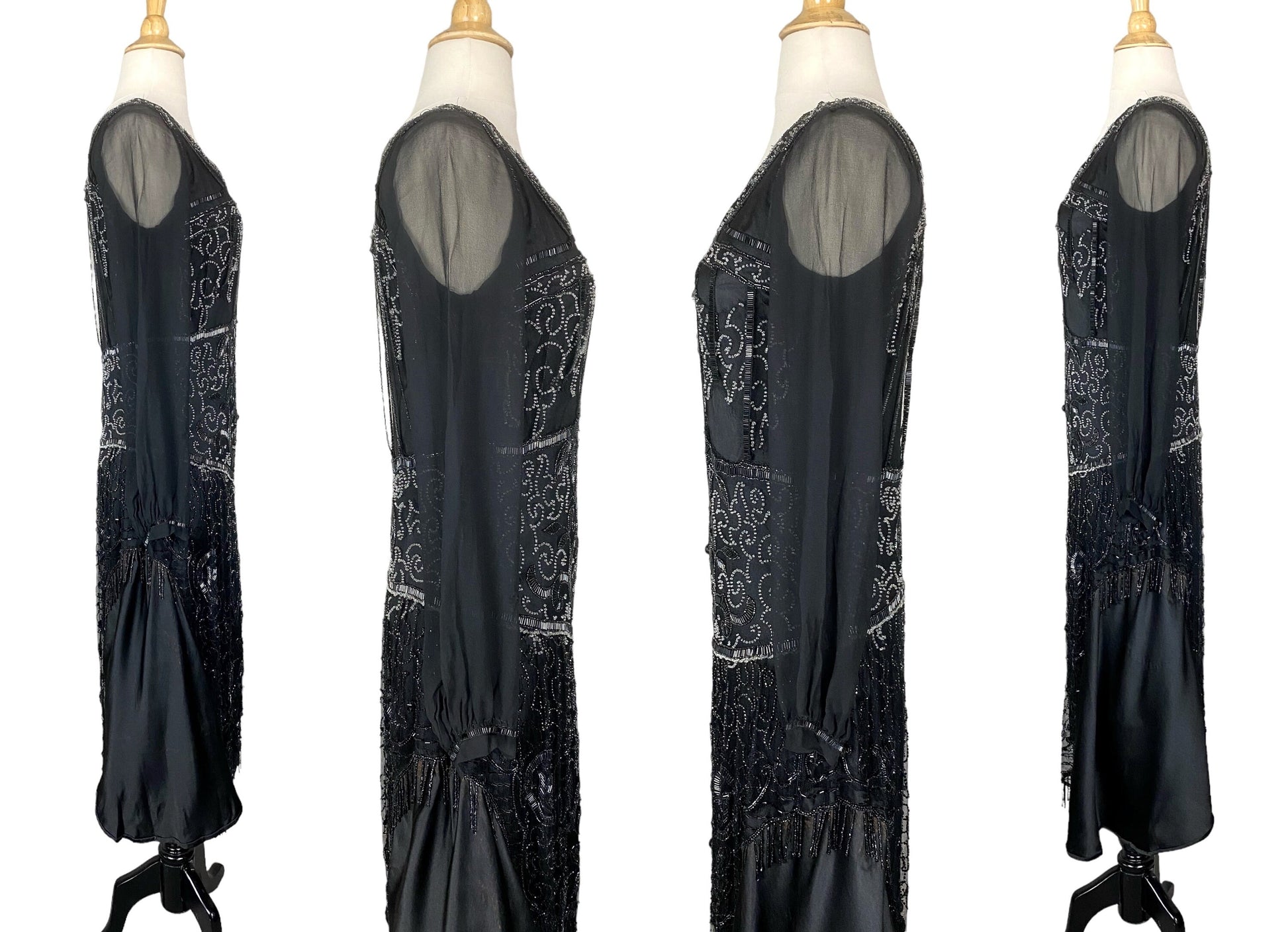 Beneath the embellished net overlay, the dress is underlined in solid black silk (with the exception of the sheer sleeves), with additional silk panels at the skirt sides to provide coverage while maintaining the light, fluid feel typical of 1920s evening wear. There are no closures; the dress slips on over the head and is designed for a relaxed, body-skimming fit.