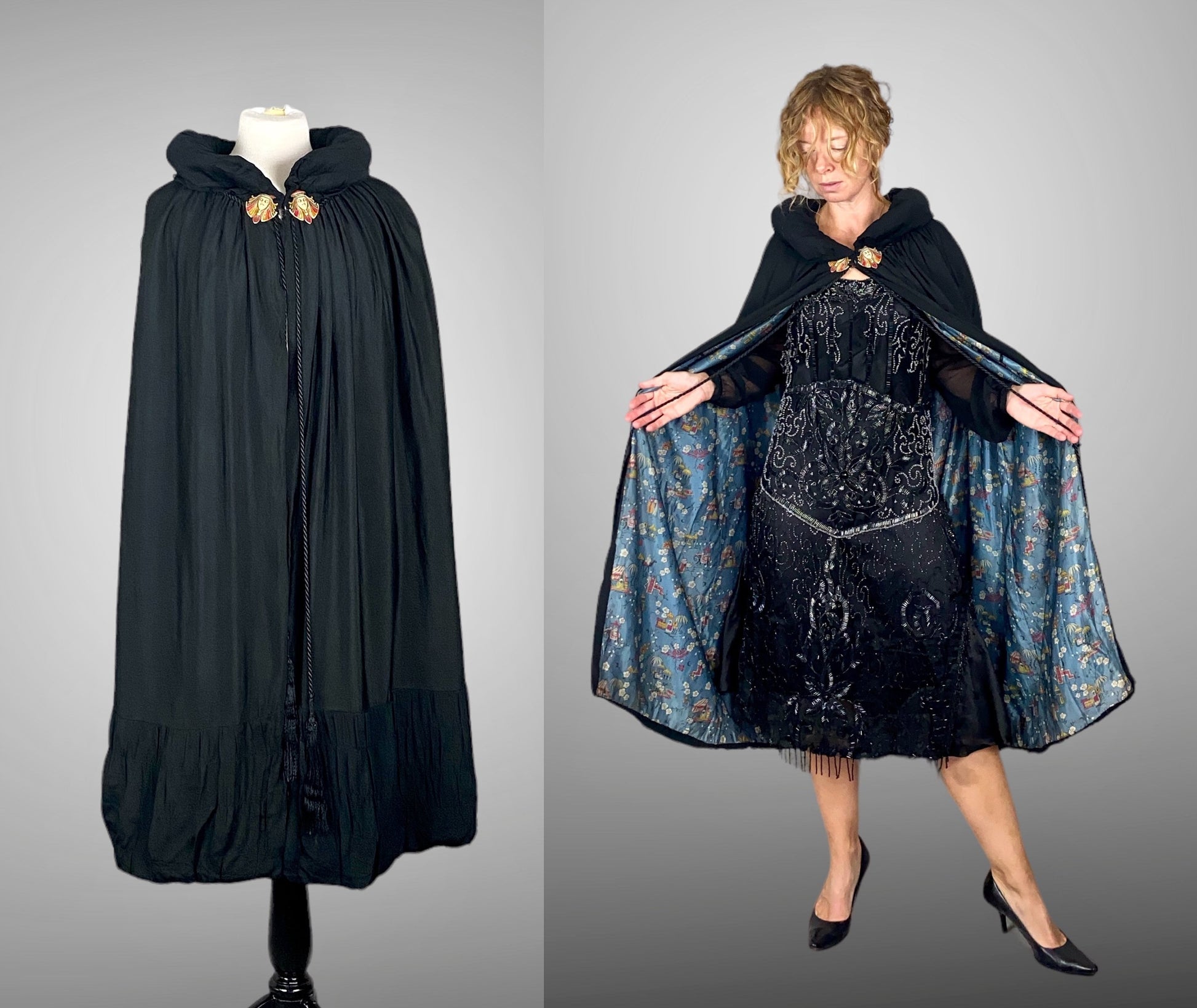 A coiled silk fringe tassel trims the neckline and extends down the front edges, adding movement and theatrical flair. The silhouette is softly gathered at the hem, allowing the cape to drape fluidly over the shoulders and body. Inside, the printed silk lining is especially eye-catching, featuring a rich mix of Indian, Asian, and Middle Eastern–inspired motifs — a true “melting pot” of global influences that were highly fashionable during the 1920s Egyptian Revival craze.
