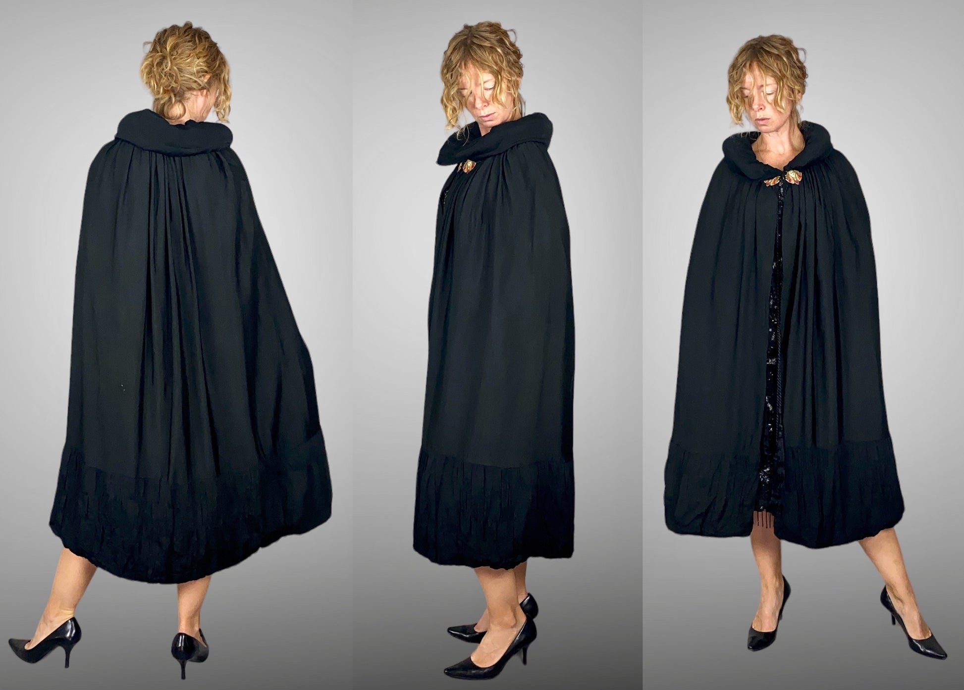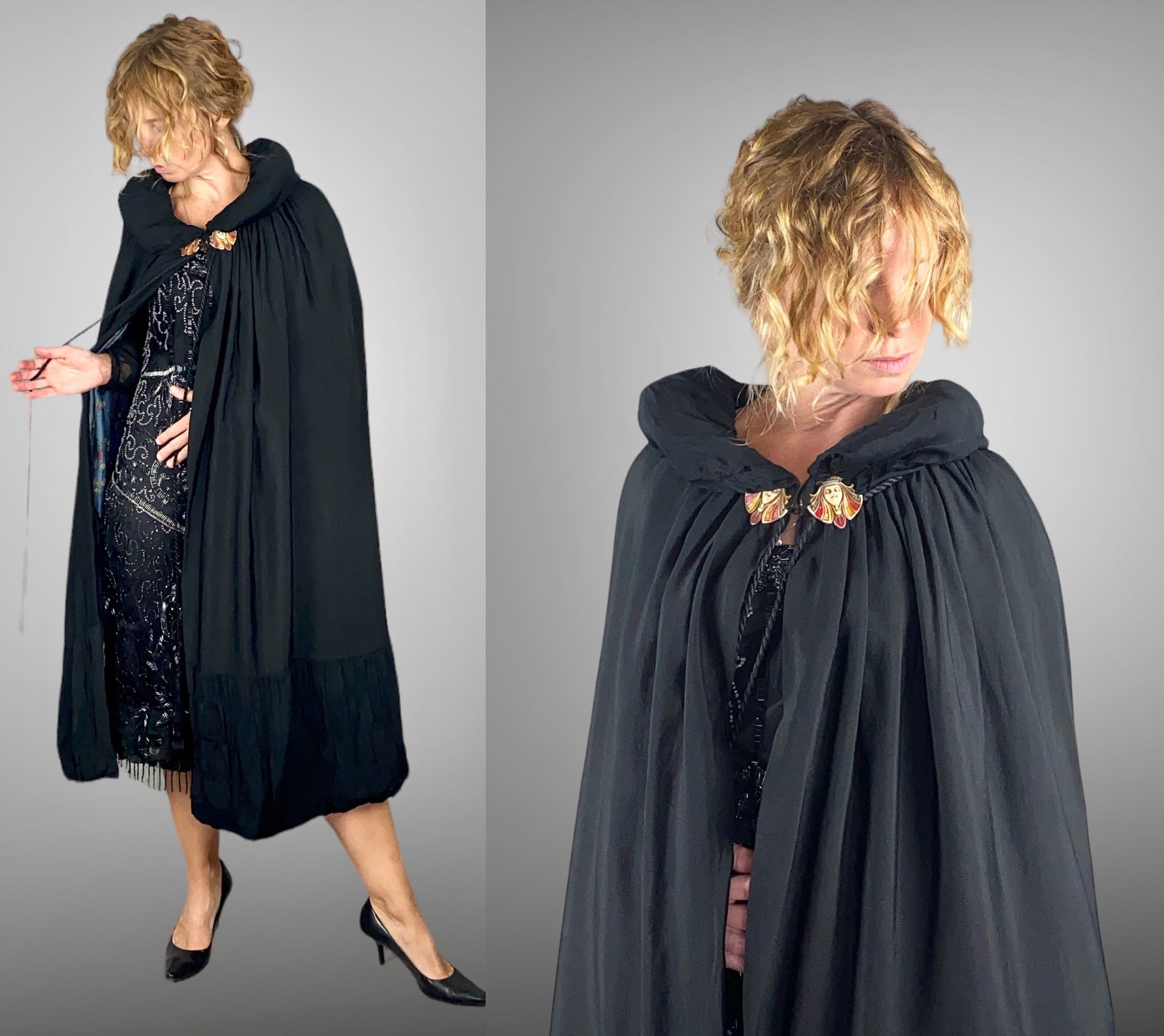 Striking vintage 1920s black silk cape showcasing dramatic Egyptian Revival influence, a hallmark of late Jazz Age design. This exceptional cape is centered by two etched embellishments at either side of the padded collar neckline, depicting stylized Egyptian or ancient priestess figures — bold, graphic details that immediately anchor the piece in Art Deco exoticism.