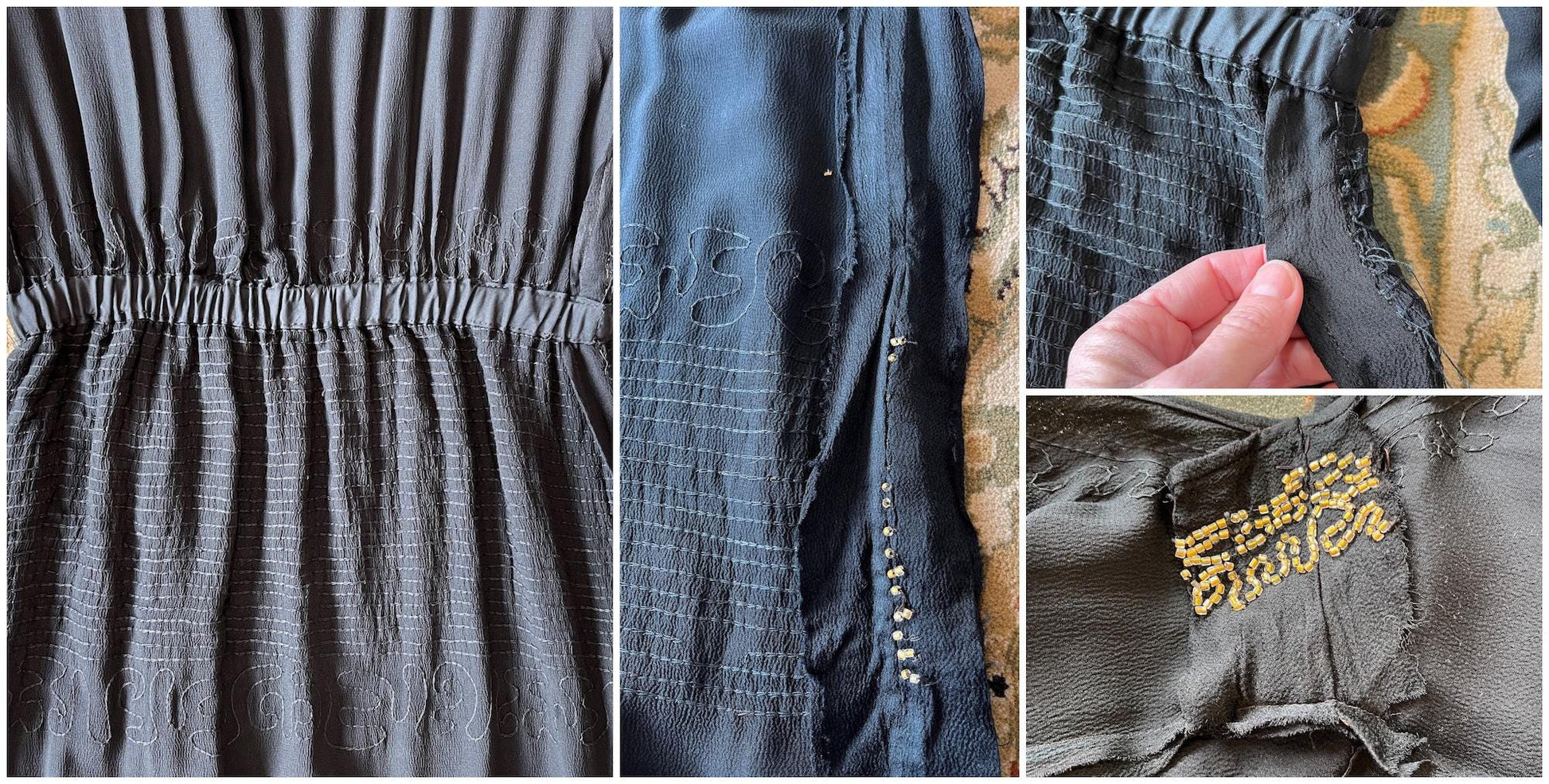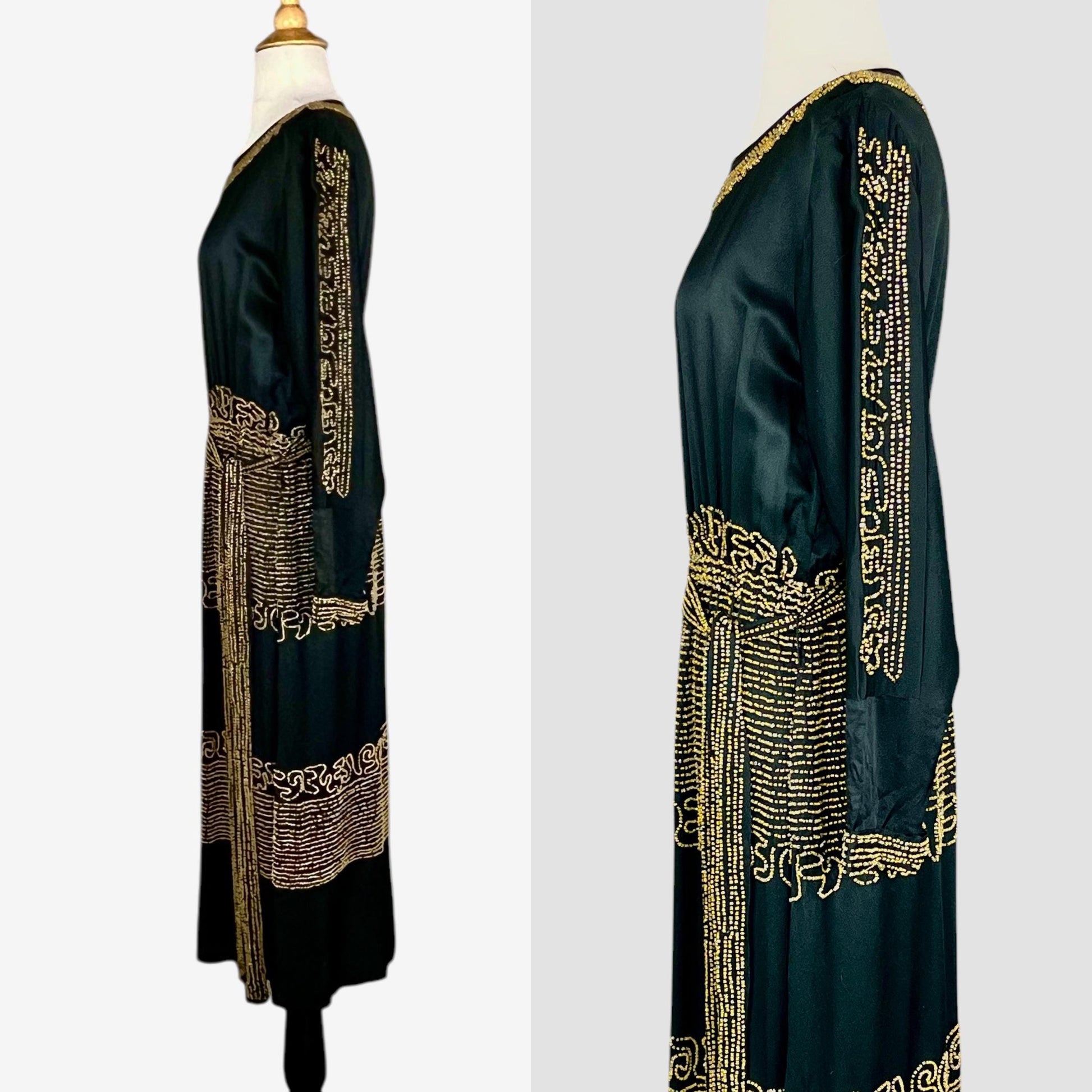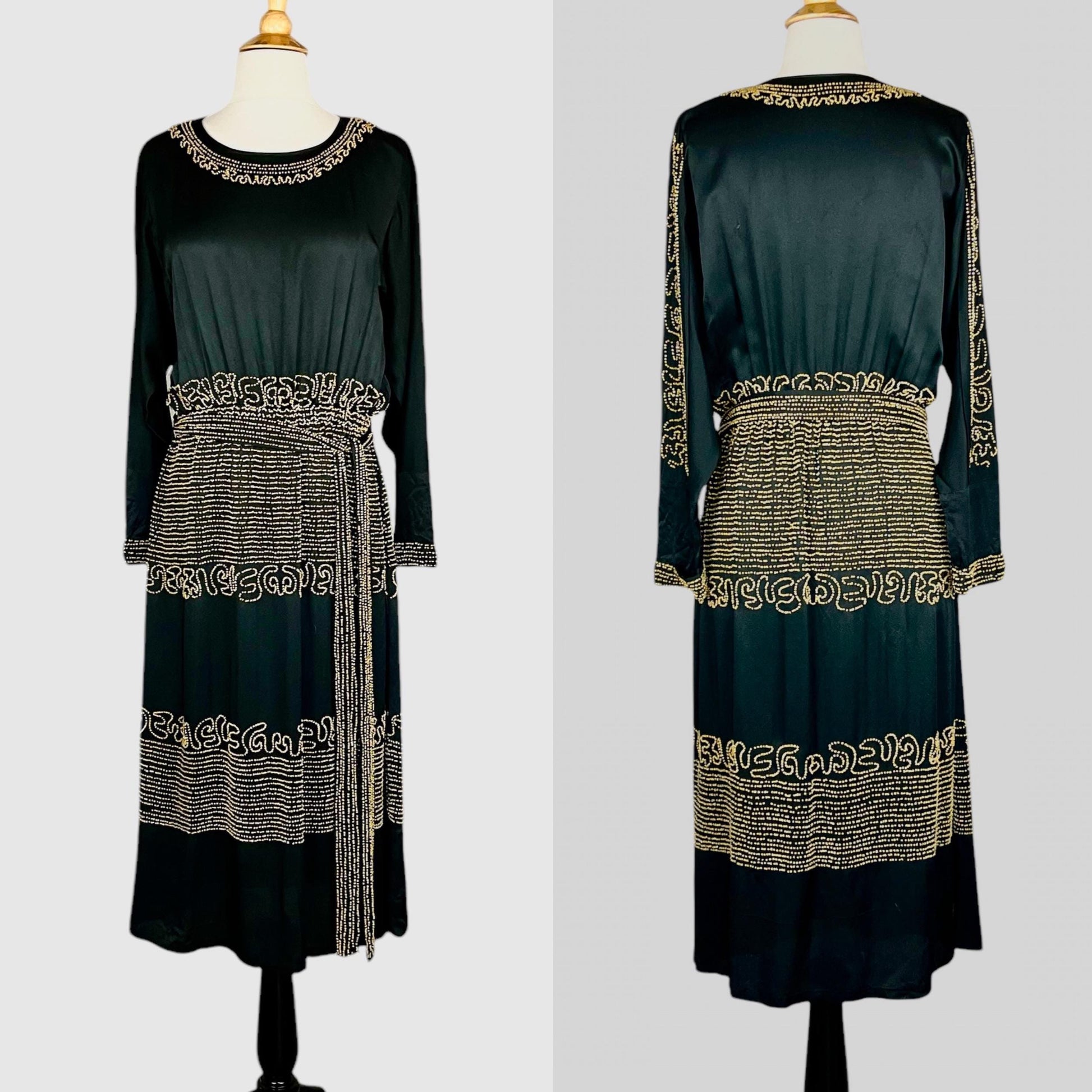 Vintage 1920s Black Silk Gold Beaded Dress with Belt, Art Deco 20s, S/M–M