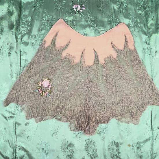 Rare vintage 1920s tap pants—also called step-ins—made of soft pale peachy-beige silk with breathtaking delicate lace. The lace is cut into wonderful pointed peaks that rise into the waist, creating that distinctive Art Deco silhouette. A highlight is the exquisite hand-worked ribbon-rosette appliqué on one leg—silken pink roses with tiny buds, soft green leaves, and hand-embroidered blue forget-me-nots worked in charming French knots. The tap pants are designed with a low waist and flared short legs finished in irregular scalloped points at the hem. Two hook/eyes and 1 snap at upper left side waist.