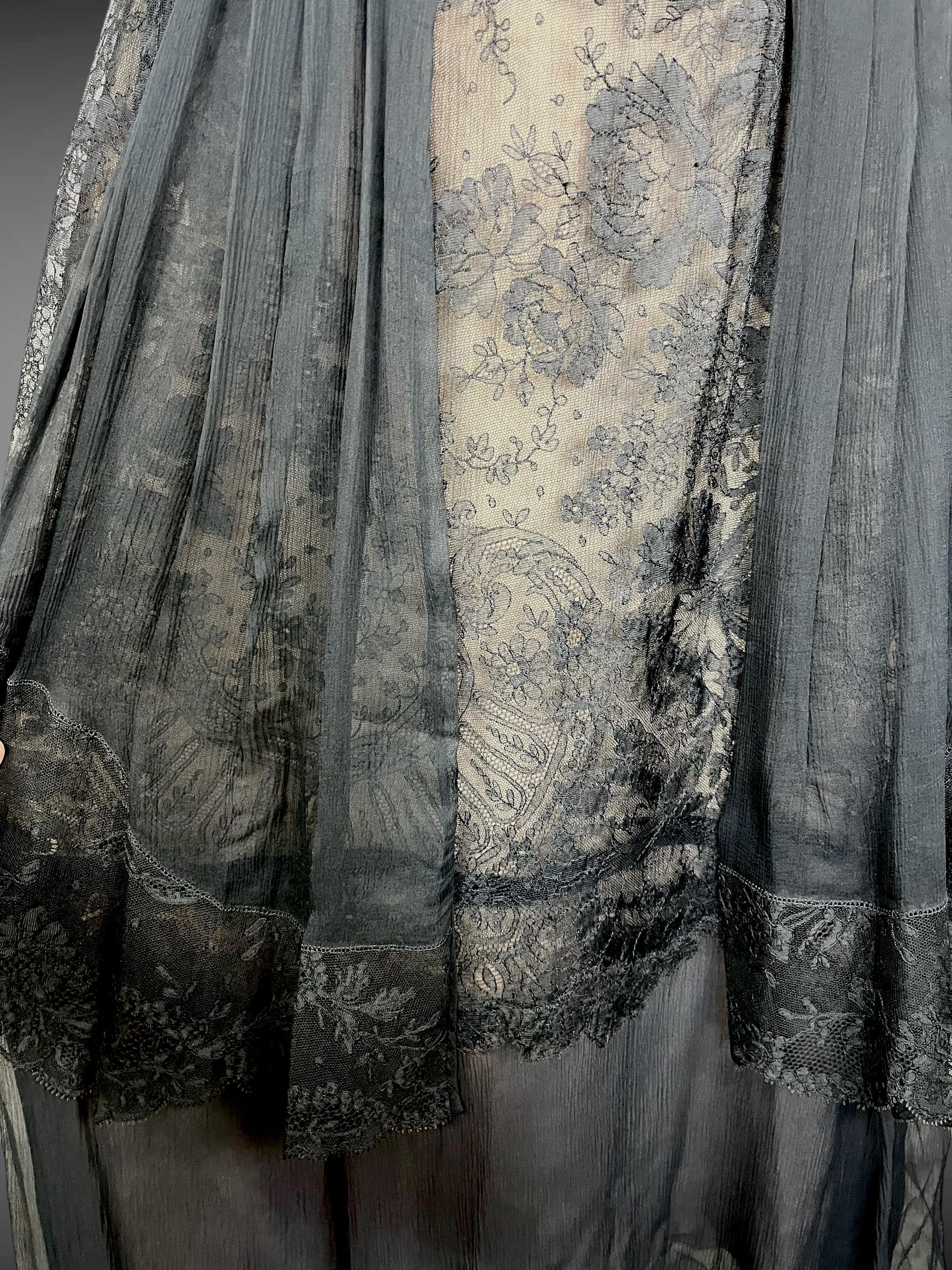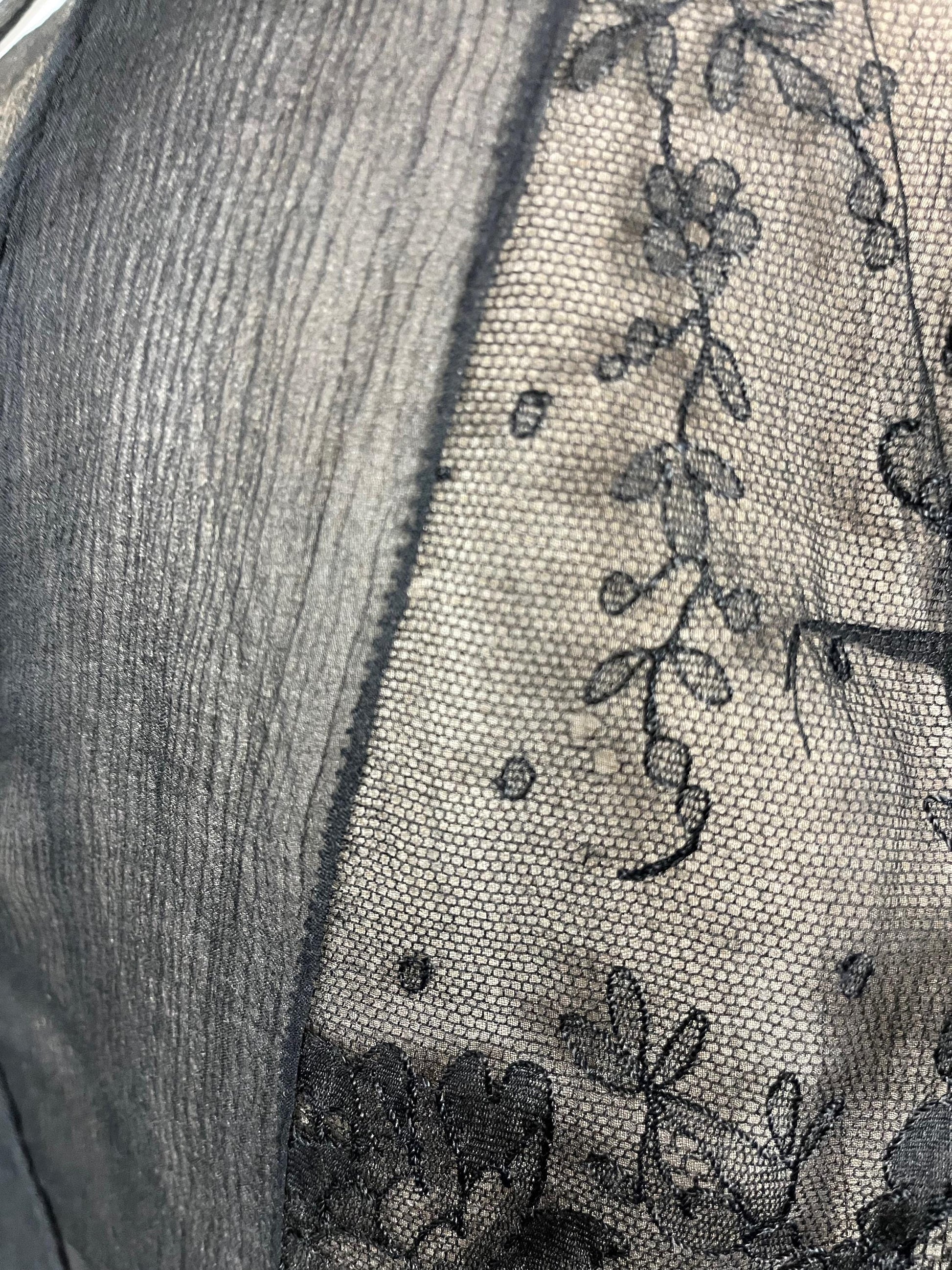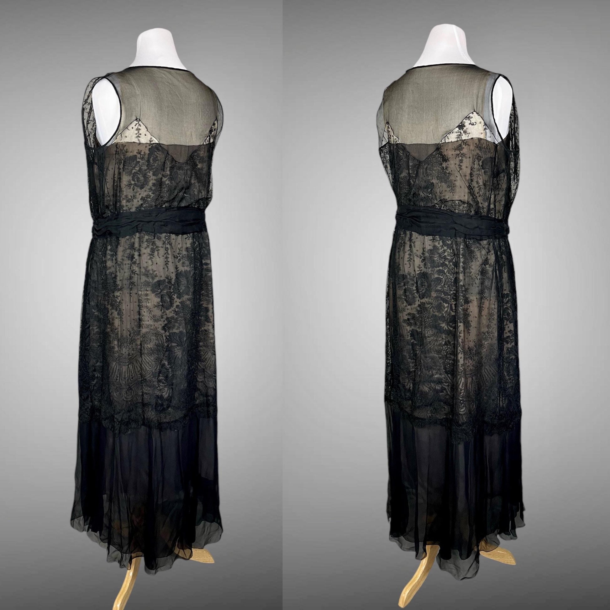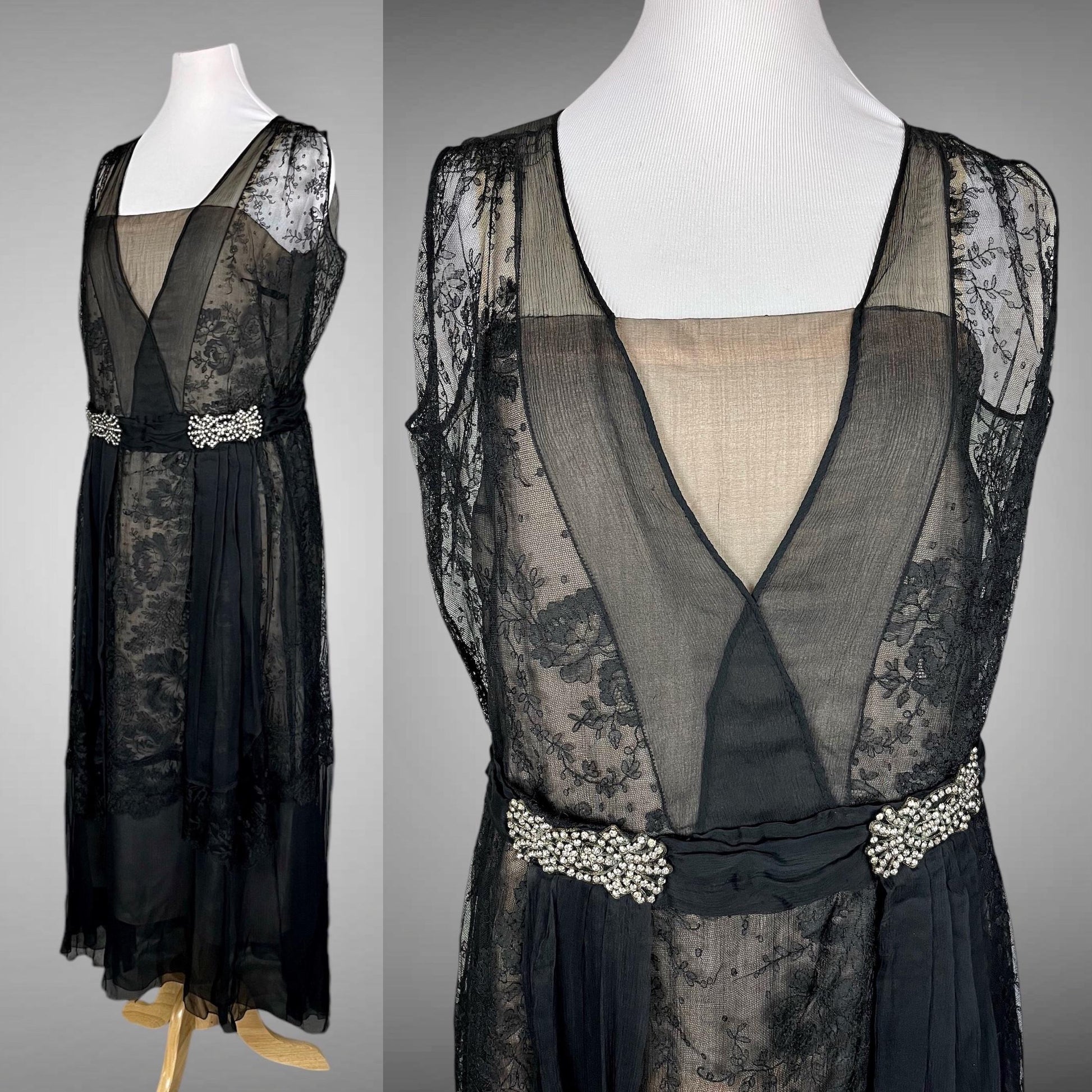 Gorgeous vintage 1930s black sheer silk chiffon and Chantilly lace evening dress in a larger size! Styled with a pale blush silk under slip overlaid with a fine layer of black silk chiffon and an outer criss-cross V neckline of silk chiffon and beautiful floral net Chantilly lace! A silk chiffon cummerbund encircles the waistline accented with two large ornate rhinestone embellishments from which gathered panels of chiffon and Chantilly lace extend down into the flowing asymmetrical skirt. I love how you can see the floral Chantilly lace design against the pale blush. No closures - you'll need to be able to pull this one on over your head.