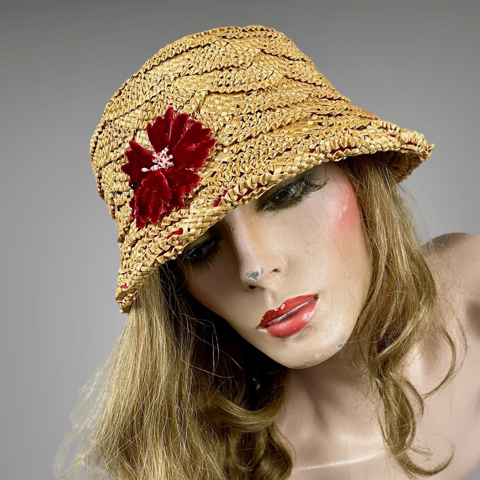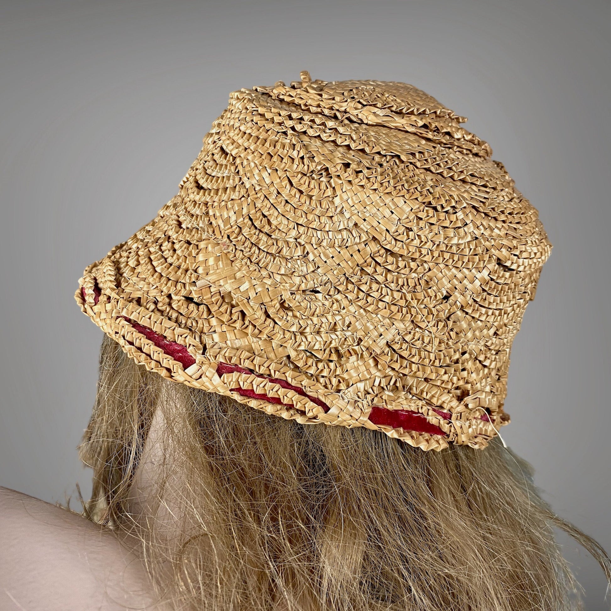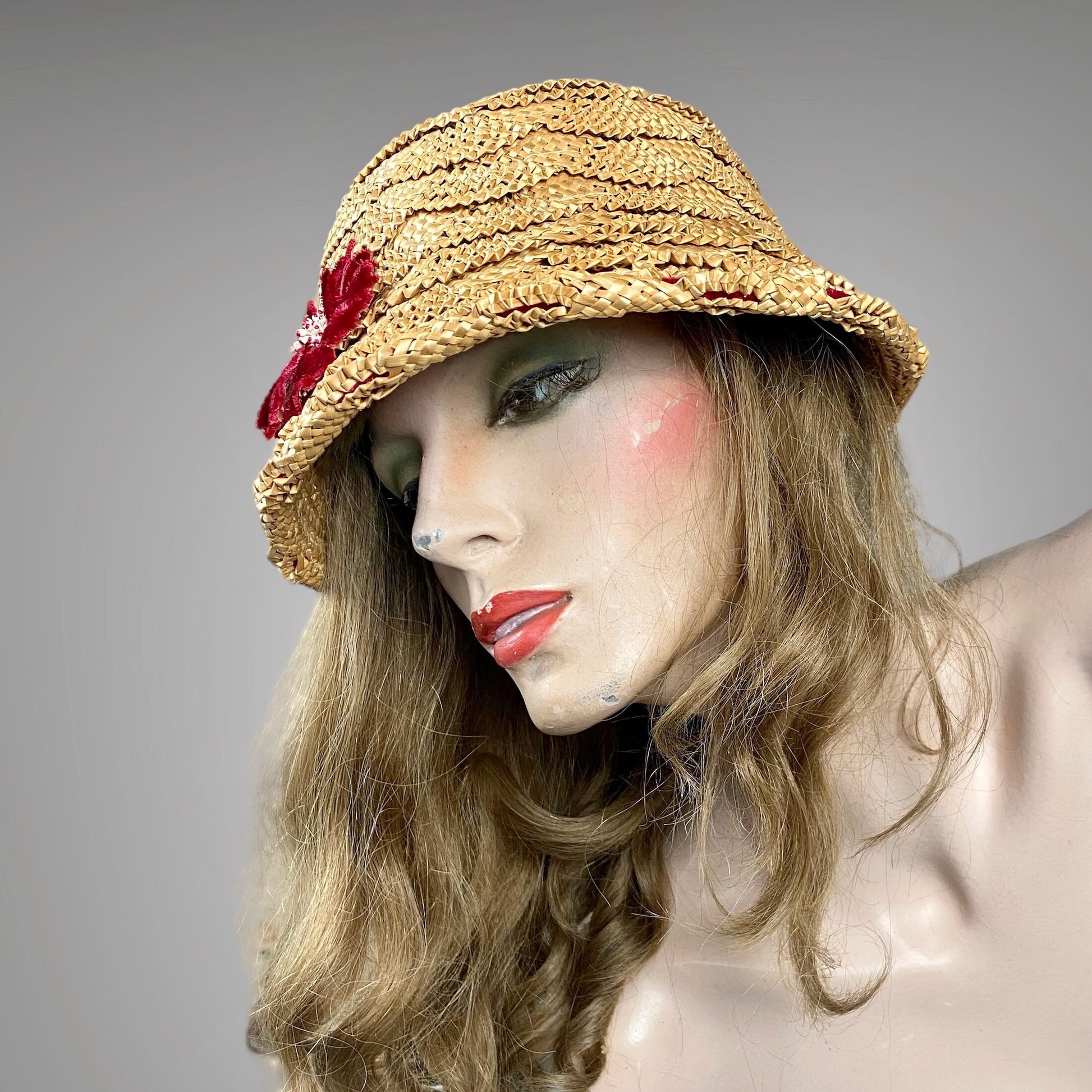Vintage 1930s Straw Cloche Bucket Hat with Red Velvet Trim