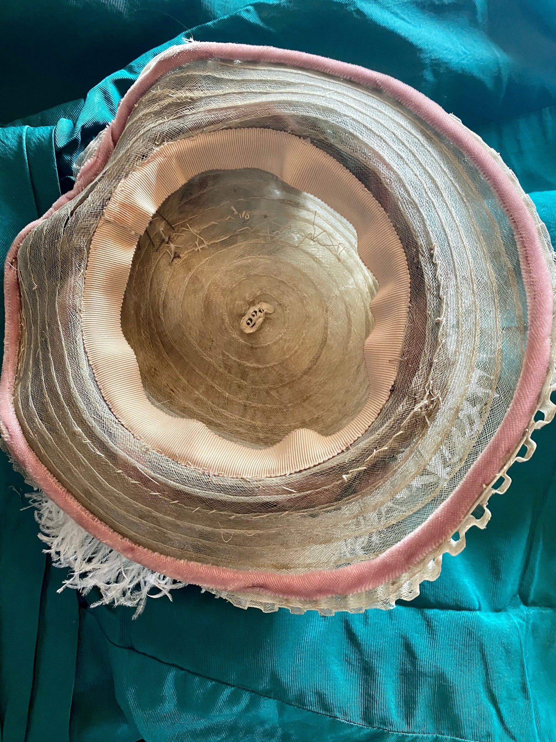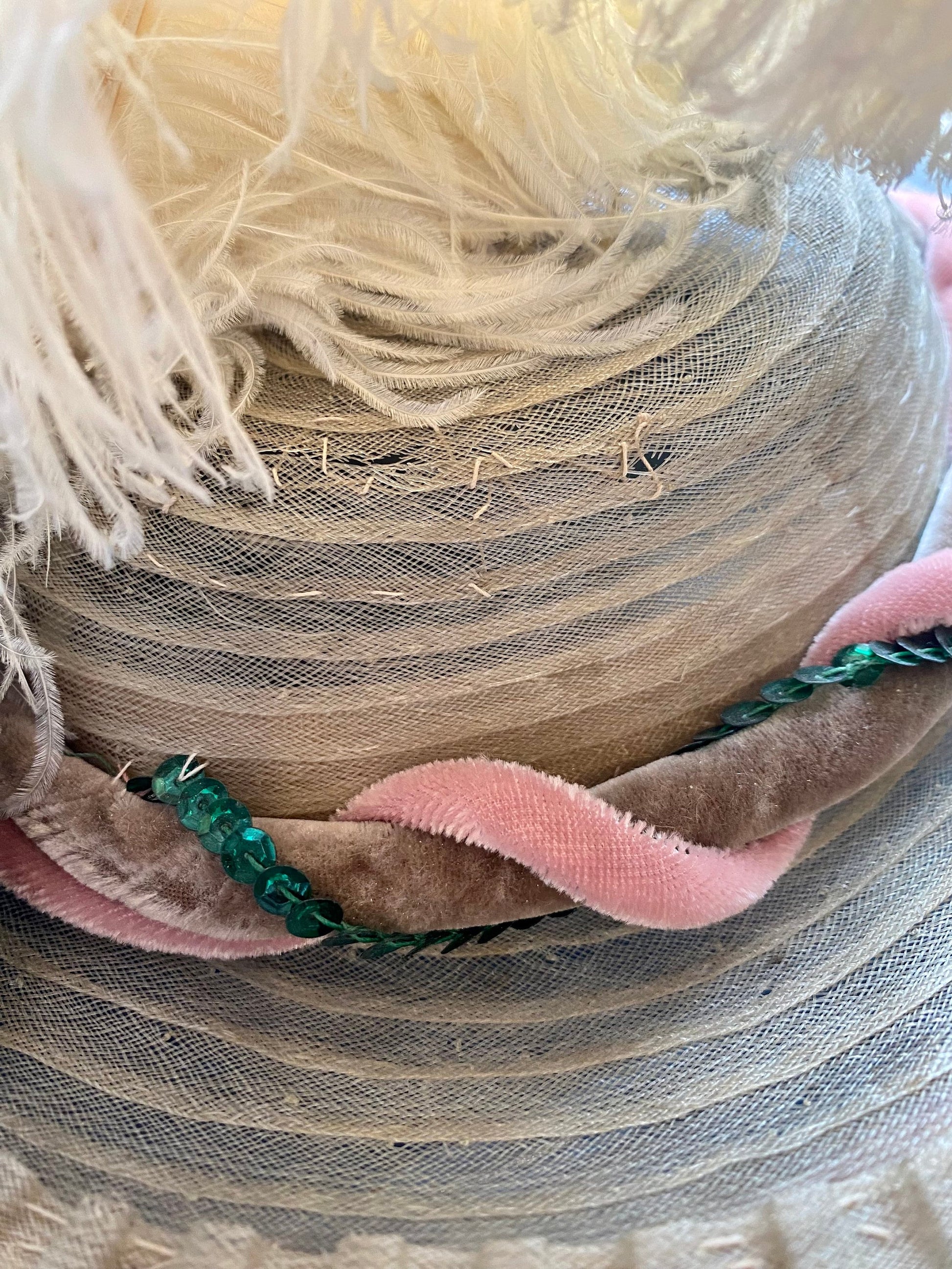 Condition: Good vintage condition. Feathers remain in excellent shape. Small stitched reinforcement is present at the upper right side of the crown, largely concealed by the feather arrangement. A small break to the horsehair is present along the back seam and is noted for transparency.