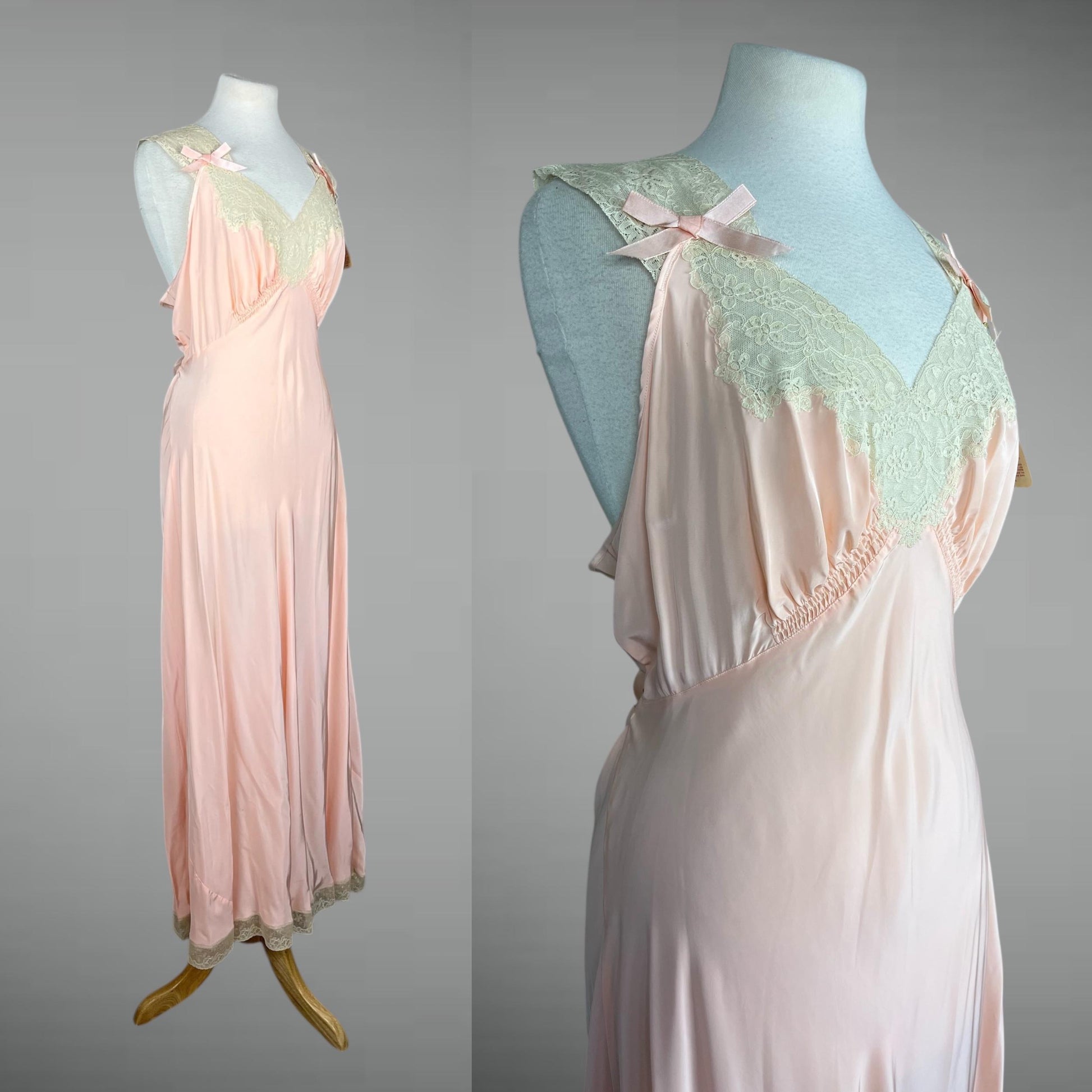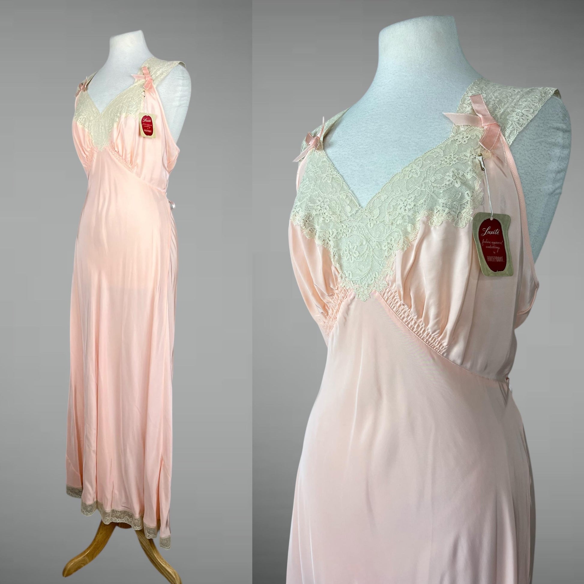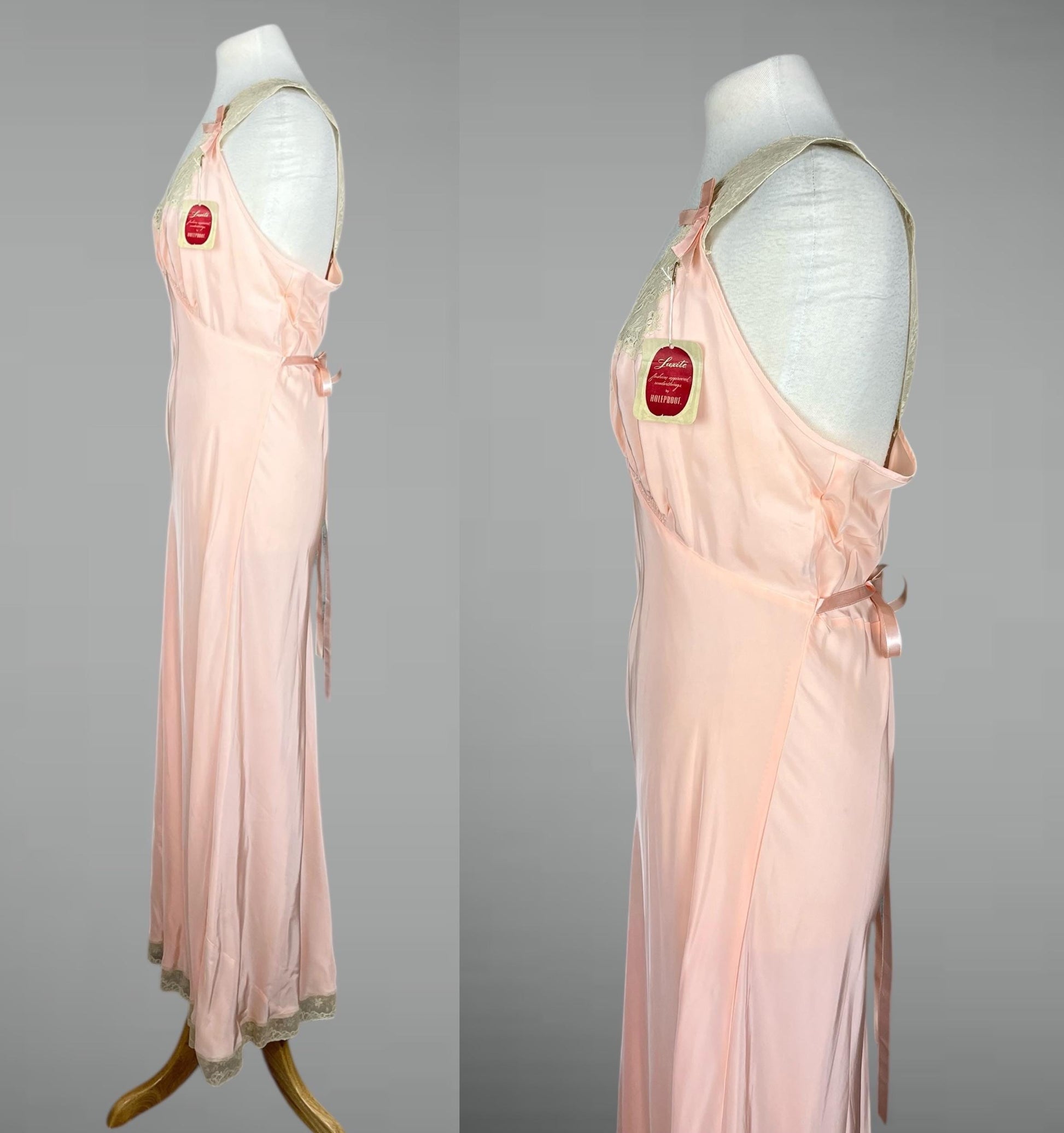 Beautiful vintage 1940s pink rayon satin nightgown by Luxite / Holeproof, featuring a soft liquid sheen and retaining its original paper tag. A dreamy and exceptionally flattering piece of mid-century lingerie, this gown is cut on the bias, allowing the fabric to skim and flow gracefully over the body — a silhouette rooted in late 1930s Art Deco design that carried beautifully into the 1940s.