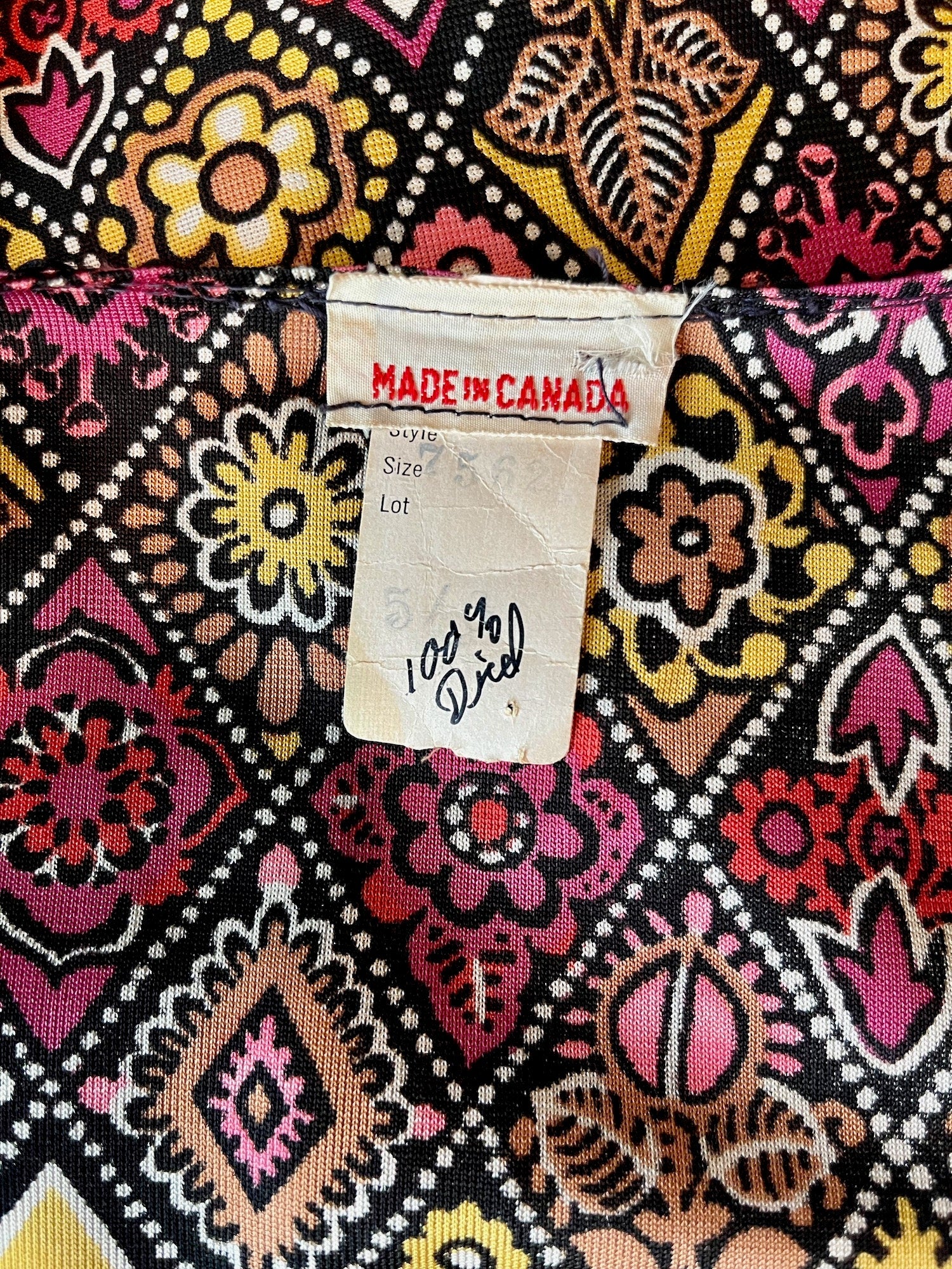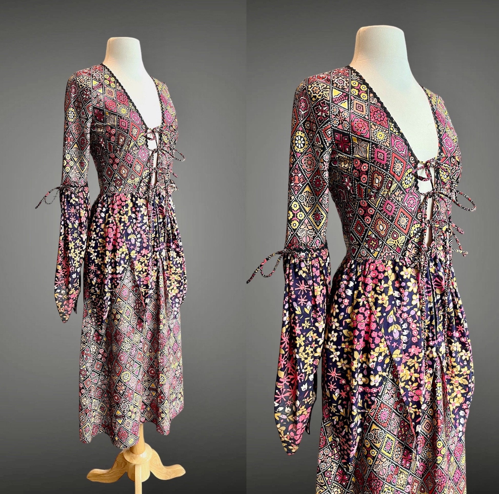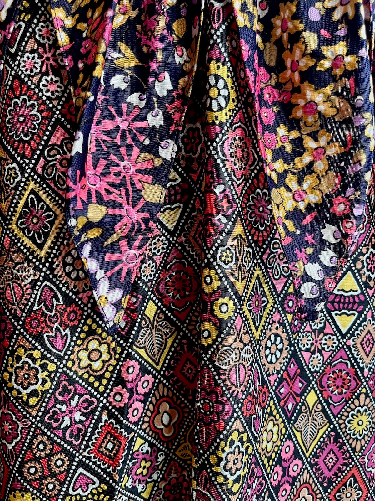 Insane vintage late 1960s flower power Woodstock dress featuring two different vibrant and eye-catching graphic floral prints! The perfect festival dress with a plunging V neckline that extends to the waist with three manual tie closures across the bust and a fourth tie closure at waist. Other features include a petal style peplum over skirt in a different floral print which also makes up the fantastic asymmetrical split petal sleeve hems. Black rickrack trims the plunging neckline. Nylon zip closure partially down center front skirt. I bought this dress from the original owner who purchased it in New York City in 1969.