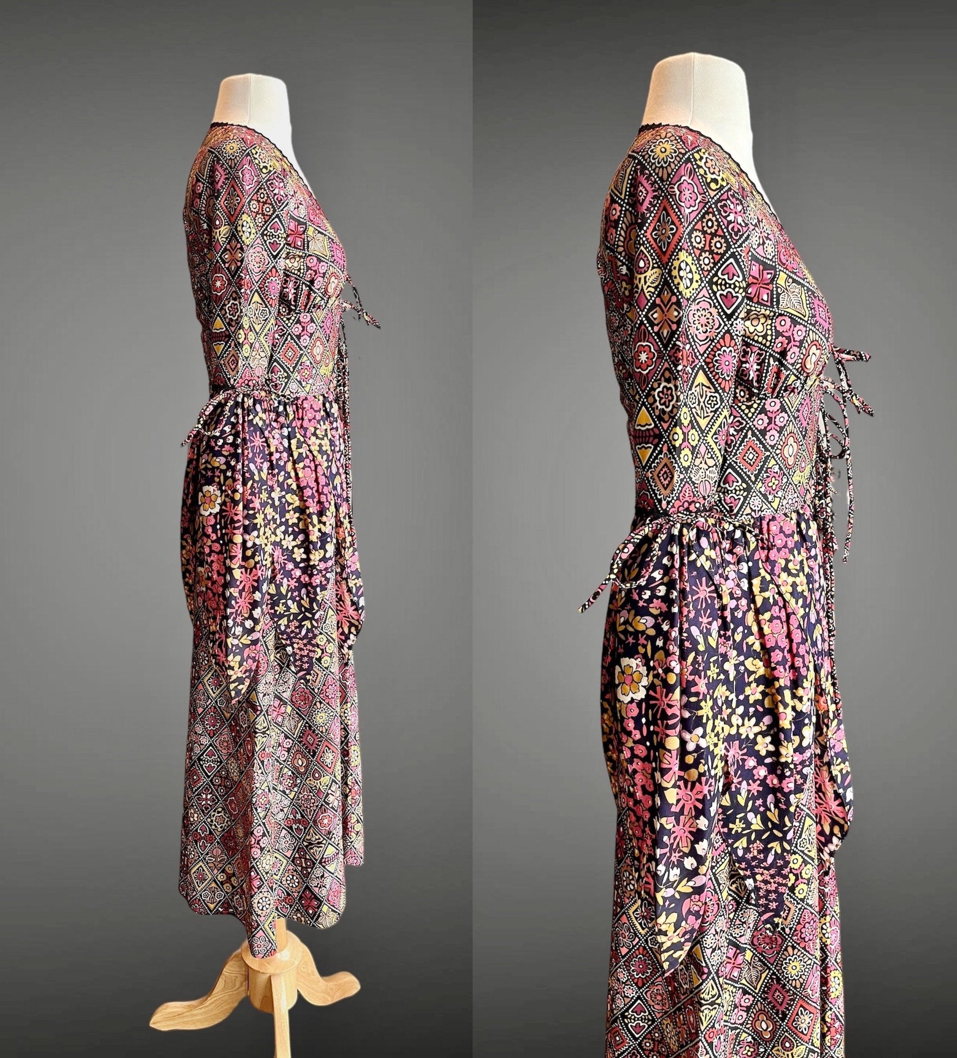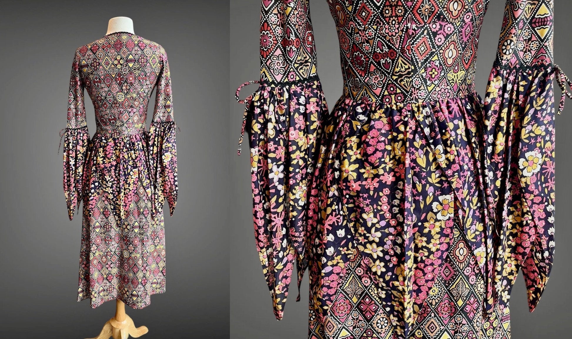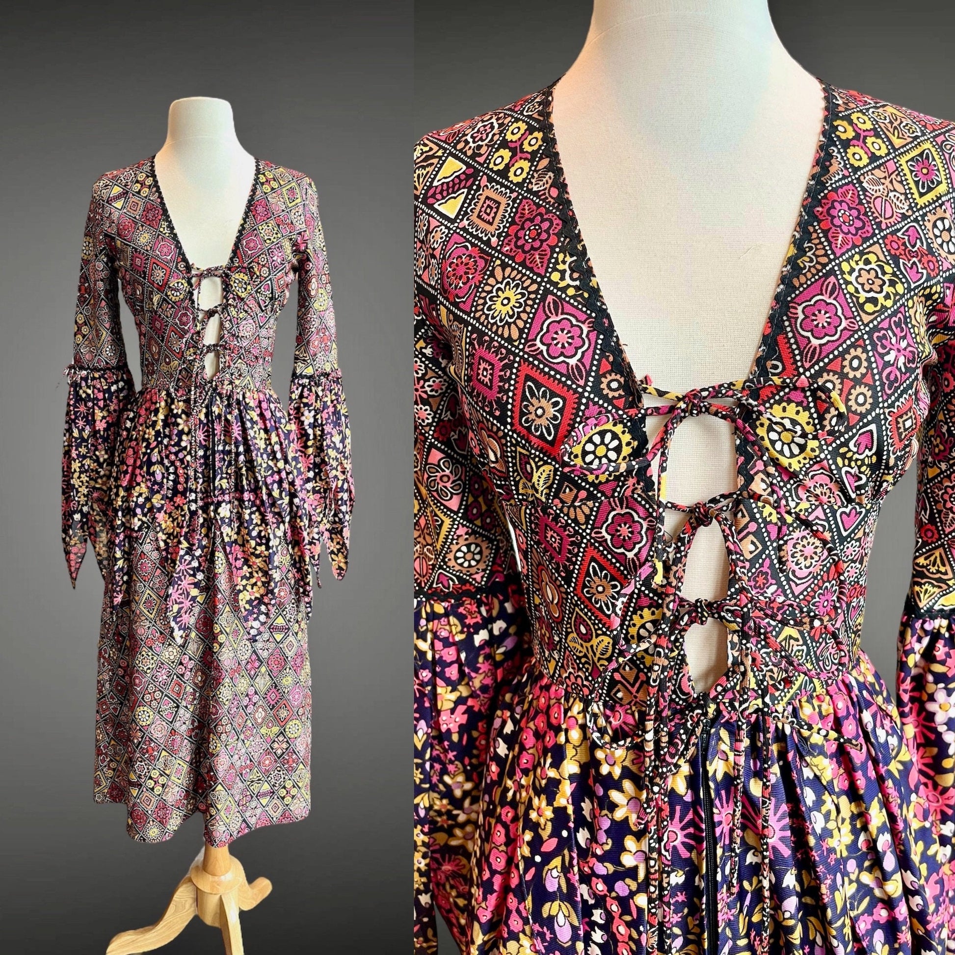 Vintage 1960s Floral Tie Plunging Neckline Woodstock Dress with Petal Sleeves & Peplum, XS