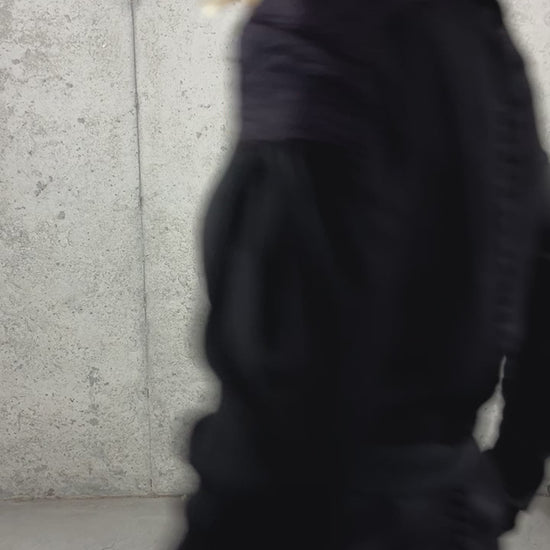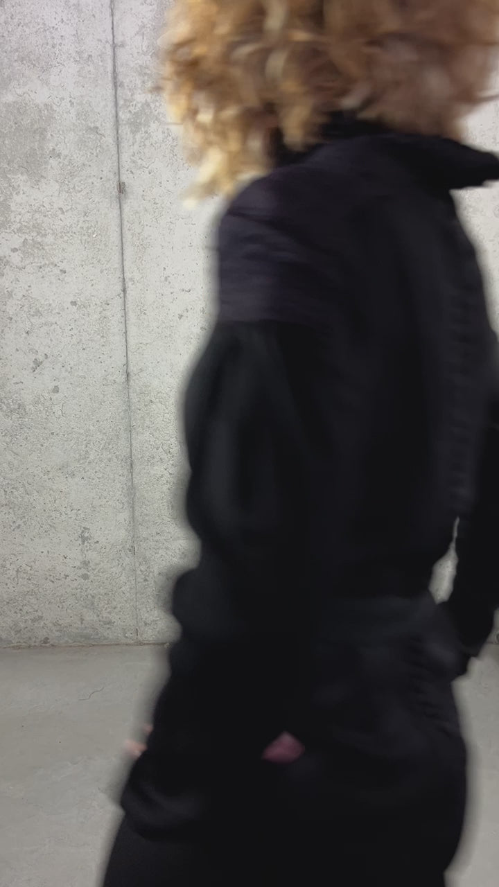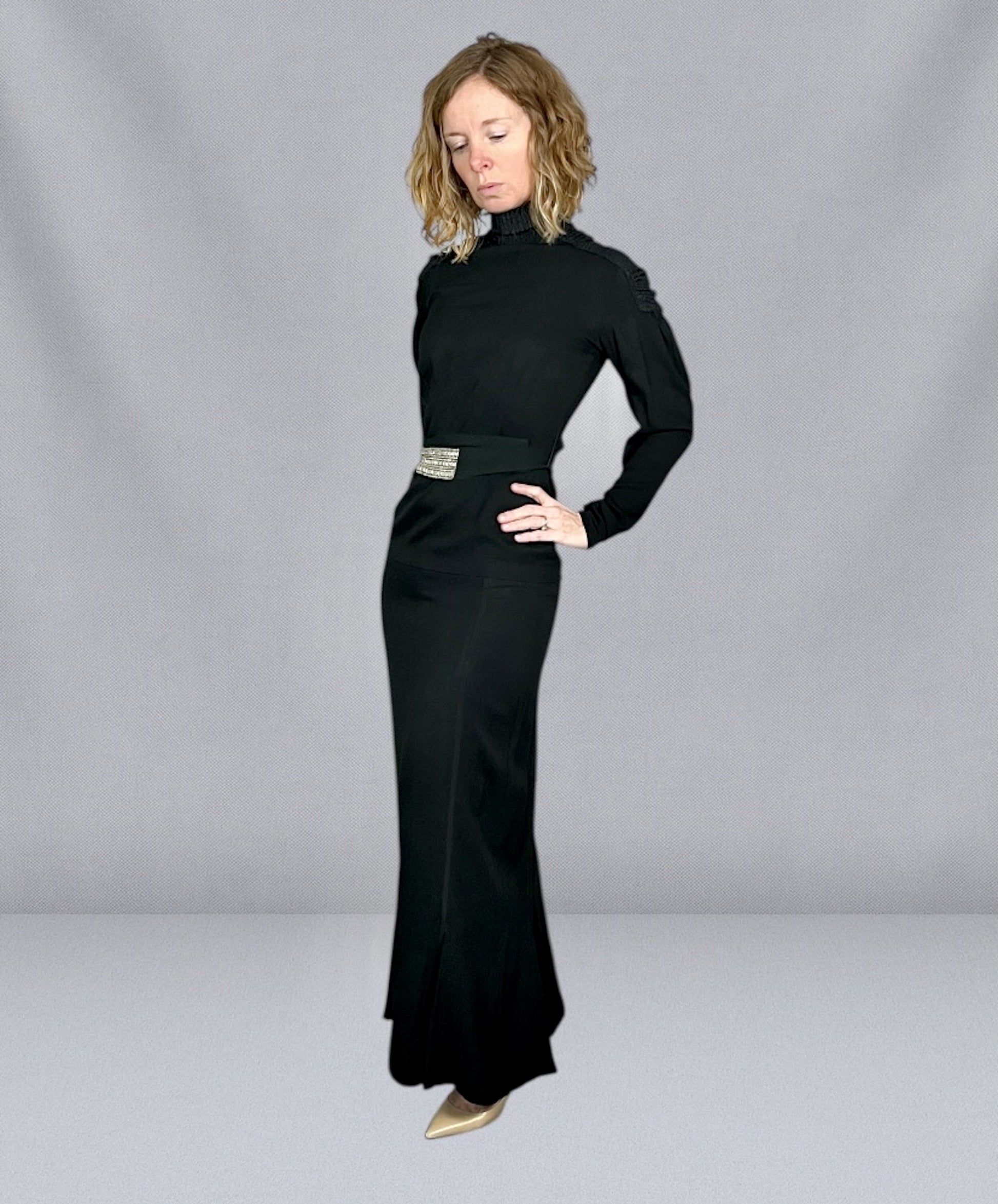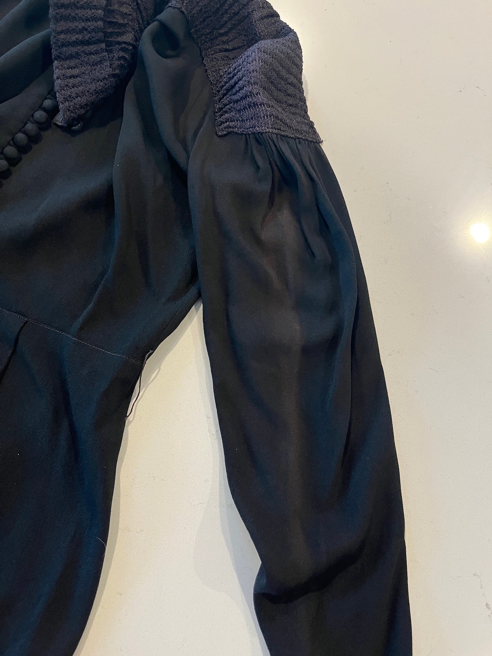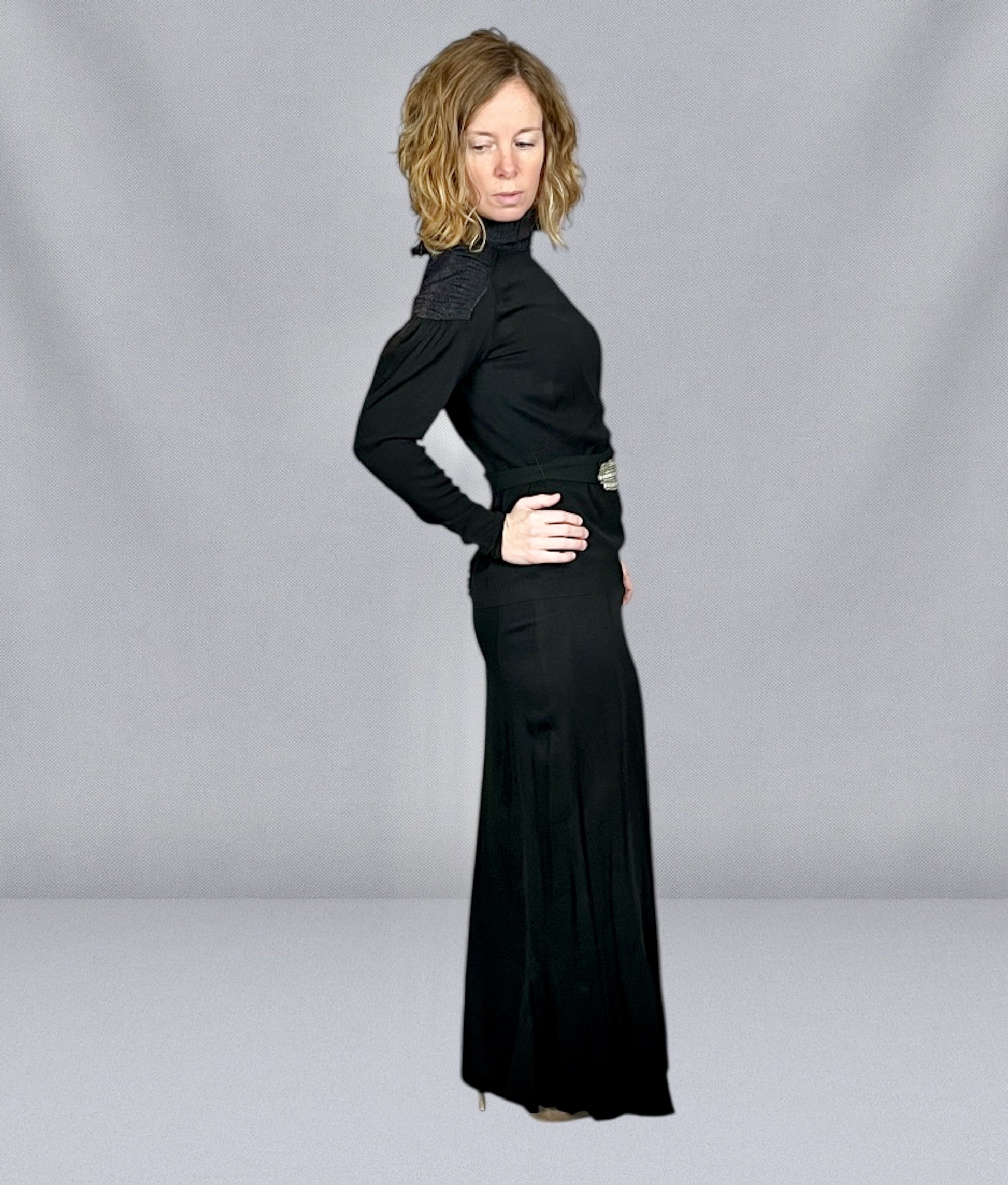 Fabulous late 1930s two-piece ensemble crafted in fluid black rayon with an elegant, body-skimming silhouette that hugs and moves beautifully on the figure. The blouse is especially special, featuring distinctive shirred rayon knit detailing at the shoulders and collar, creating a subtle sculptural effect that feels very fashion-forward for the late 1930s. The neckline sits high but relaxed and flattering Art Deco–influenced seam-work shapes the bodice. The back of the blouse fastens with a full run of covered buttons and loops.