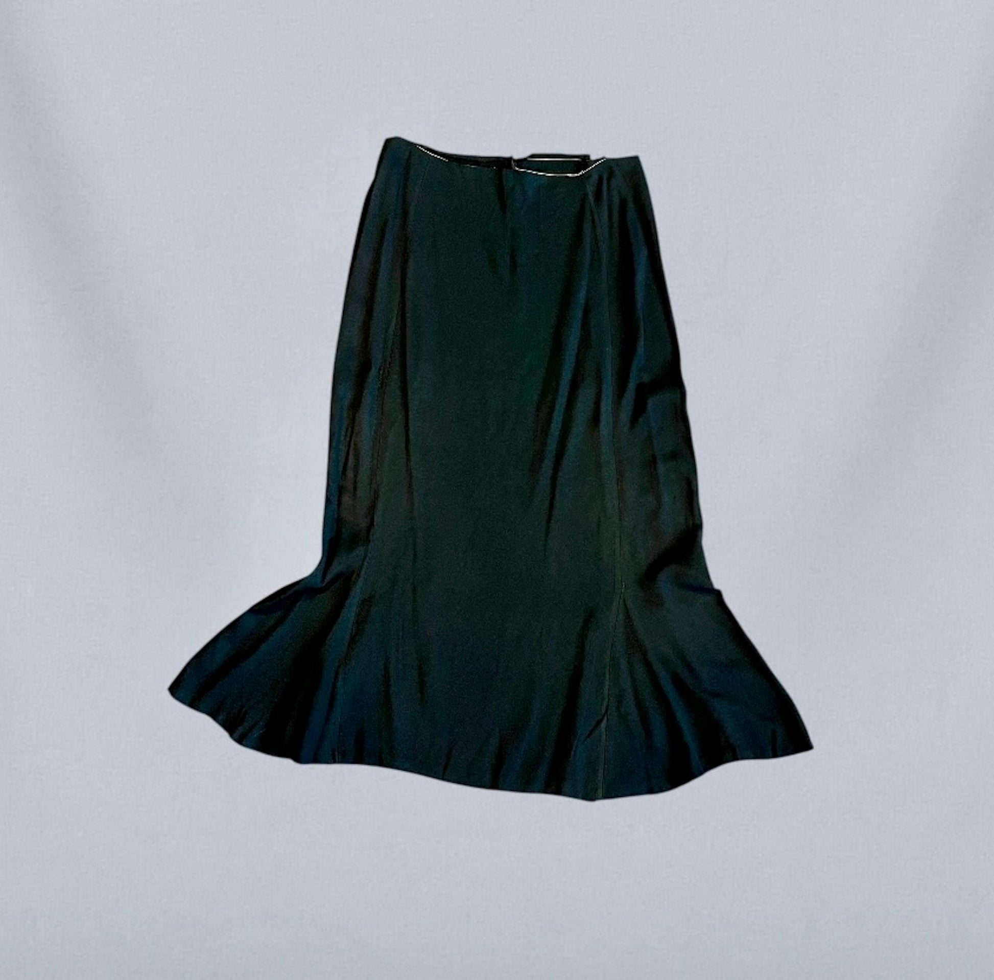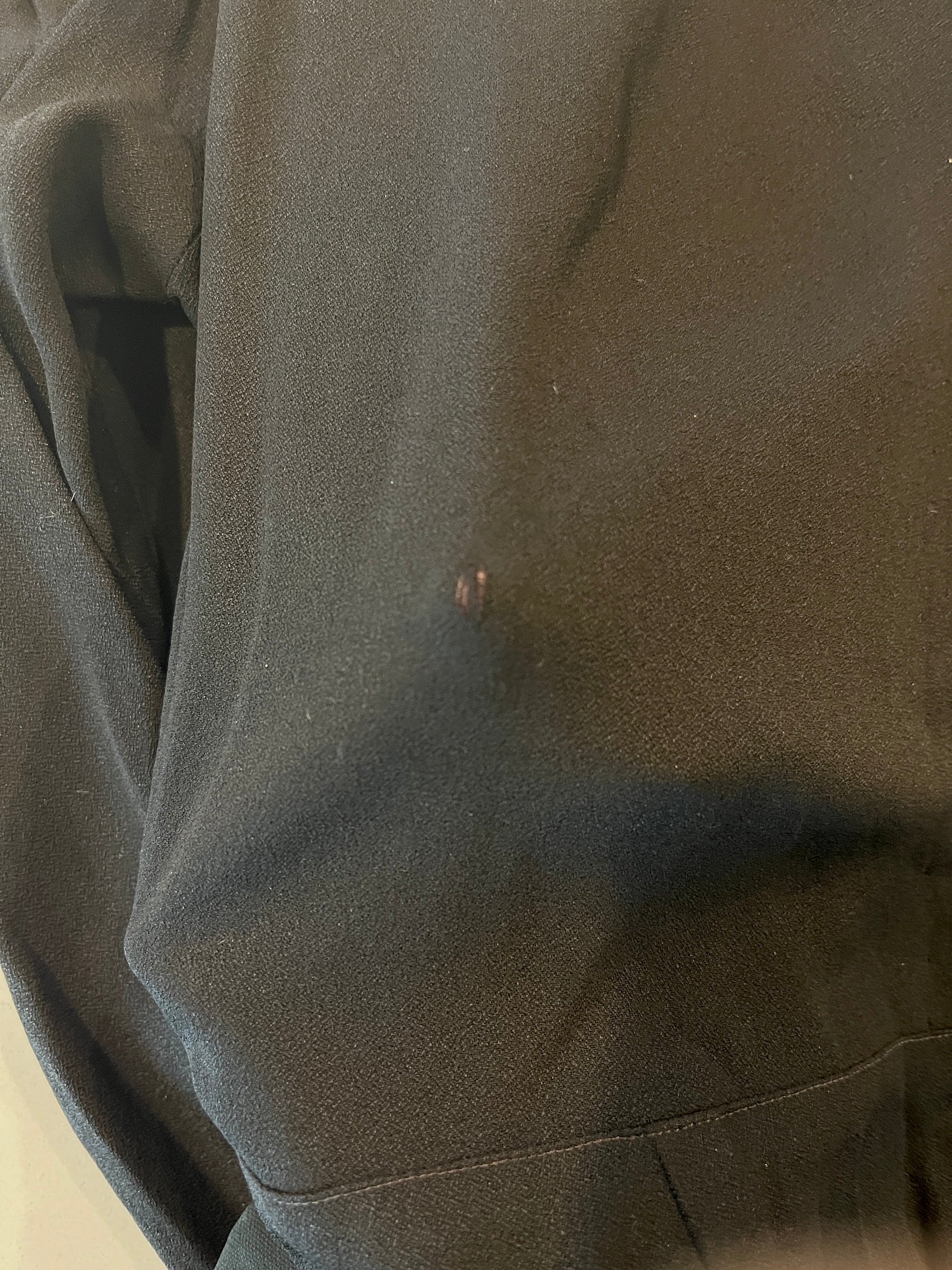 Condition: Very good overall. The back right sleeve shows areas of sun-related fading, resulting in gentle tonal variation to the black rayon. A small number of the original fabric-covered buttons (five total) show visible wear to the fabric covering, and there is a tiny vertical slit at the back of the blouse. The skirt is clean and well preserved; at the waistband, small areas of light-colored original stitching are visible along the top edge. Minor missing stitches at the waist seam have been discreetly stabilized. All issues are cosmetic, age-related details consistent with period wear and do not affect structure or wearability.