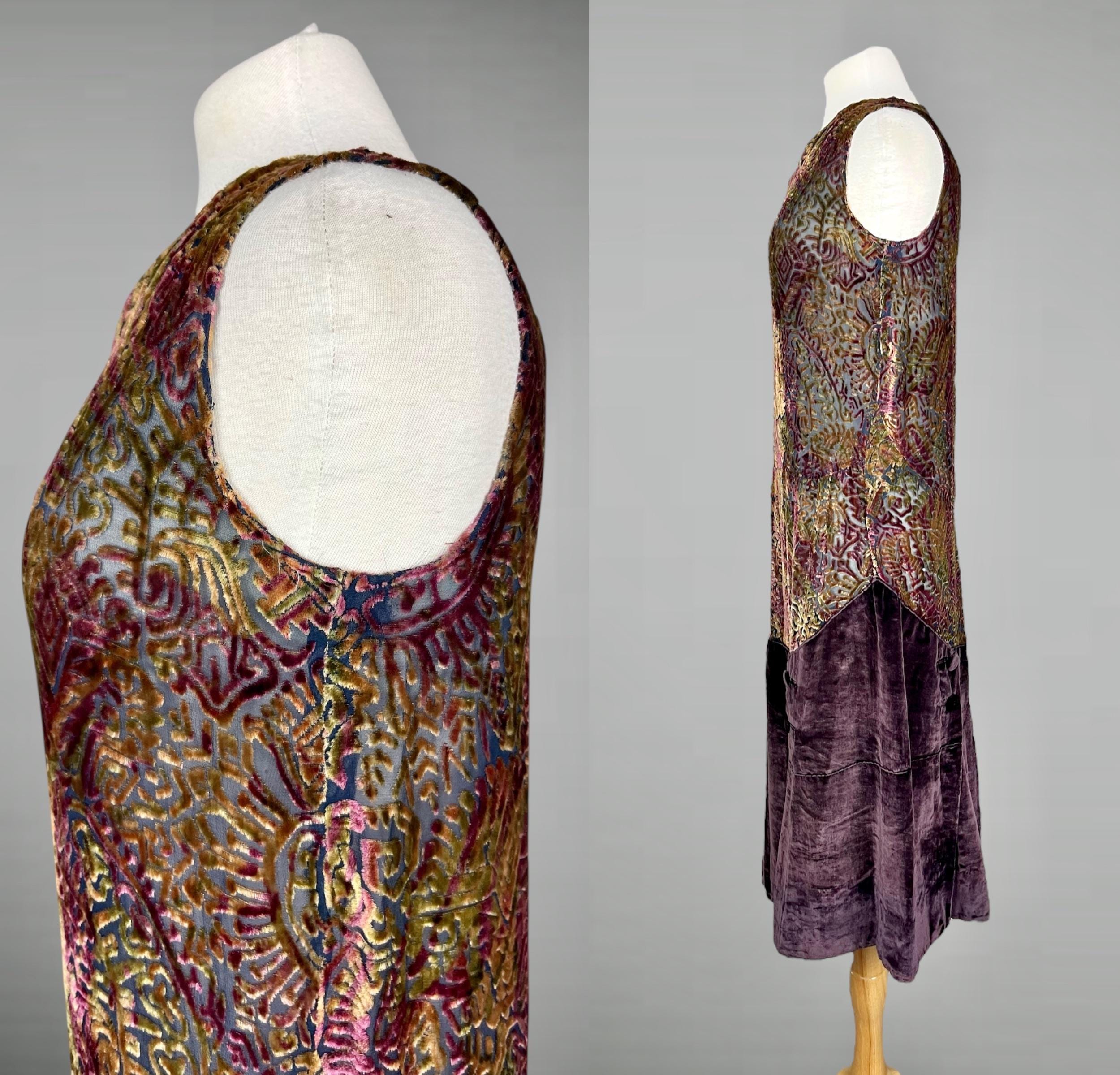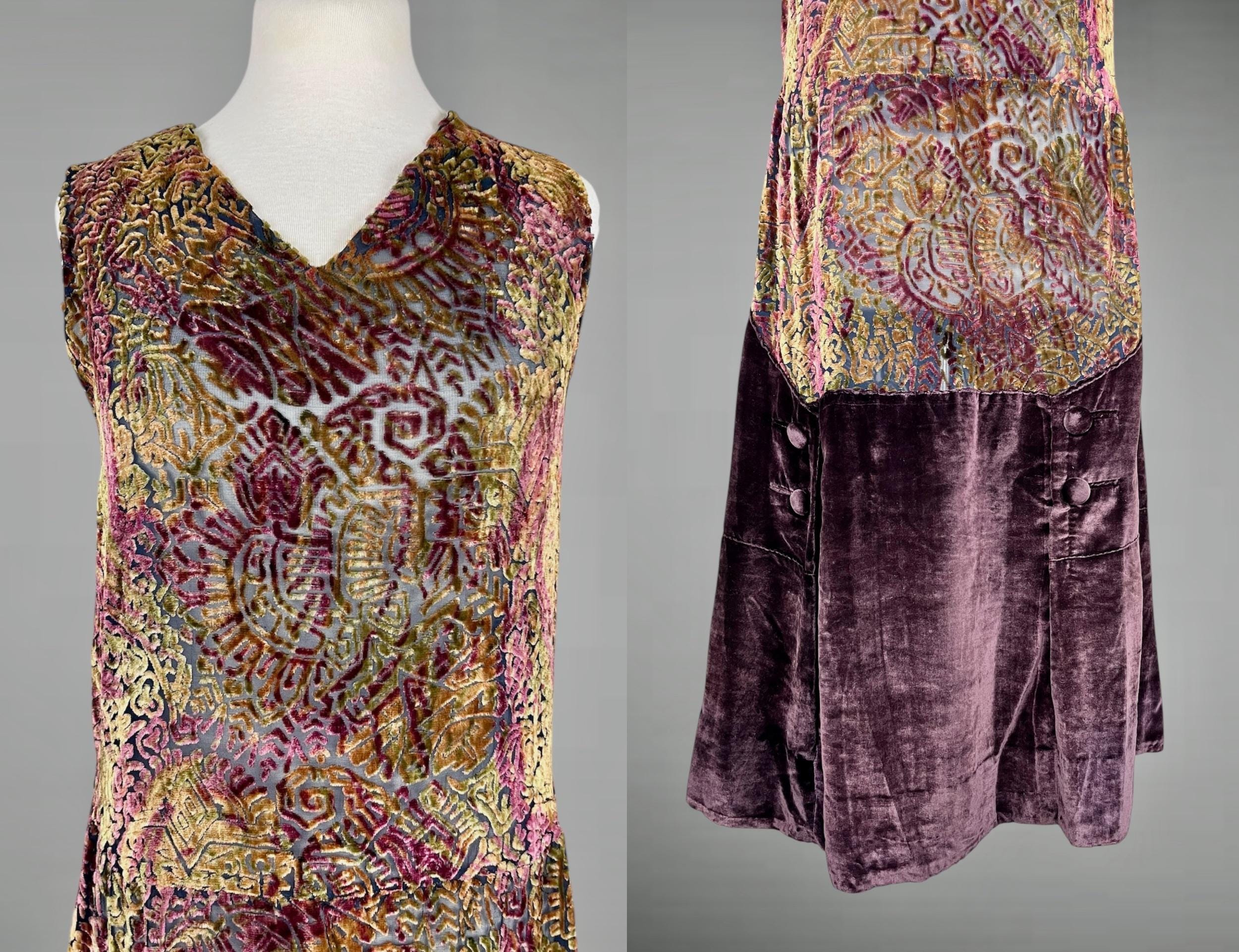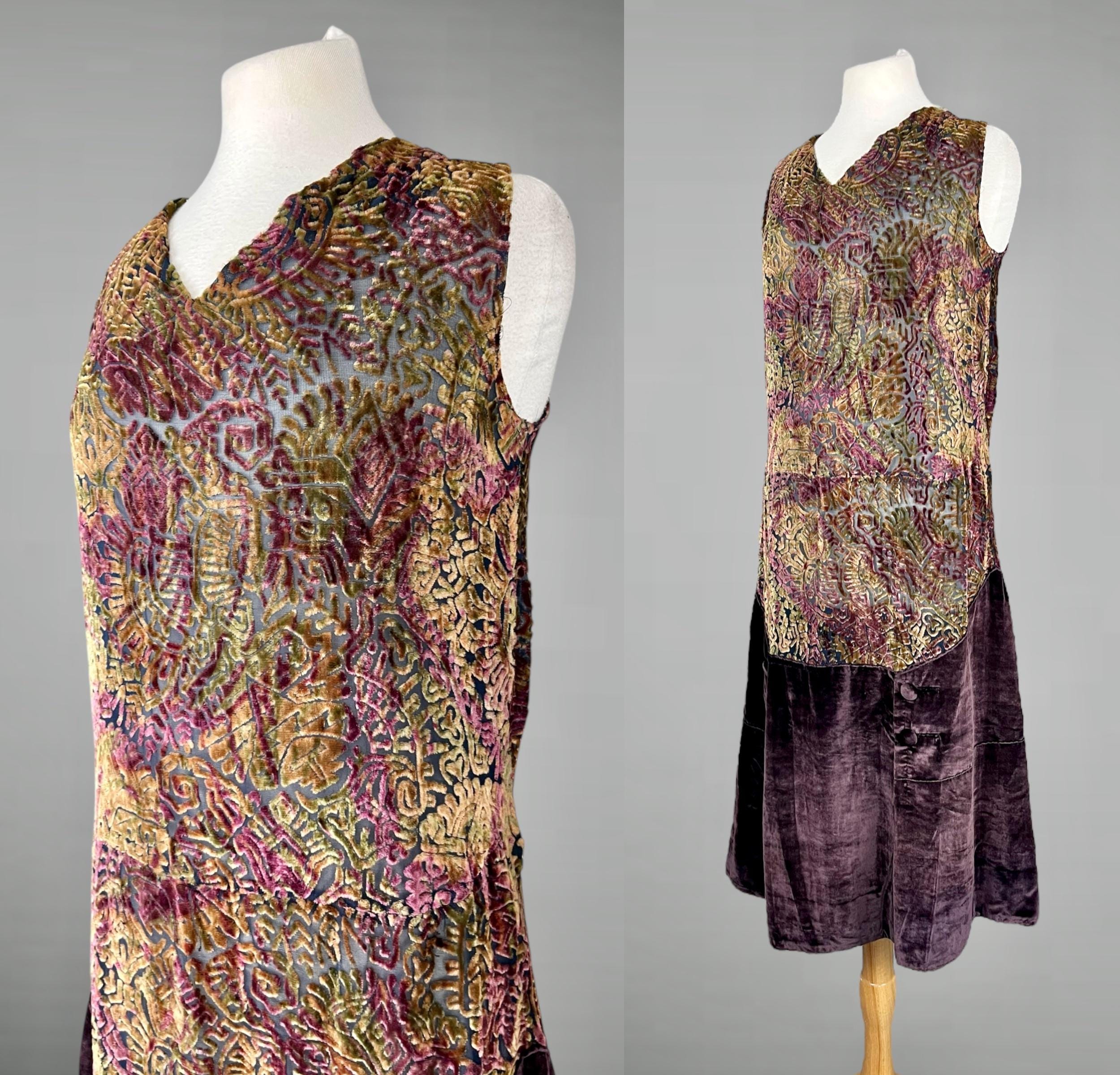 Museum quality original vintage 1920s burnout silk velvet dress in a dreamy jewel-toned palette! The sleeveless bodice is cut in a relaxed straight silhouette with a soft V-neckline and low hip seam that gives it that iconic drop-waist flapper shape. The burnout velvet—sometimes called devoré—is especially striking: a luminous design in raspberry-plum, olive, and soft golden ochre against a dark navy ground. I adore the Art Deco motif that dances across the fabric. The skirt is fashioned from a coordinating plush silk velvet in a rich plum hue, with soft pleats and covered button accents. No closures - you’ll need to be able to pull this on over your head.