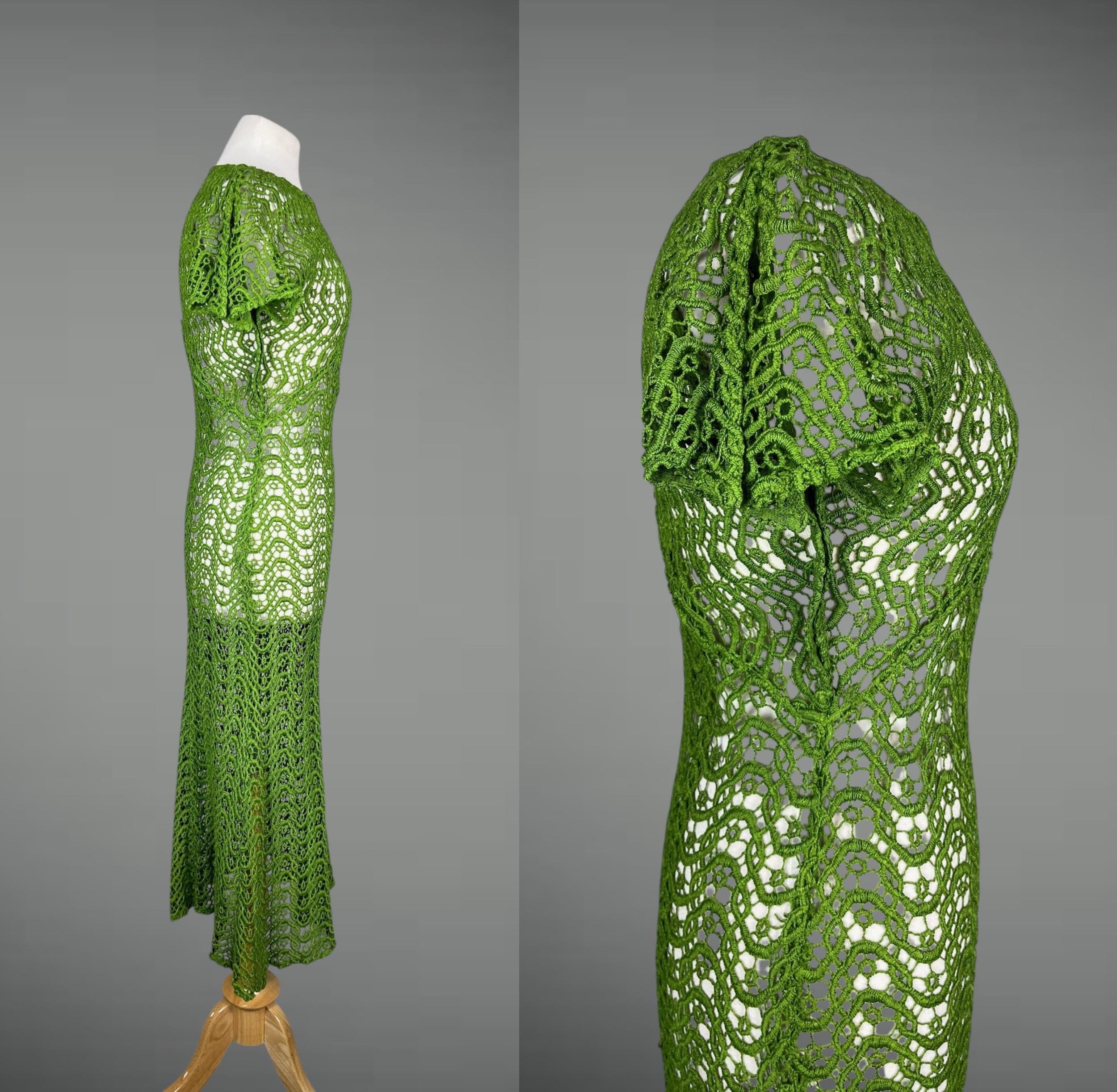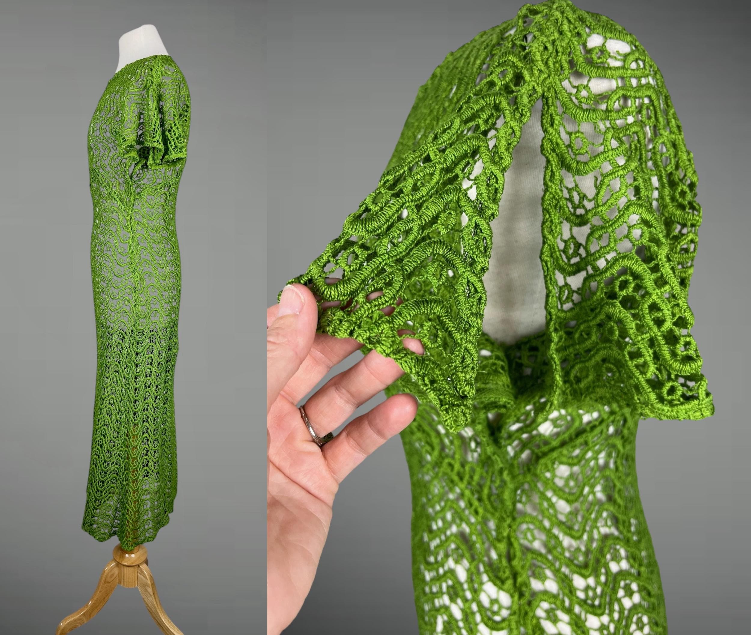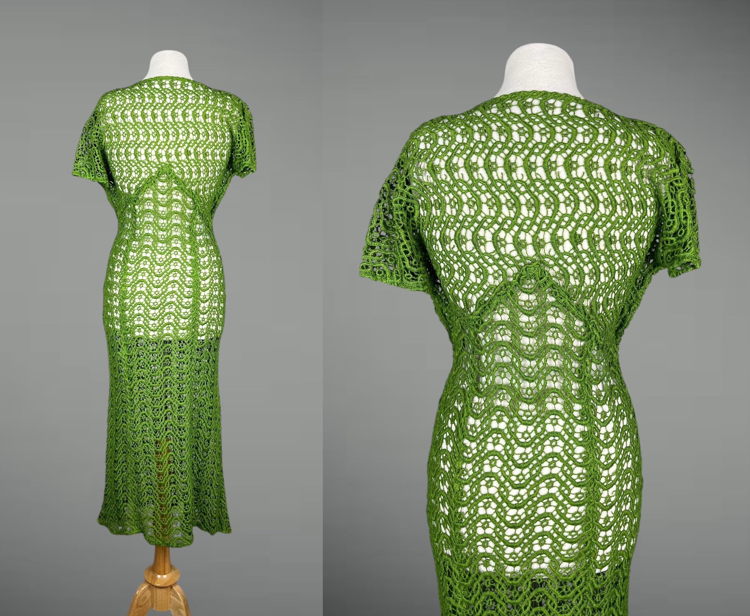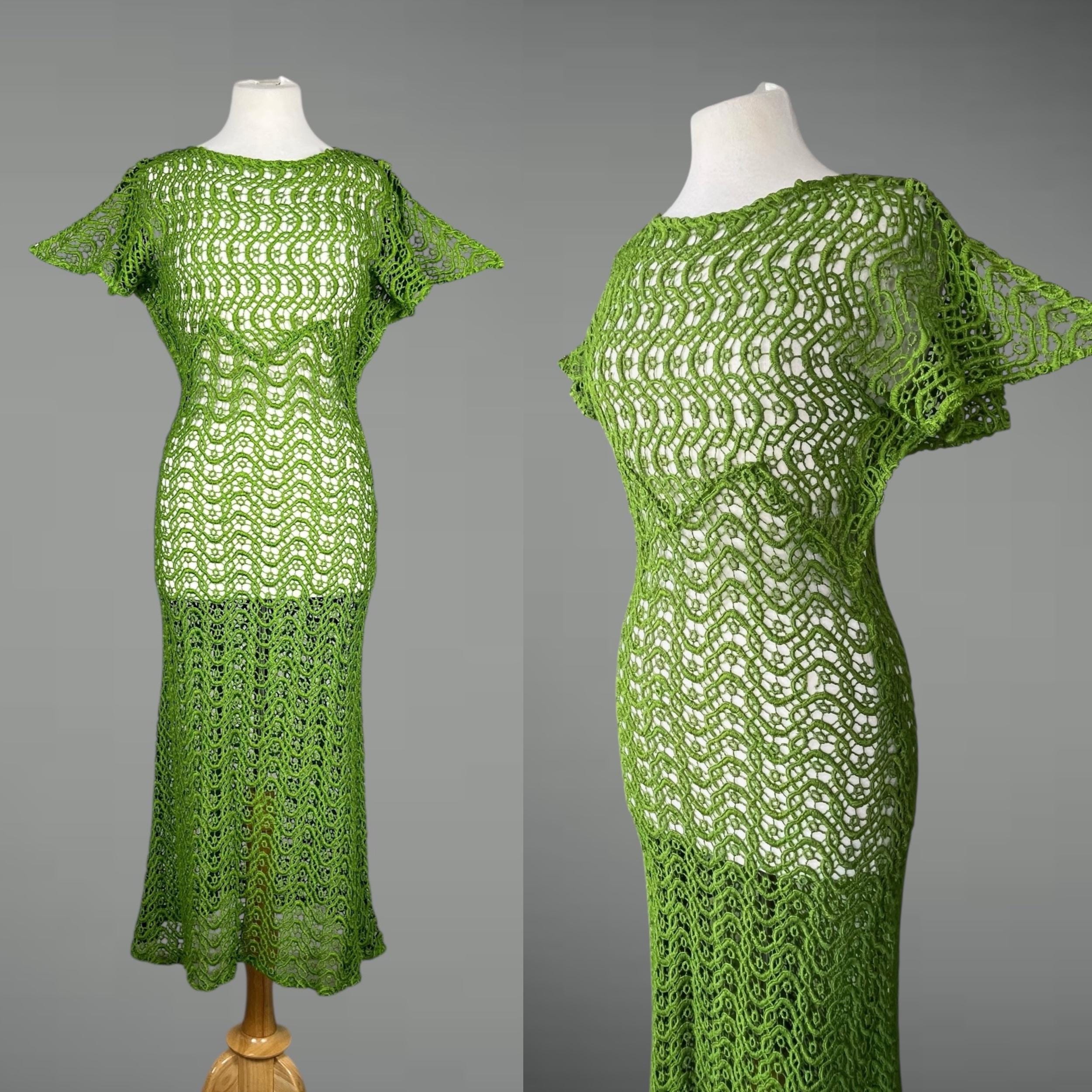 Eye-catching vintage 1930s cotton crochet dress in a vibrant, crisp apple-green hue! This piece originally came to me in a pale yellow palette with white-faded areas; I transformed it using RIT dye and a dye fixative to achieve this fantastic fresh color. Crafted in a beautifully hand-worked open-wave pattern, the dress skims the figure in that coveted Deco-era, bias-cut silhouette — gently fitted through the torso with a graceful flare at the hem. The short flutter sleeves, with subtle “cold-shoulder-esque” split sides, and the soft round neckline flatter the shoulders. The dress fastens with four snaps up from left waist to underarm / sleeve hem. Unlined, allowing you to style it with your choice of slip for daytime wear or a more dramatic layer for evening.