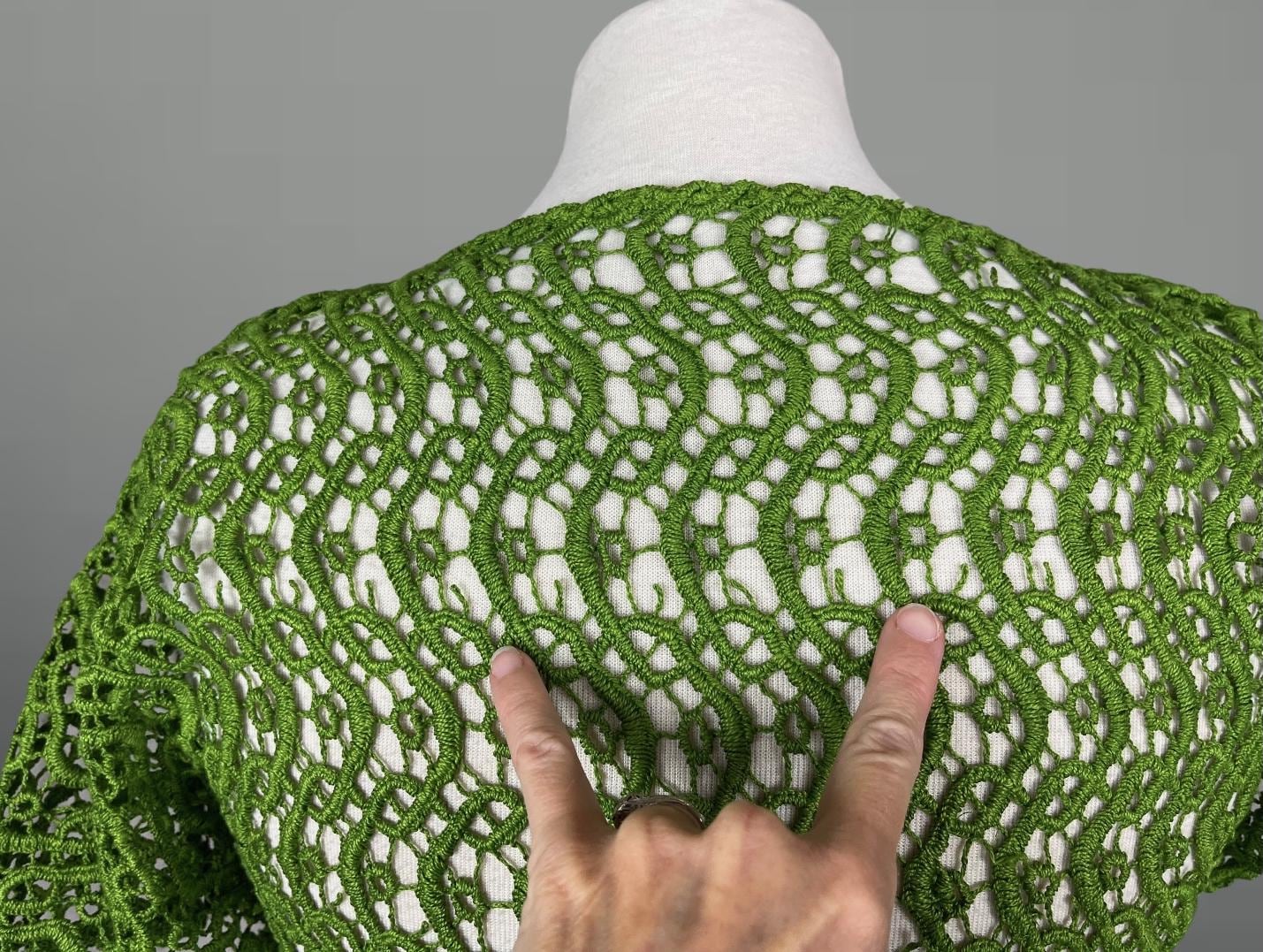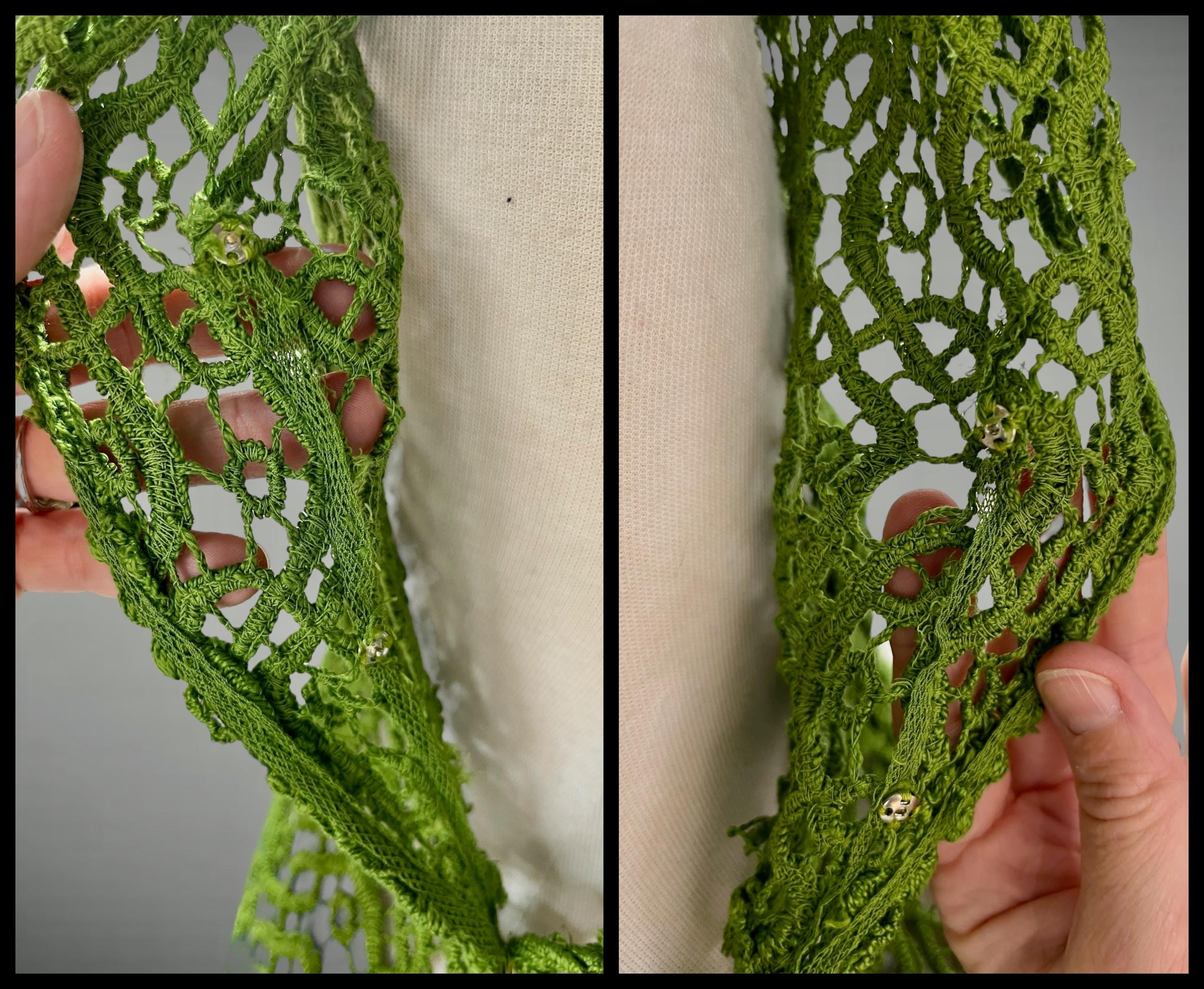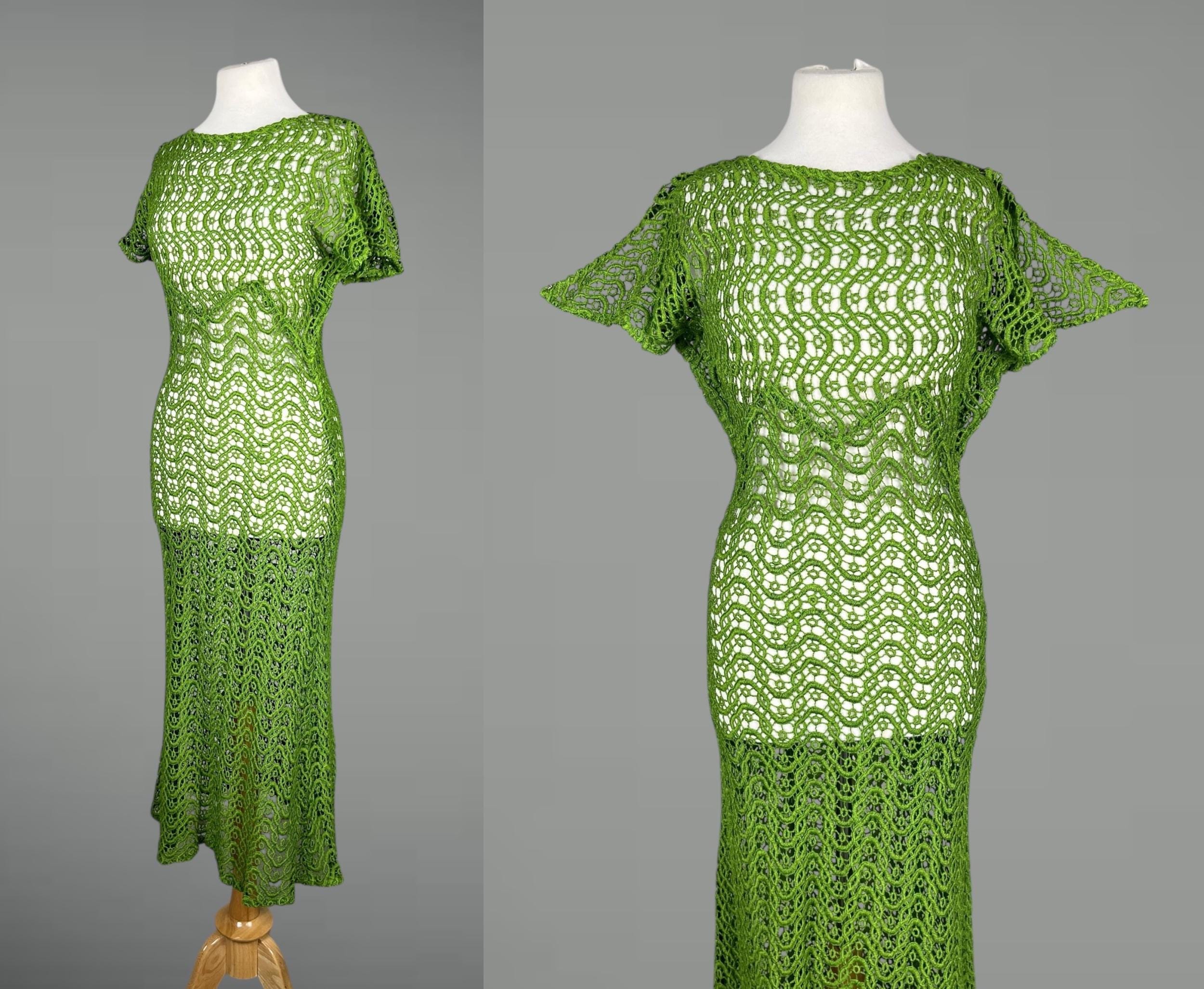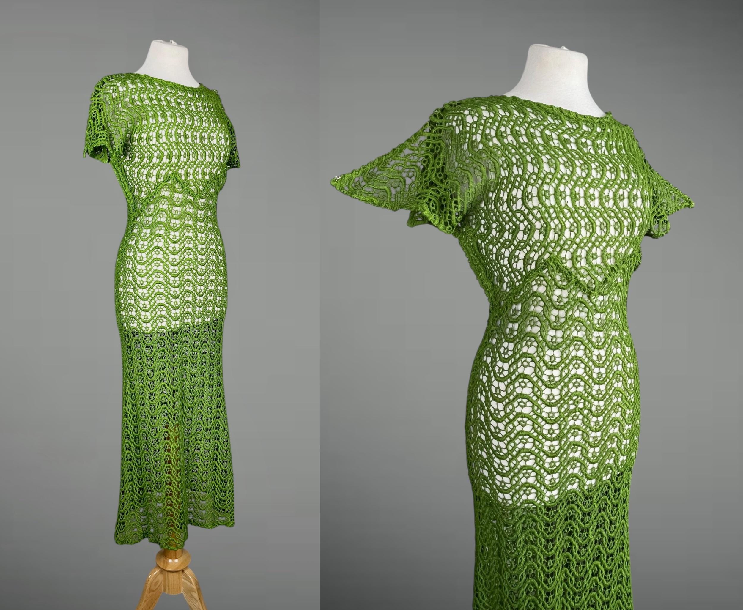 Eye-catching vintage 1930s cotton crochet dress in a vibrant, crisp apple-green hue! This piece originally came to me in a pale yellow palette with white-faded areas; I transformed it using RIT dye and a dye fixative to achieve this fantastic fresh color. Crafted in a beautifully hand-worked open-wave pattern, the dress skims the figure in that coveted Deco-era, bias-cut silhouette — gently fitted through the torso with a graceful flare at the hem. The short flutter sleeves, with subtle “cold-shoulder-esque” split sides, and the soft round neckline flatter the shoulders. The dress fastens with four snaps up from left waist to underarm / sleeve hem. Unlined, allowing you to style it with your choice of slip for daytime wear or a more dramatic layer for evening.