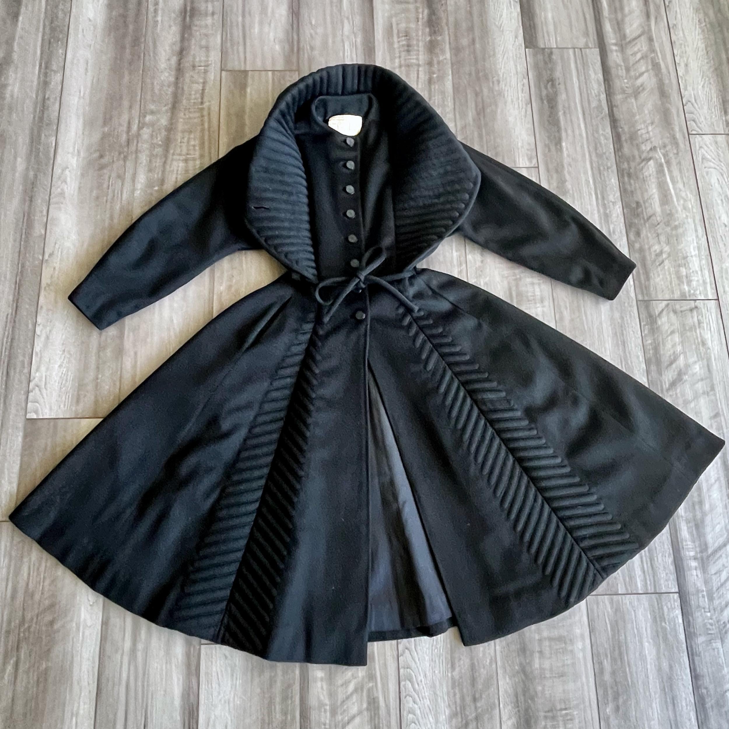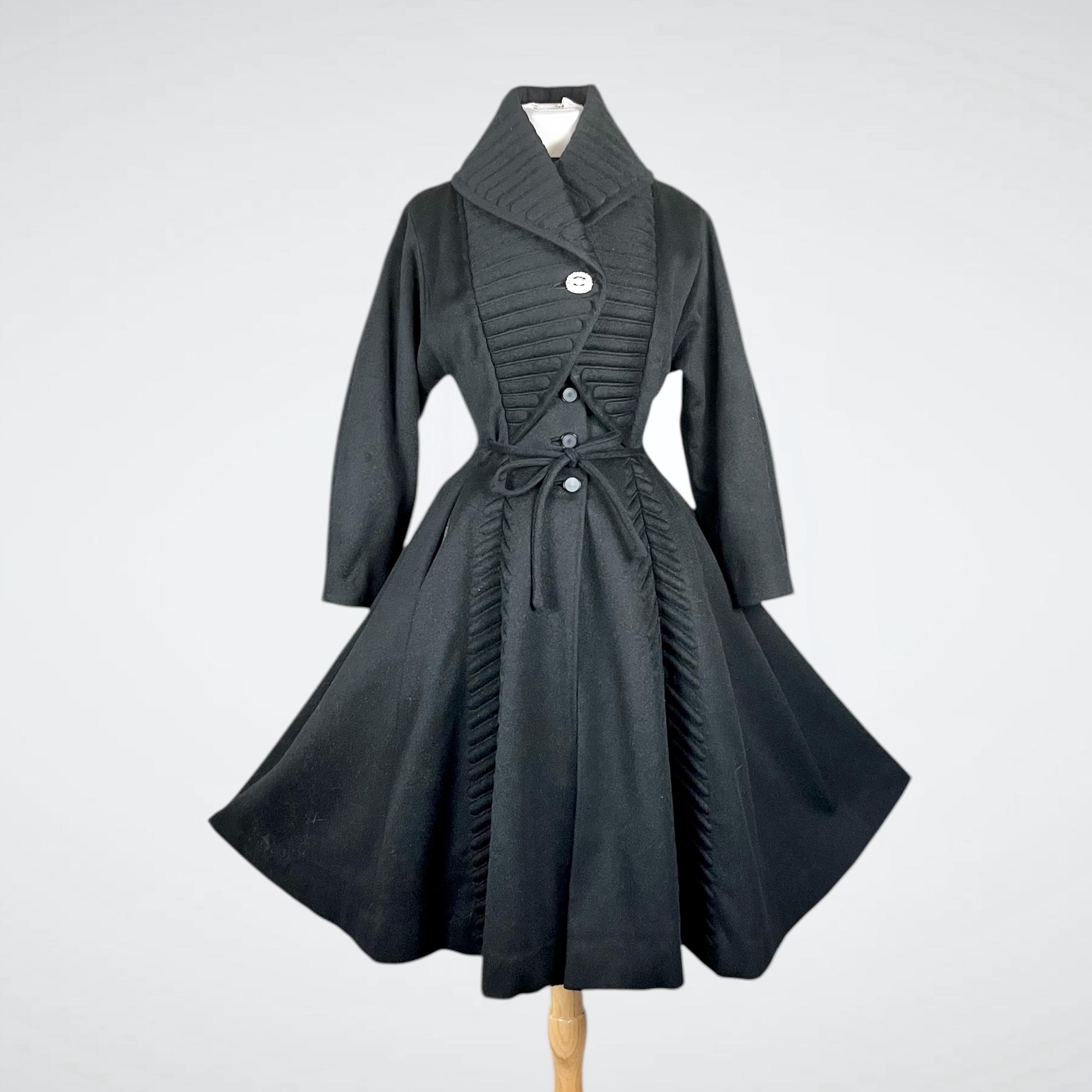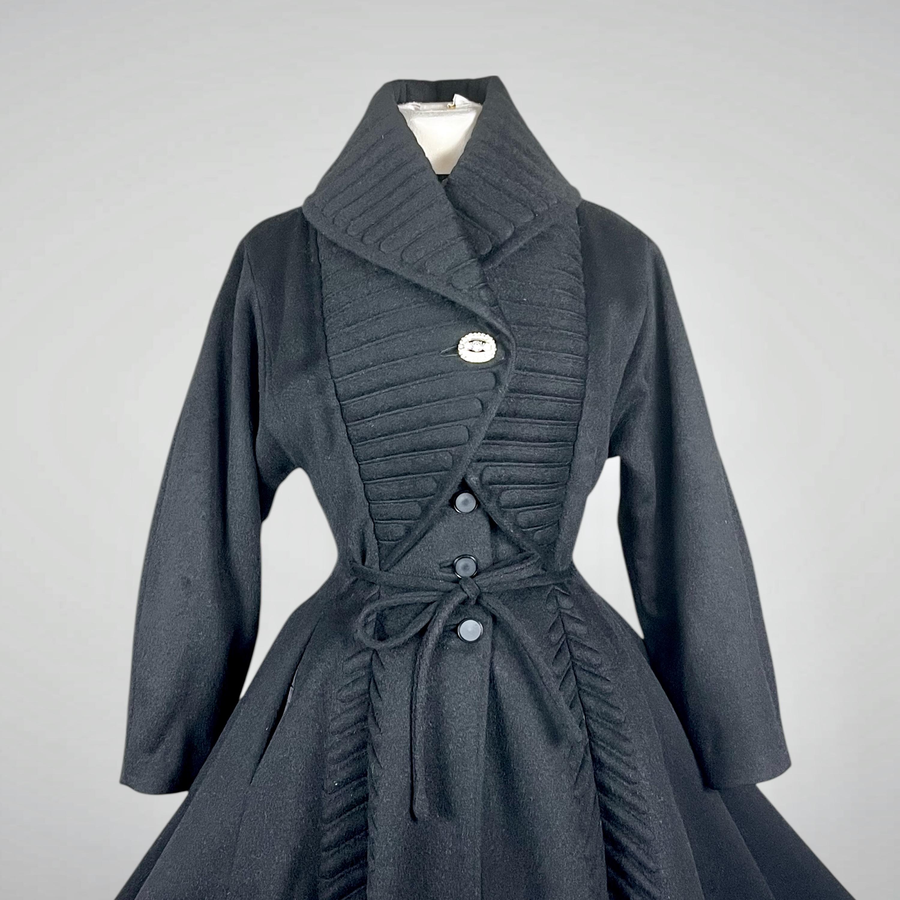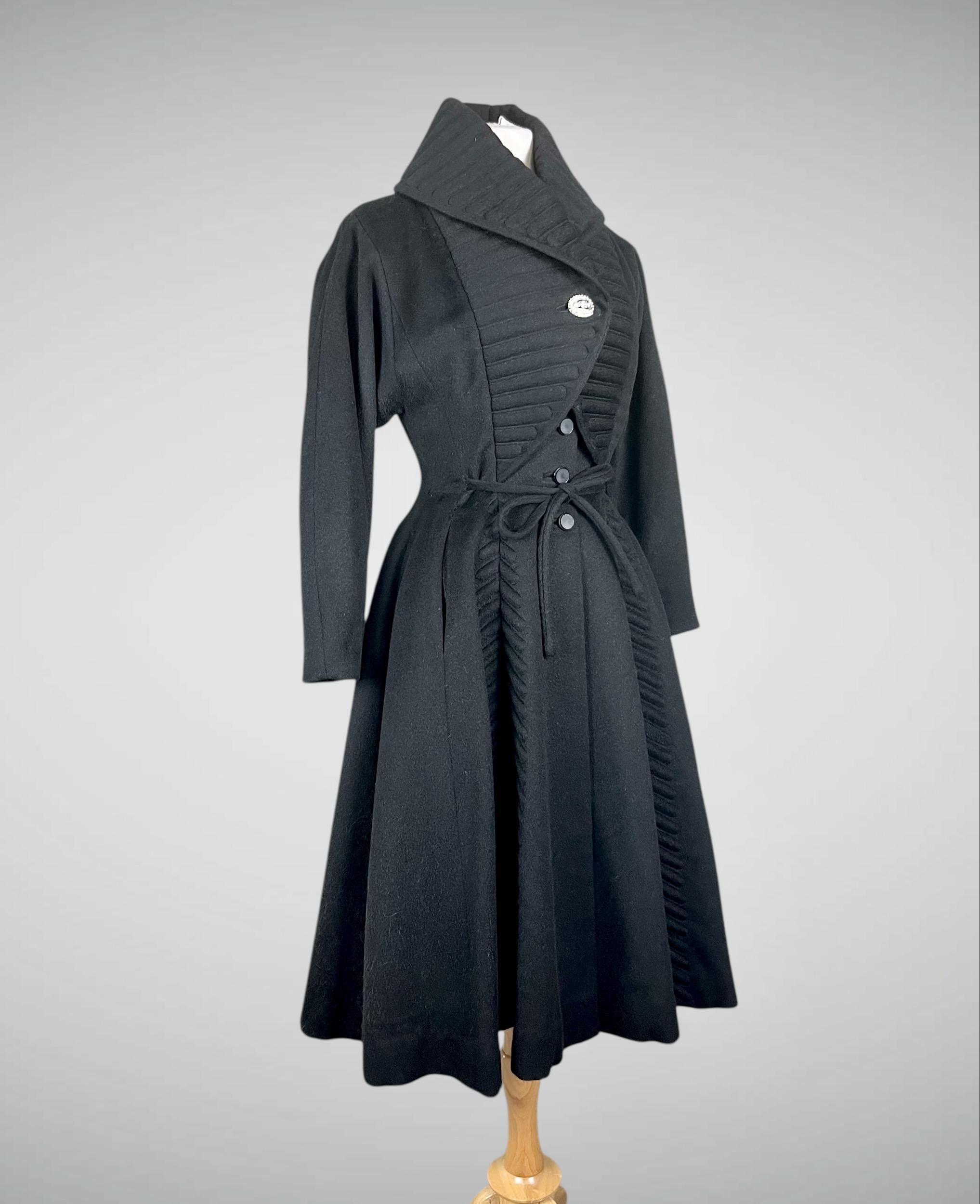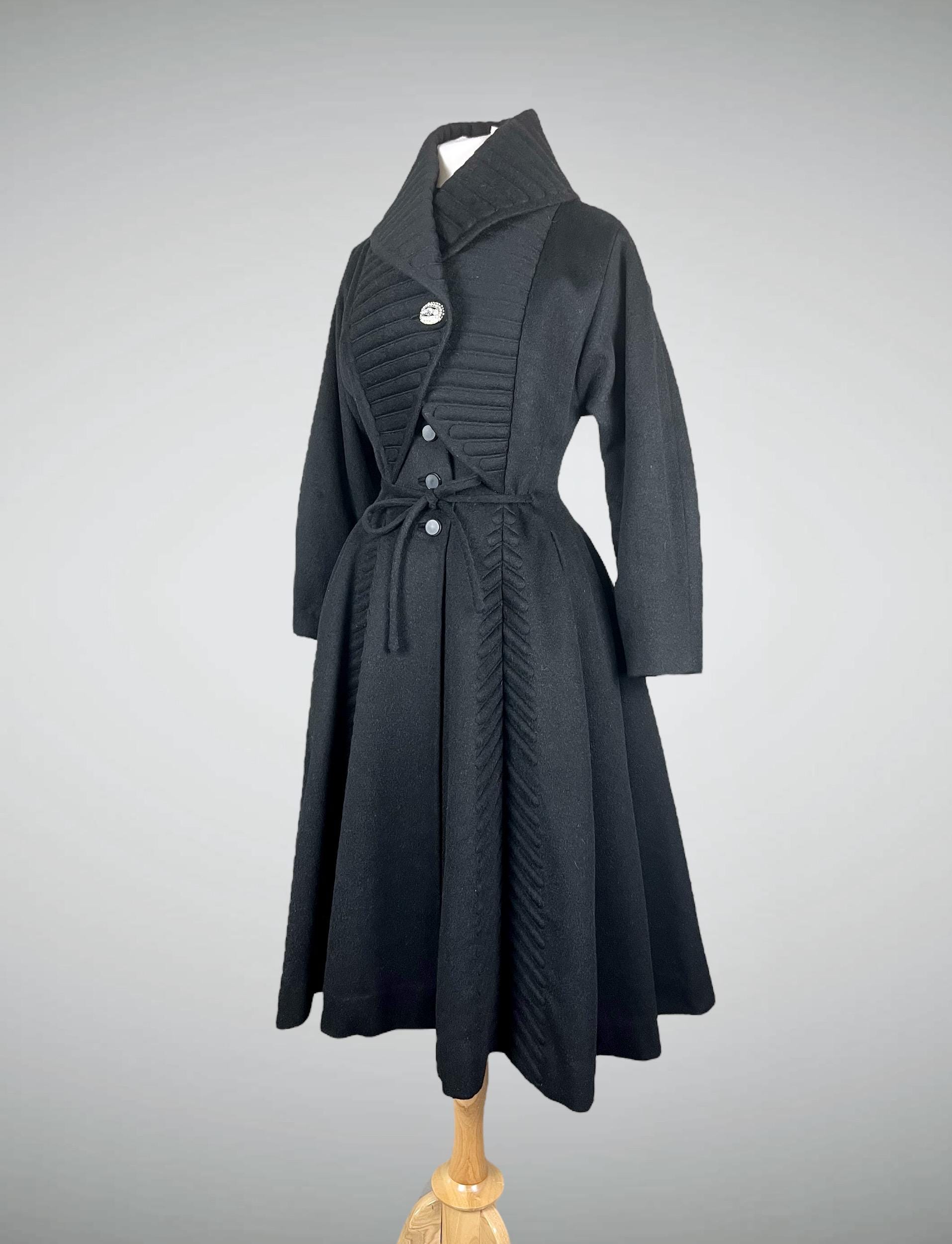Amazing rare vintage 1950s Lilli Ann princess coat in a classic New Look silhouette! Made from a sumptuous mid-weight black wool broadcloth with a softly lustrous, velvety hand, it showcases Lilli Ann’s renowned mid-century tailoring. The convertible collar is a true statement—dramatic when worn standing up in a sculptural portrait style, or folded into a wide notched lapel secured by a sparkling rhinestone button. Quilted trapunto stitching draws the eye, framing the front panels and echoing down the skirt. The fit-and-flare princess-cut silhouette is incredibly flattering, cinched at the waist with the original self-tie belt before flowing into the sweeping swing skirt. Fully lined in satin. The coat closes with eight front buttons, and that single rhinestone button at the collar.