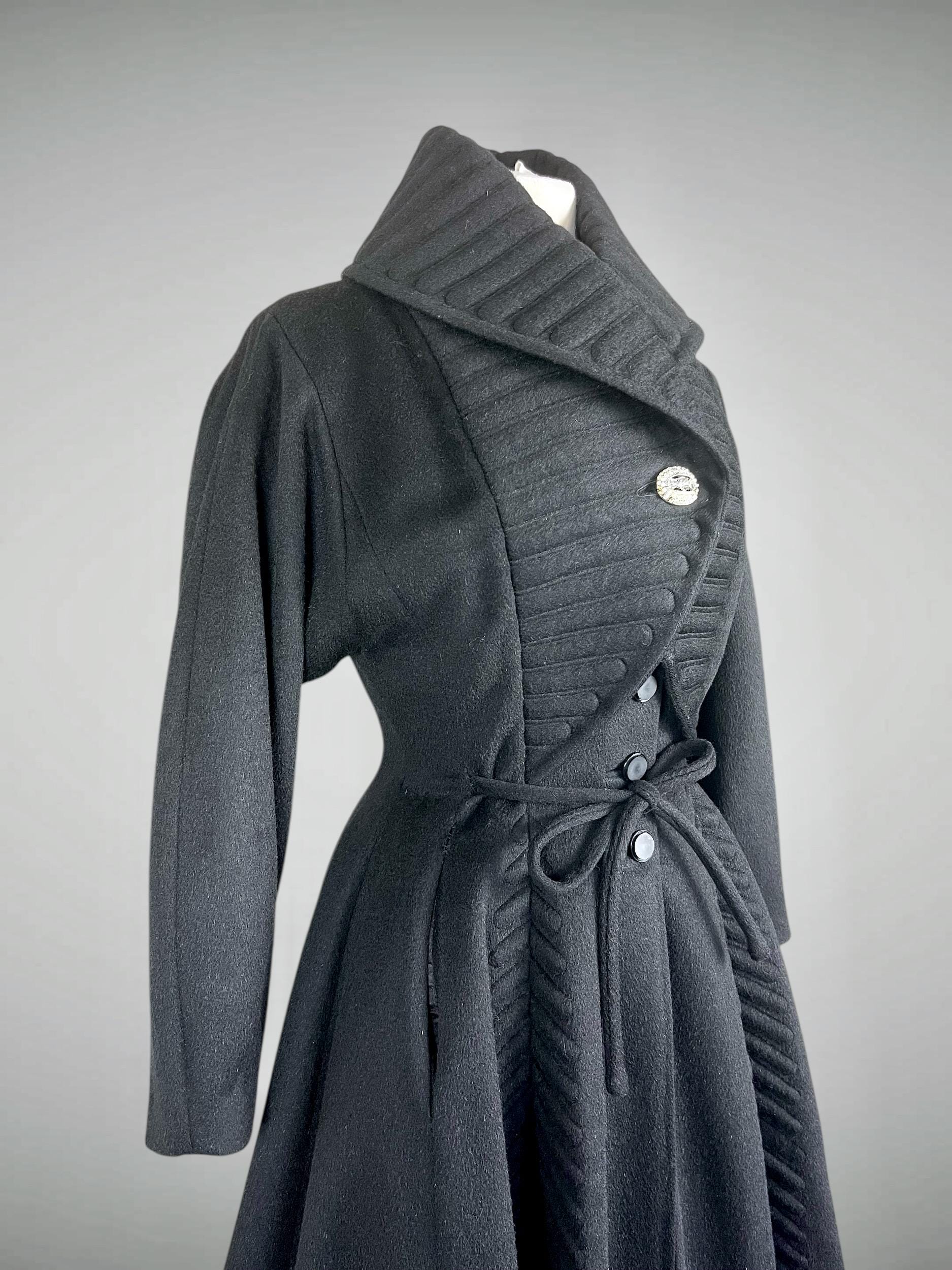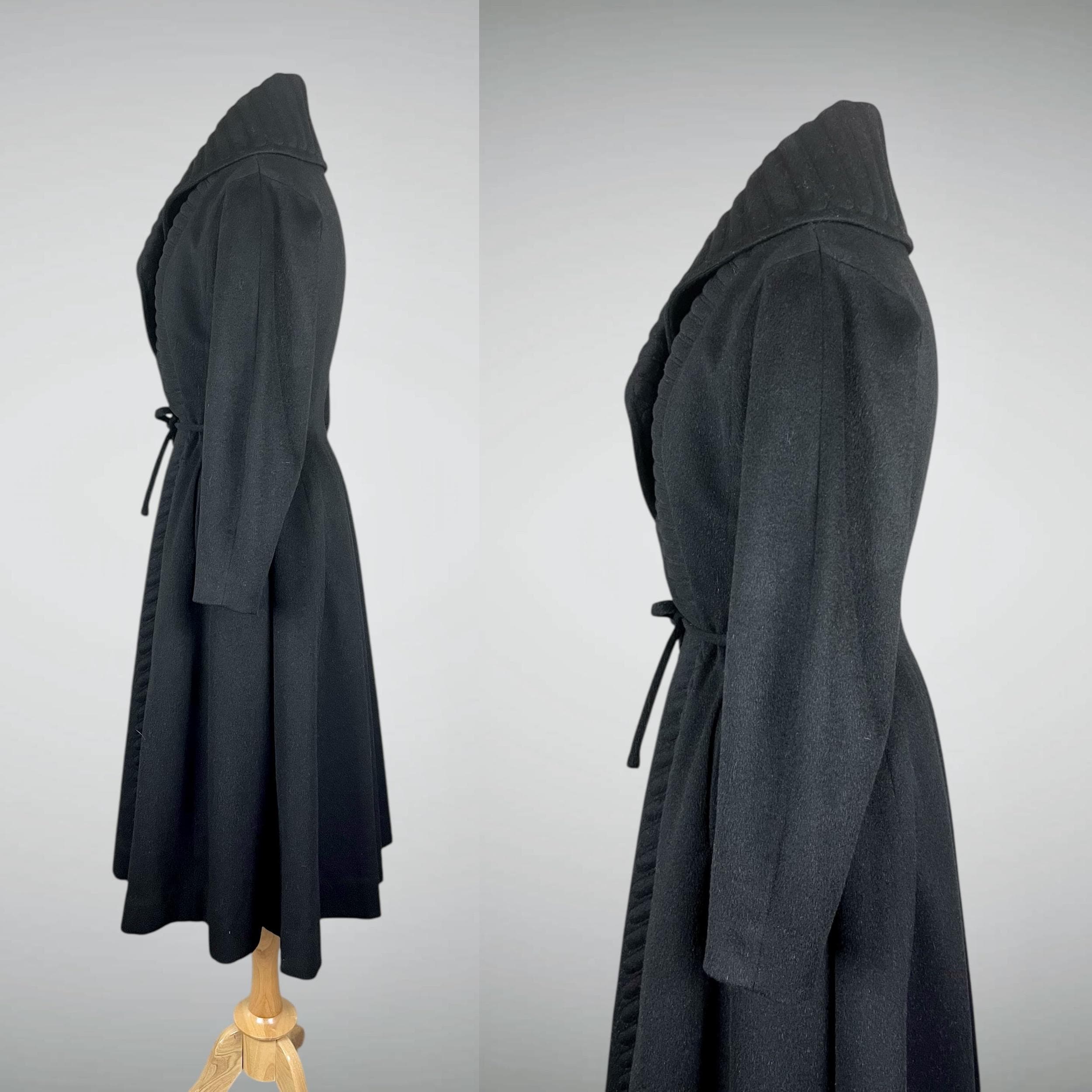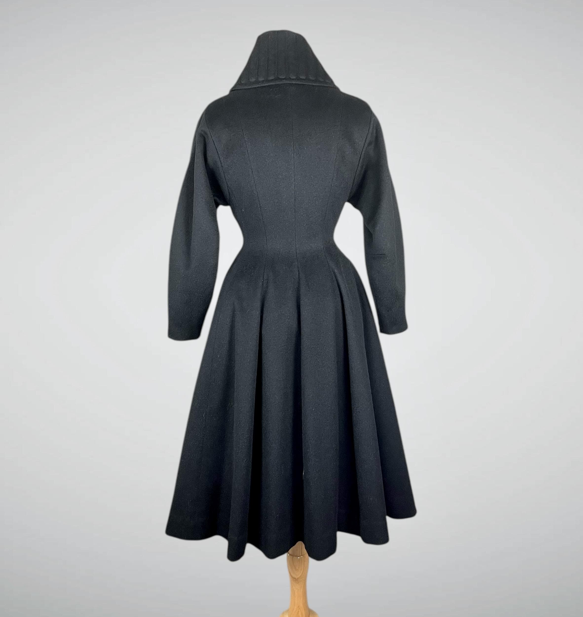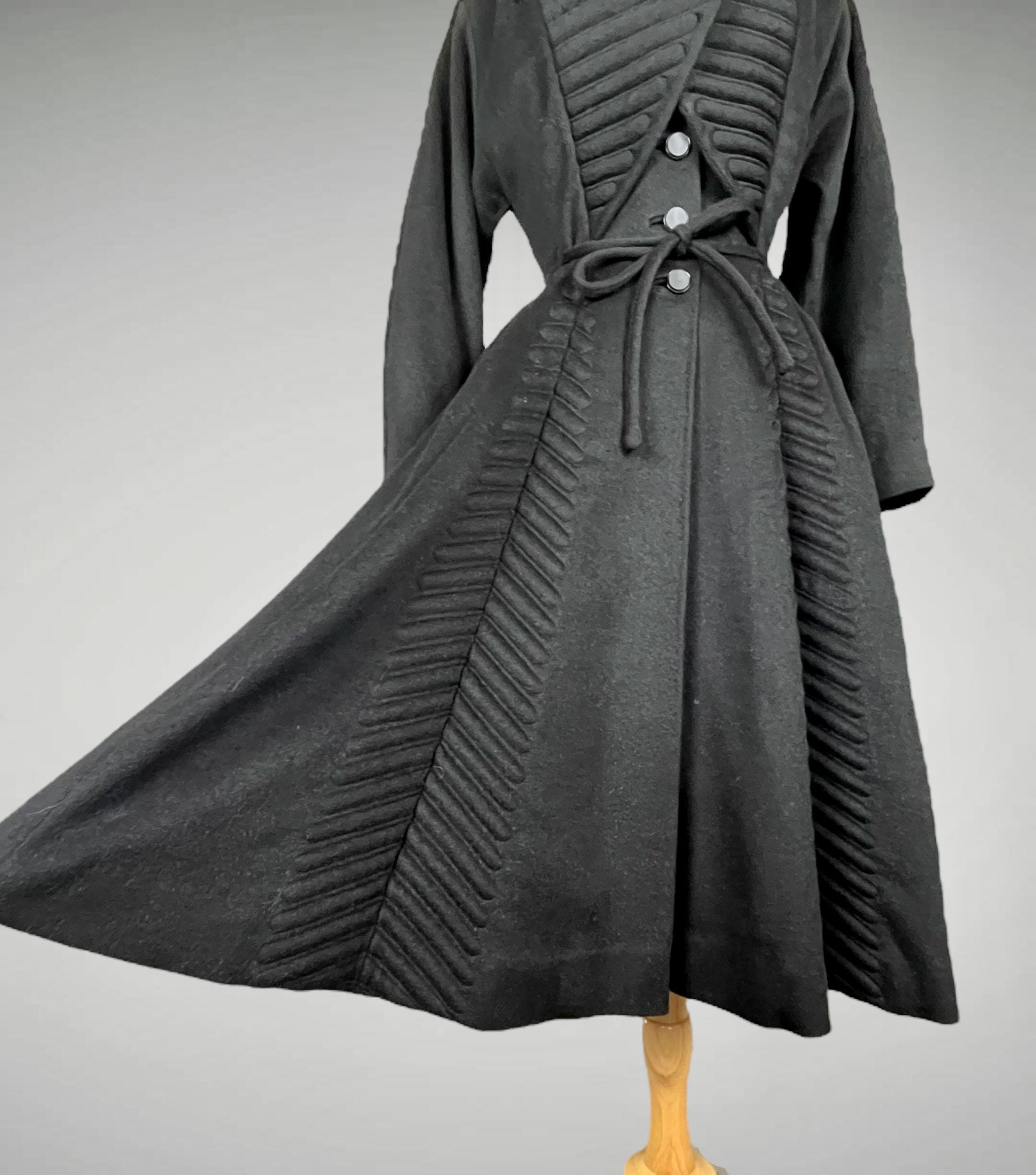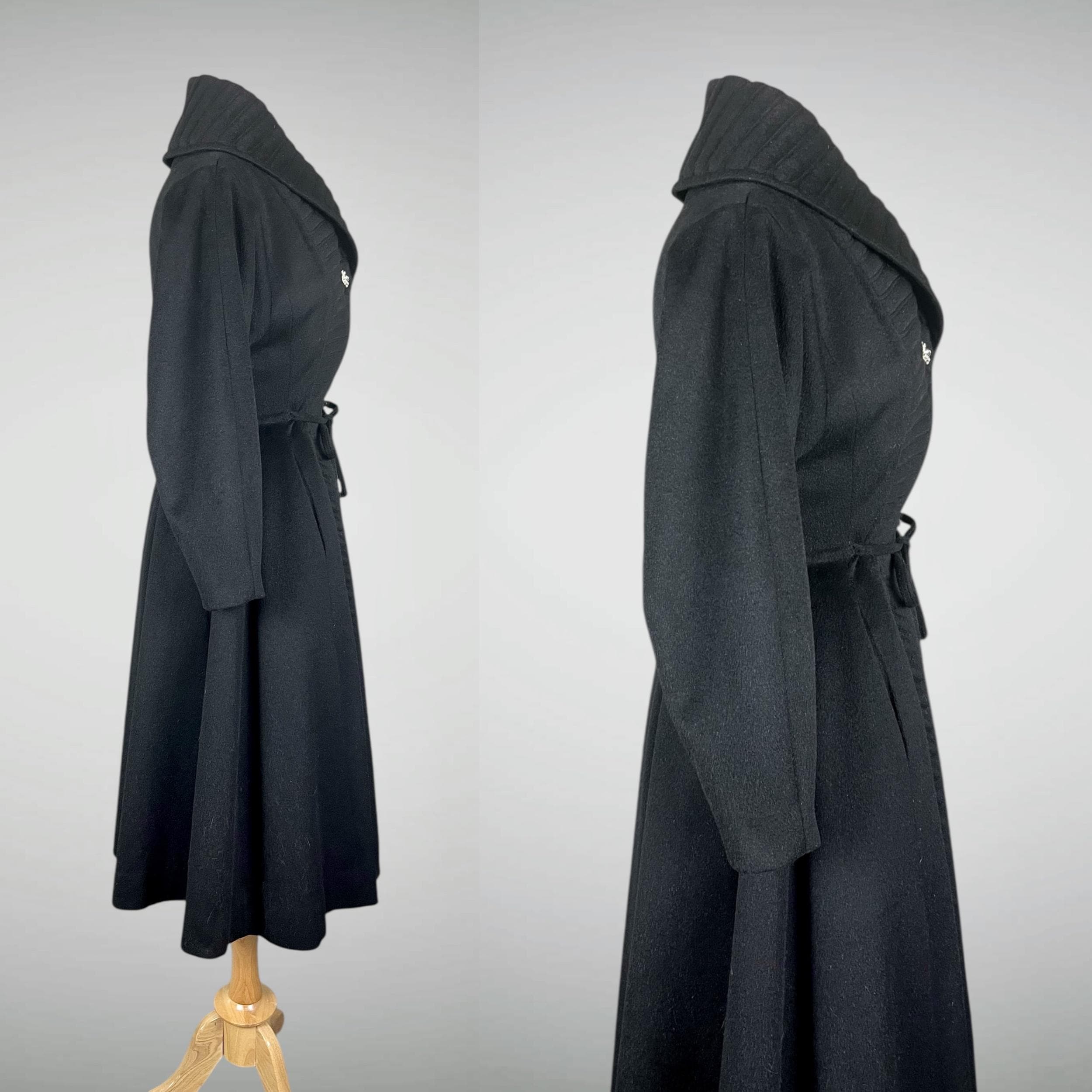 Amazing rare vintage 1950s Lilli Ann princess coat in a classic New Look silhouette! Made from a sumptuous mid-weight black wool broadcloth with a softly lustrous, velvety hand, it showcases Lilli Ann’s renowned mid-century tailoring. The convertible collar is a true statement—dramatic when worn standing up in a sculptural portrait style, or folded into a wide notched lapel secured by a sparkling rhinestone button. Quilted trapunto stitching draws the eye, framing the front panels and echoing down the skirt. The fit-and-flare princess-cut silhouette is incredibly flattering, cinched at the waist with the original self-tie belt before flowing into the sweeping swing skirt. Fully lined in satin. The coat closes with eight front buttons, and that single rhinestone button at the collar.