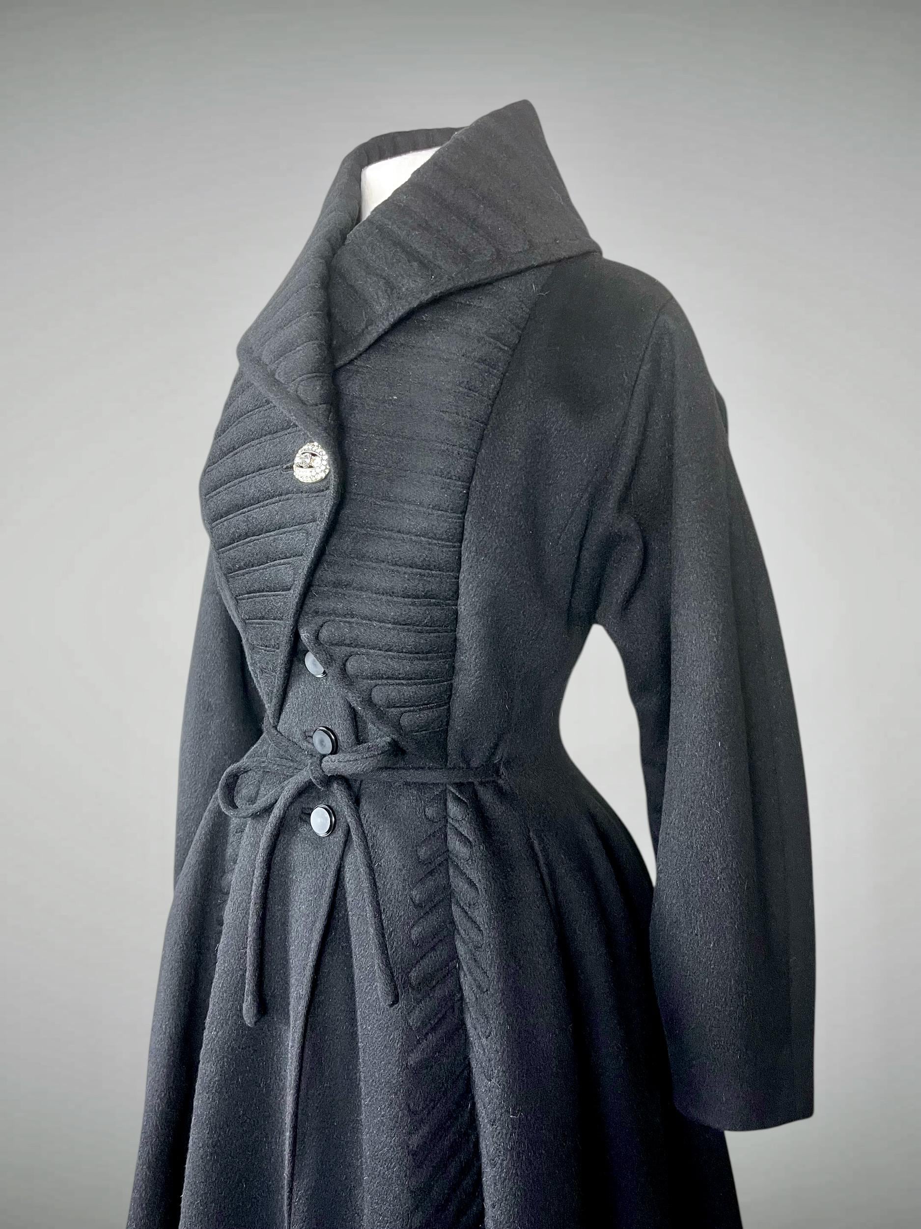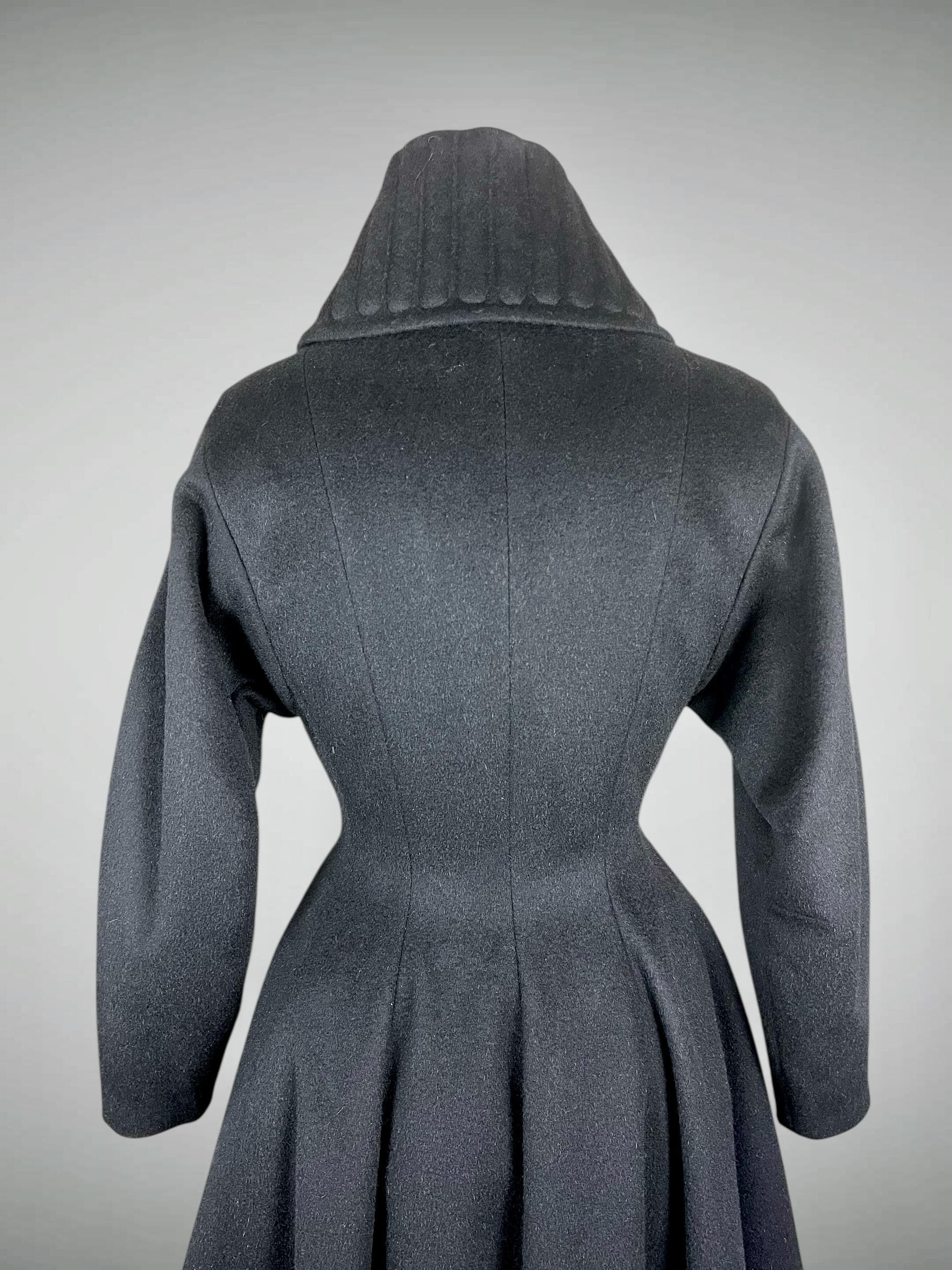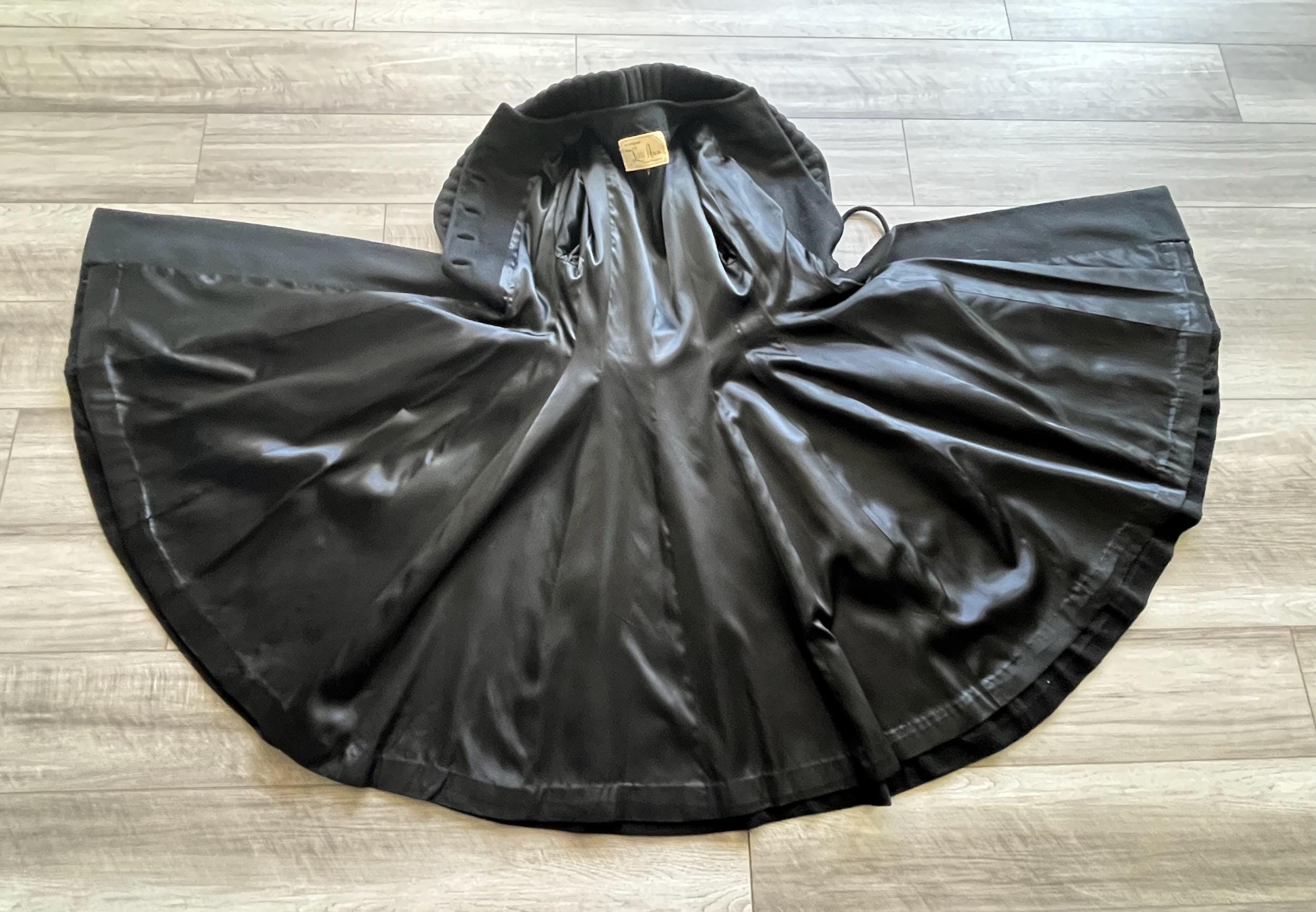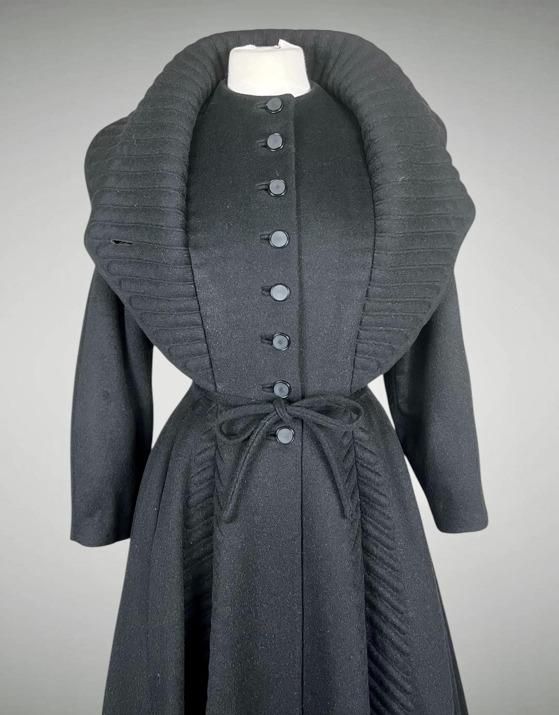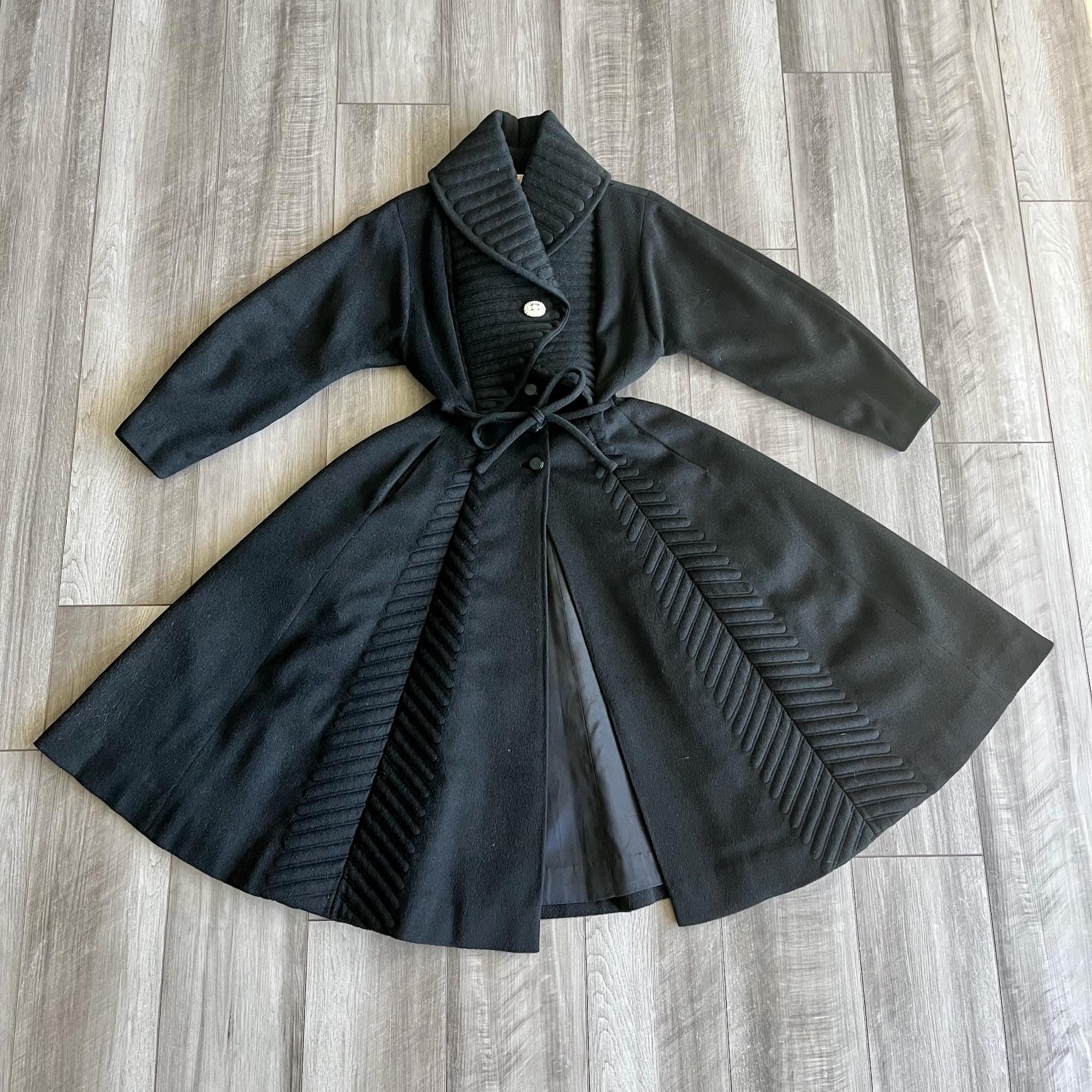 Amazing rare vintage 1950s Lilli Ann princess coat in a classic New Look silhouette! Made from a sumptuous mid-weight black wool broadcloth with a softly lustrous, velvety hand, it showcases Lilli Ann’s renowned mid-century tailoring. The convertible collar is a true statement—dramatic when worn standing up in a sculptural portrait style, or folded into a wide notched lapel secured by a sparkling rhinestone button. Quilted trapunto stitching draws the eye, framing the front panels and echoing down the skirt. The fit-and-flare princess-cut silhouette is incredibly flattering, cinched at the waist with the original self-tie belt before flowing into the sweeping swing skirt. Fully lined in satin. The coat closes with eight front buttons, and that single rhinestone button at the collar.