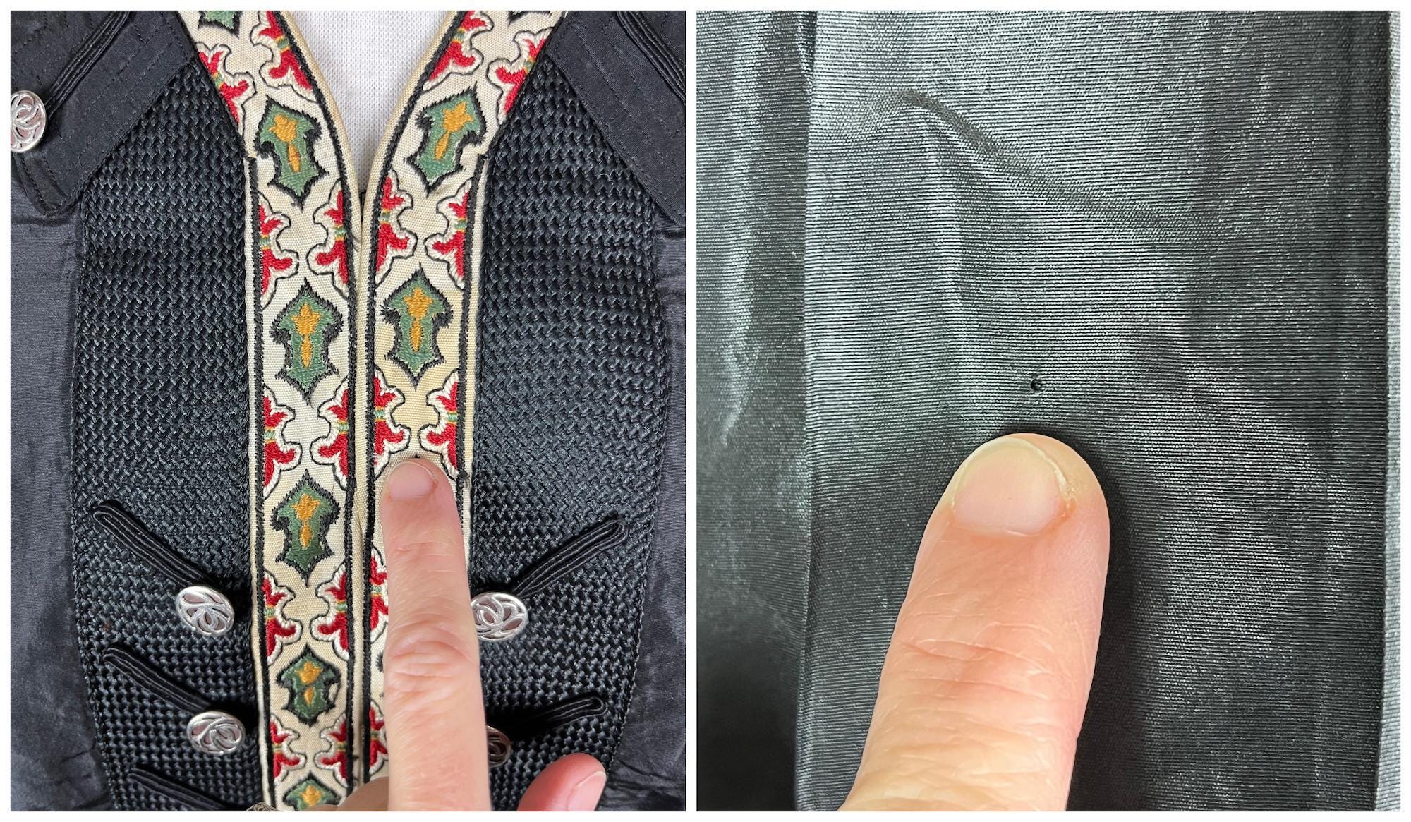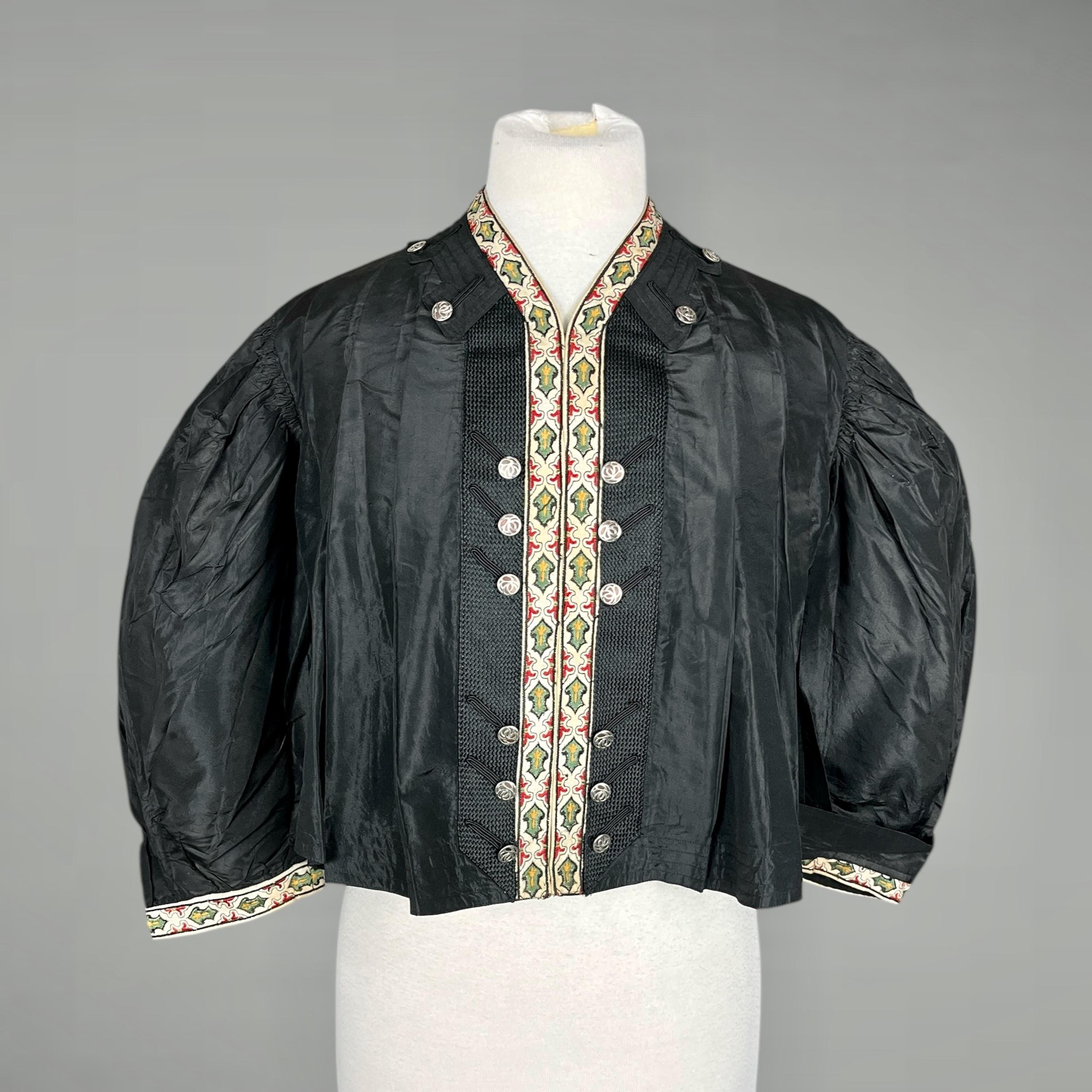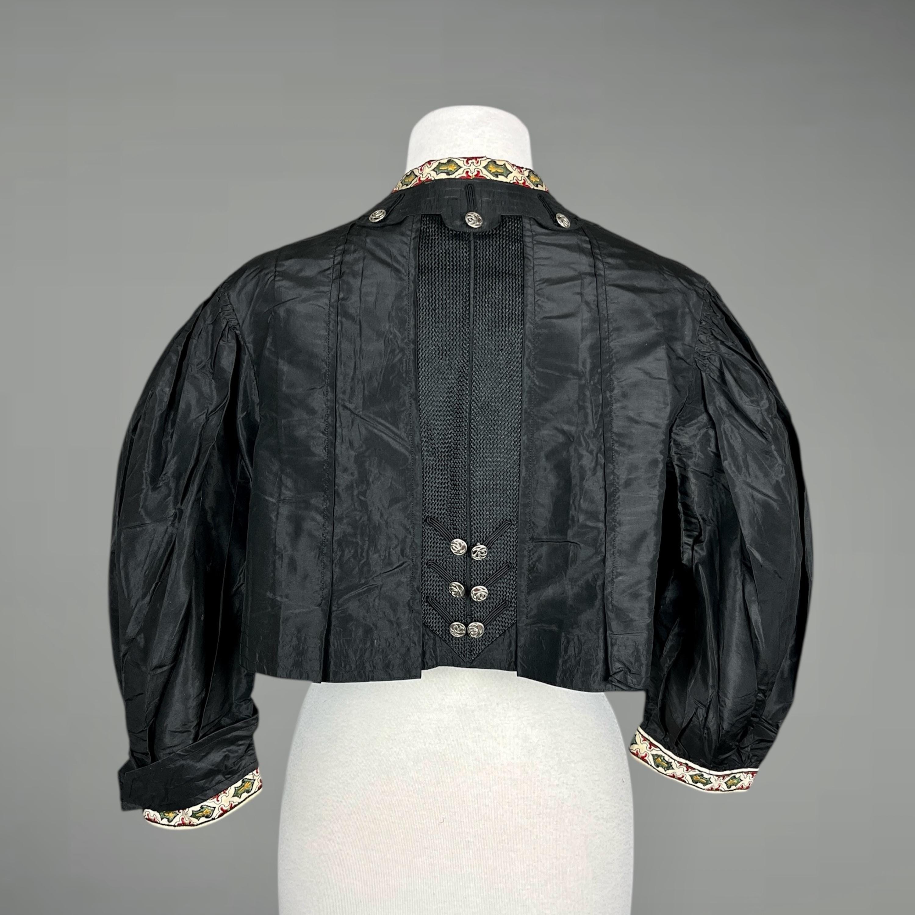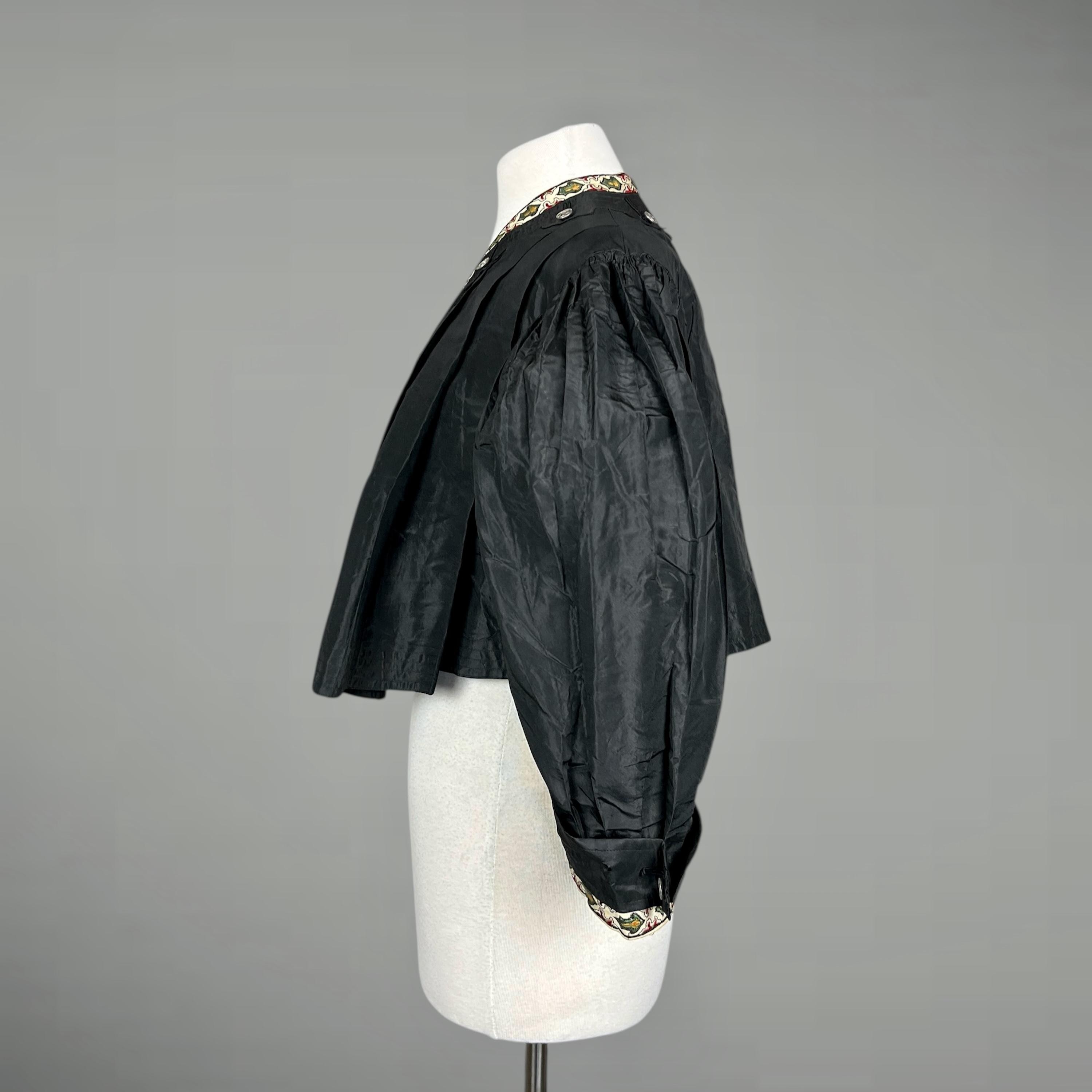 Antique early 1900s black silk Eton jacket, richly detailed with vibrant embroidered trim and decorative silver-tone button accents. Crafted from crisp, lightweight black silk taffeta, this piece has that classic slightly boxy Eton silhouette with beautiful structure. Wide vertical panels of textured woven blackwork frame both the front and back. A bold band of embroidered trim runs along the neckline and down the front placket, worked in earthy olive, gold, and red—which pop against the inky silk. Matching trim also appears at the sleeve cuffs for a cohesive finish.