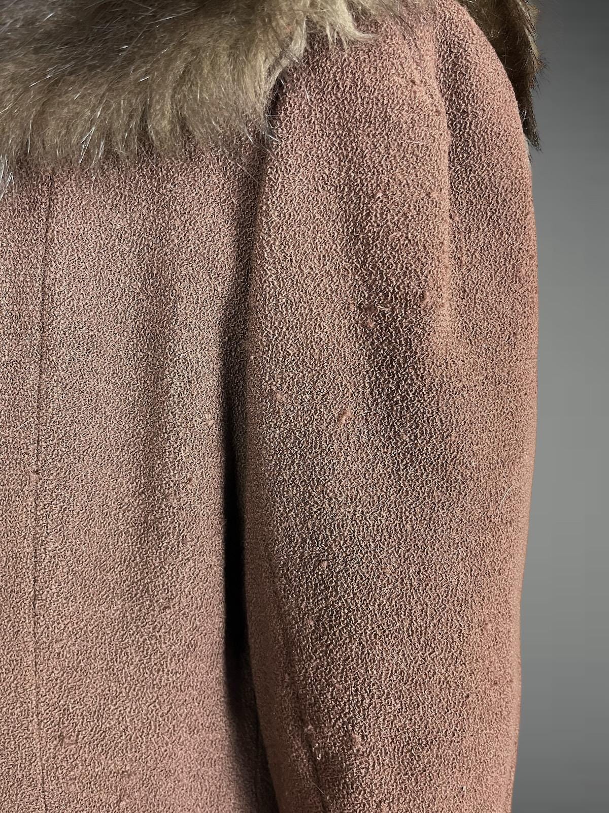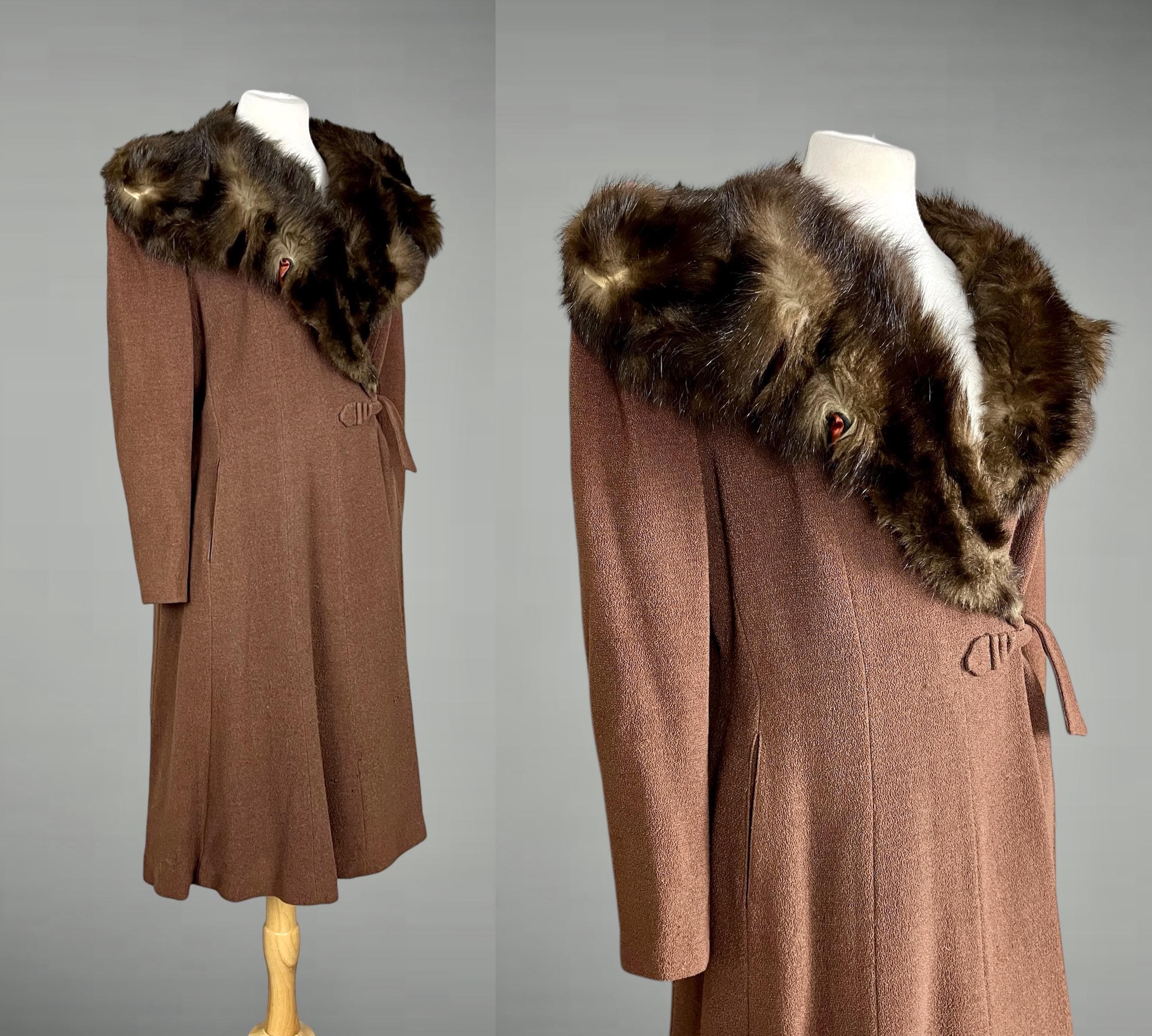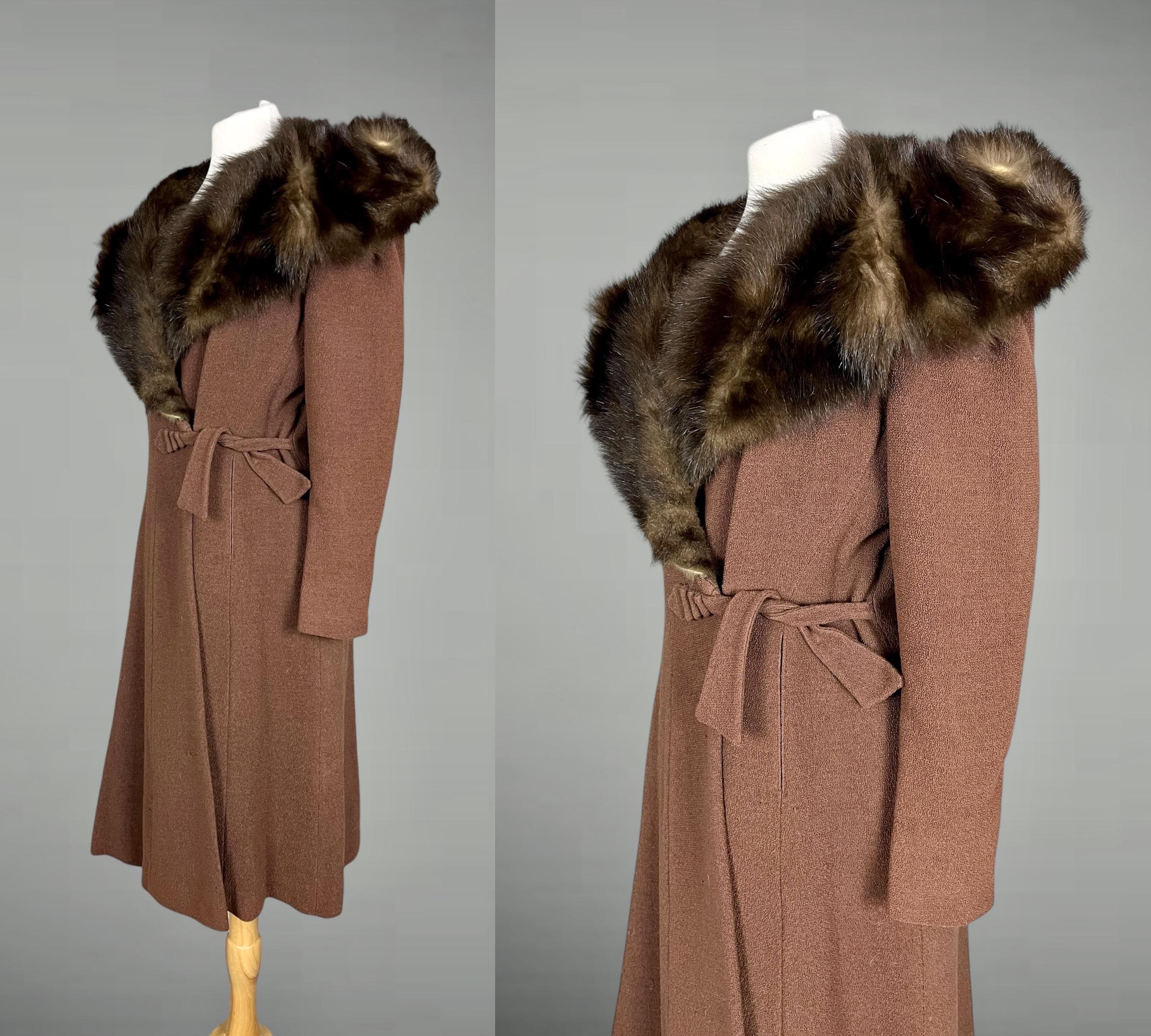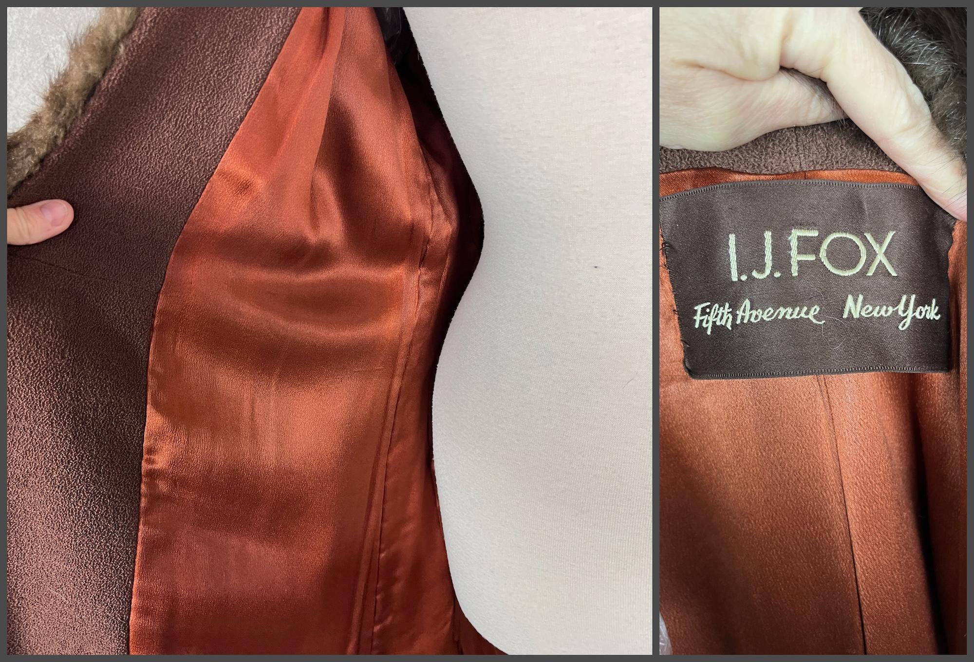 Beautiful late 1930s to early 1940s pre-war winter coat by high-end furrier company I.J. Fox, Fifth Avenue, New York, crafted in a richly textured warm brown bouclé wool and trimmed with a dramatic natural fox fur shawl collar. Fully lined in silk satin, this is a true luxury city coat with fantastic tailoring. The bouclé wool has that perfect looped, pebbly texture that gives softness without losing structure. The silhouette is wonderfully sculpted through the waist with fluid shaping through the hips and hem, finished with side slit pockets and a wrap-style front with snap closure and original side belt tie for an elegant, flattering fit. The fox fur collar is full and dimensional with deep brown tips and soft golden underfur. Hidden snap closures are added beneath each side of the fur collar, allowing you to fasten the under-fur into soft pleated pockets beneath the outer fur when closed — a beautifully functional and unusual design detail.