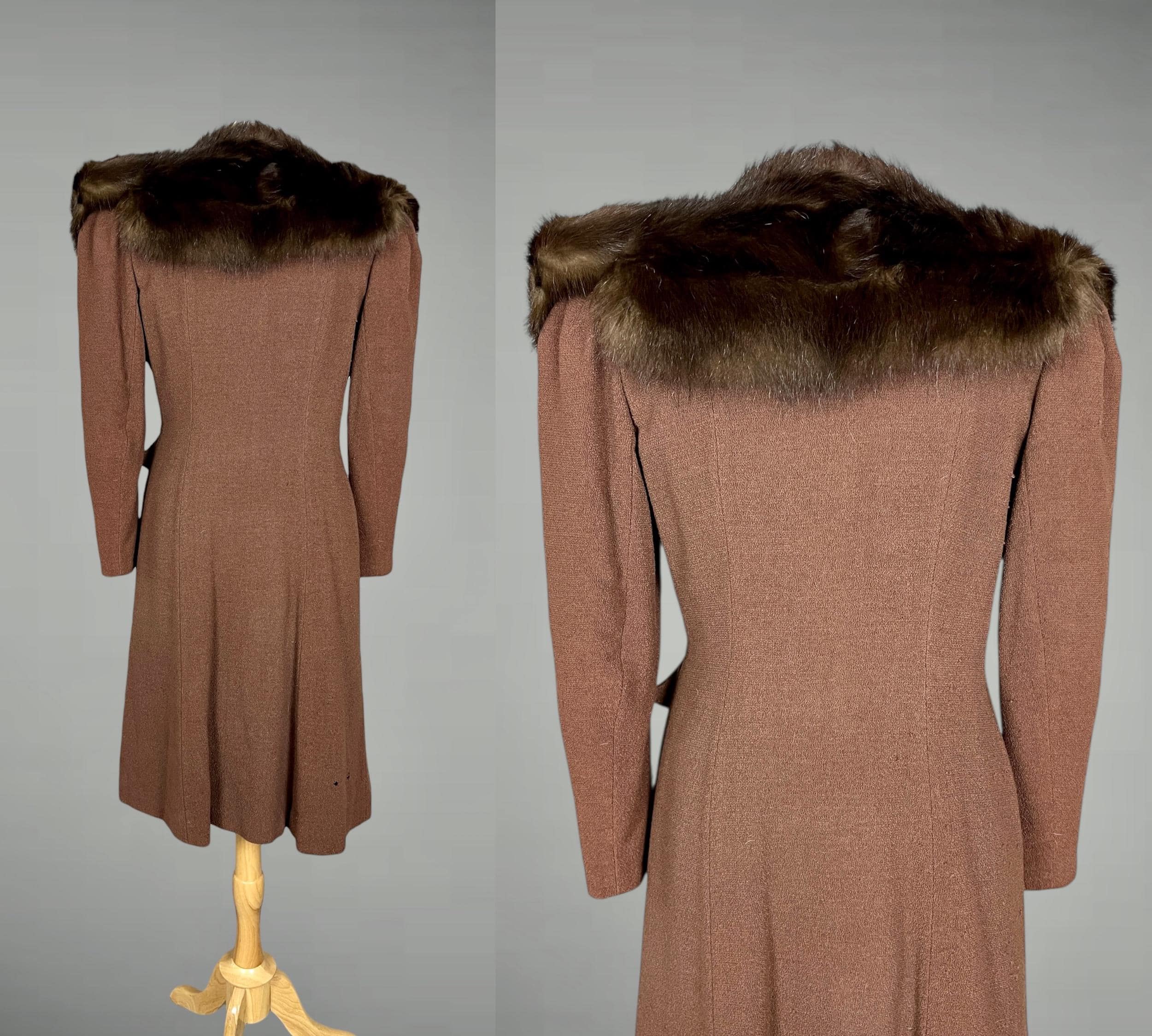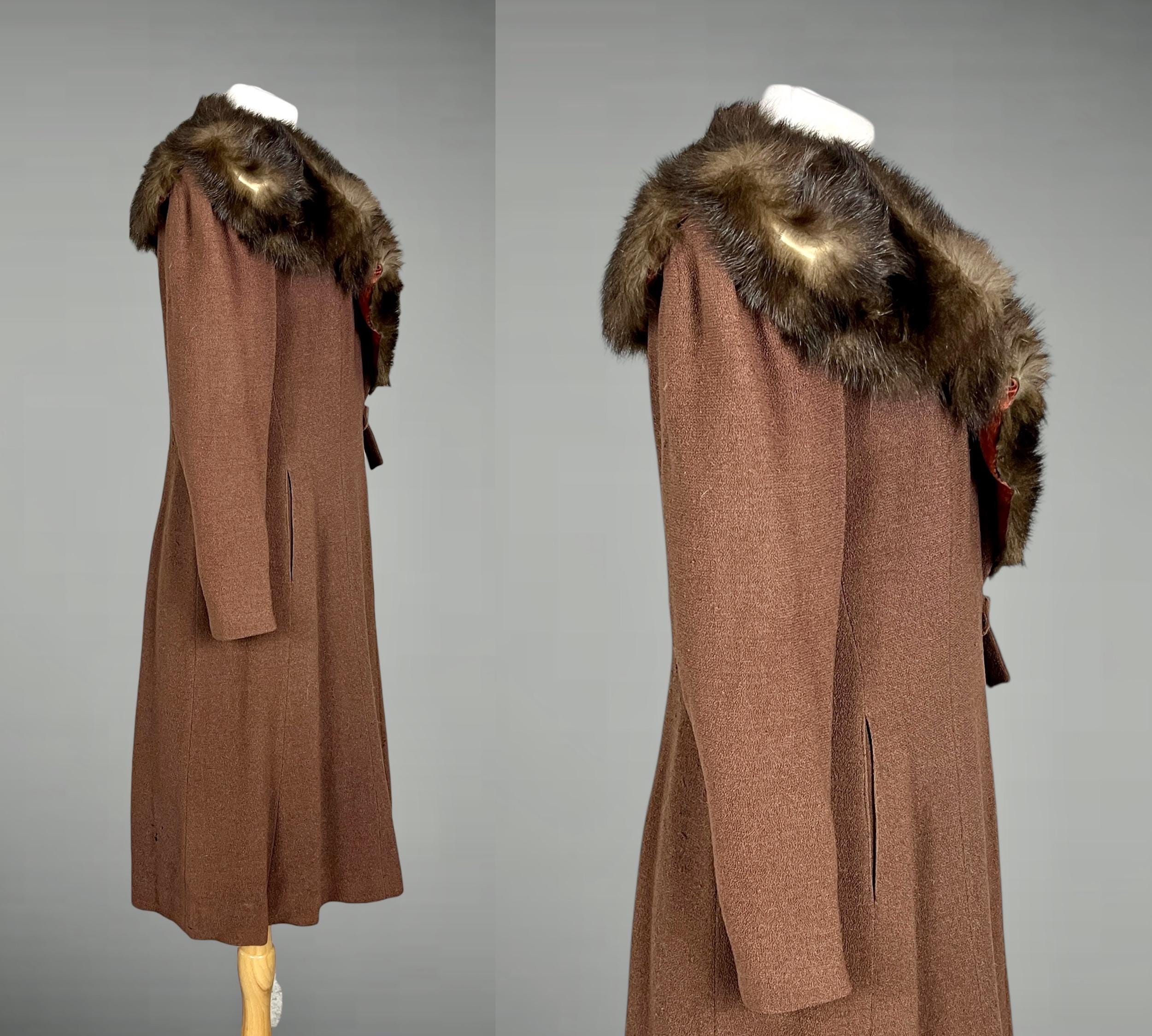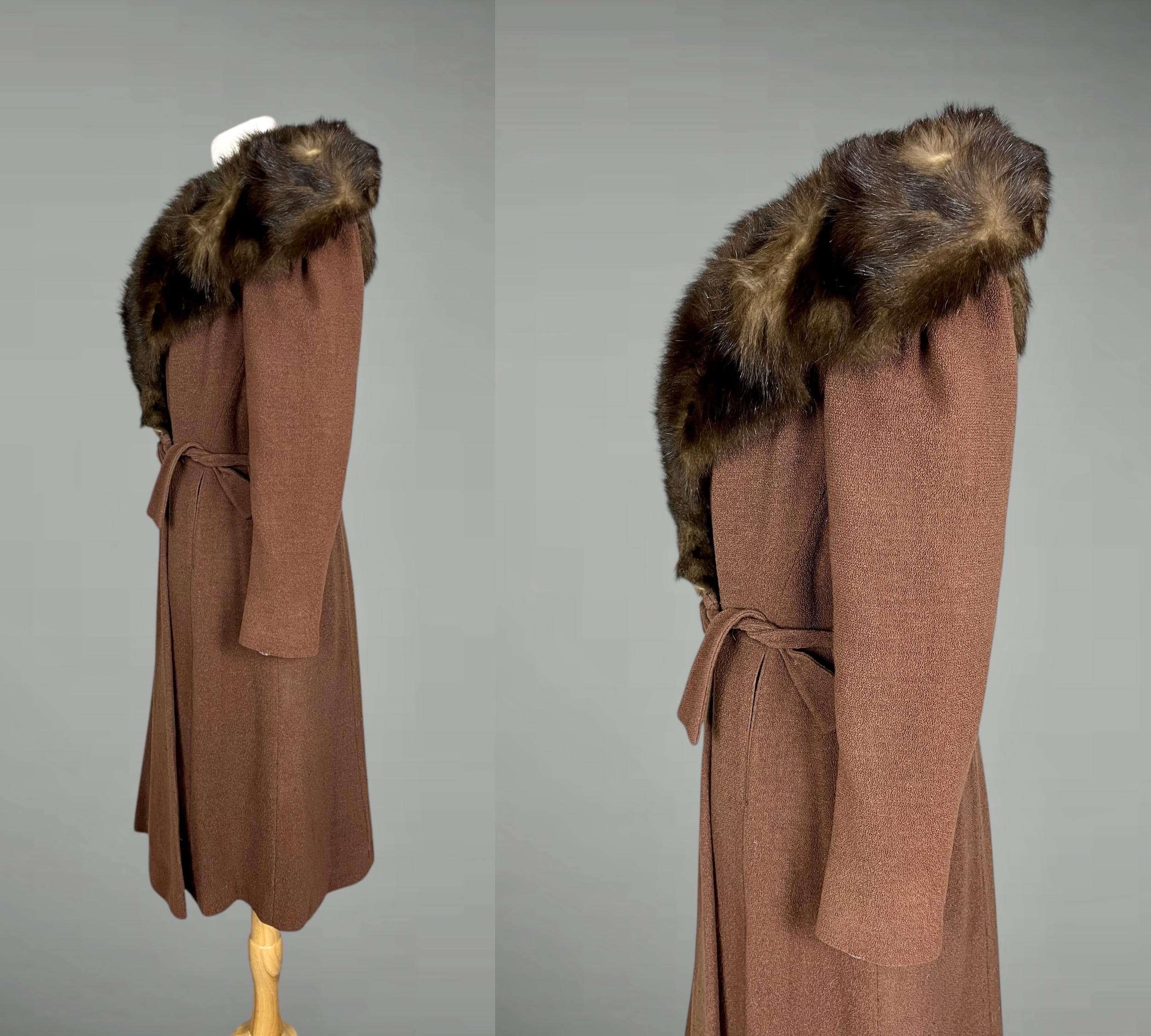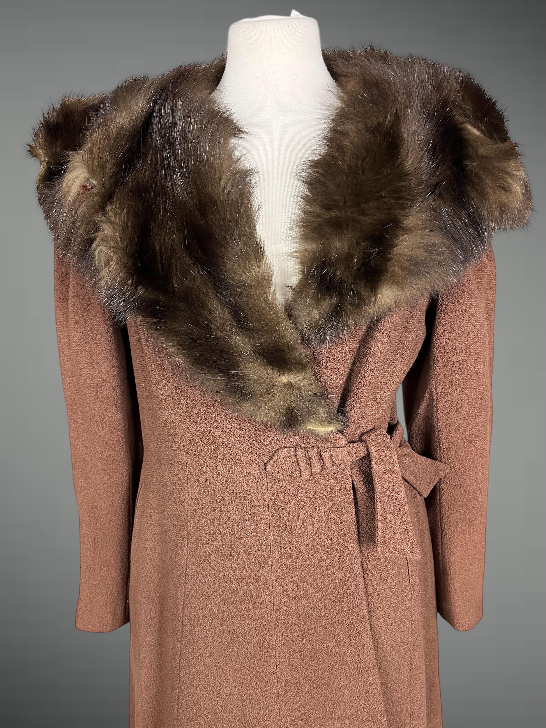 Beautiful late 1930s to early 1940s pre-war winter coat by high-end furrier company I.J. Fox, Fifth Avenue, New York, crafted in a richly textured warm brown bouclé wool and trimmed with a dramatic natural fox fur shawl collar. Fully lined in silk satin, this is a true luxury city coat with fantastic tailoring. The bouclé wool has that perfect looped, pebbly texture that gives softness without losing structure. The silhouette is wonderfully sculpted through the waist with fluid shaping through the hips and hem, finished with side slit pockets and a wrap-style front with snap closure and original side belt tie for an elegant, flattering fit. The fox fur collar is full and dimensional with deep brown tips and soft golden underfur. Hidden snap closures are added beneath each side of the fur collar, allowing you to fasten the under-fur into soft pleated pockets beneath the outer fur when closed — a beautifully functional and unusual design detail.