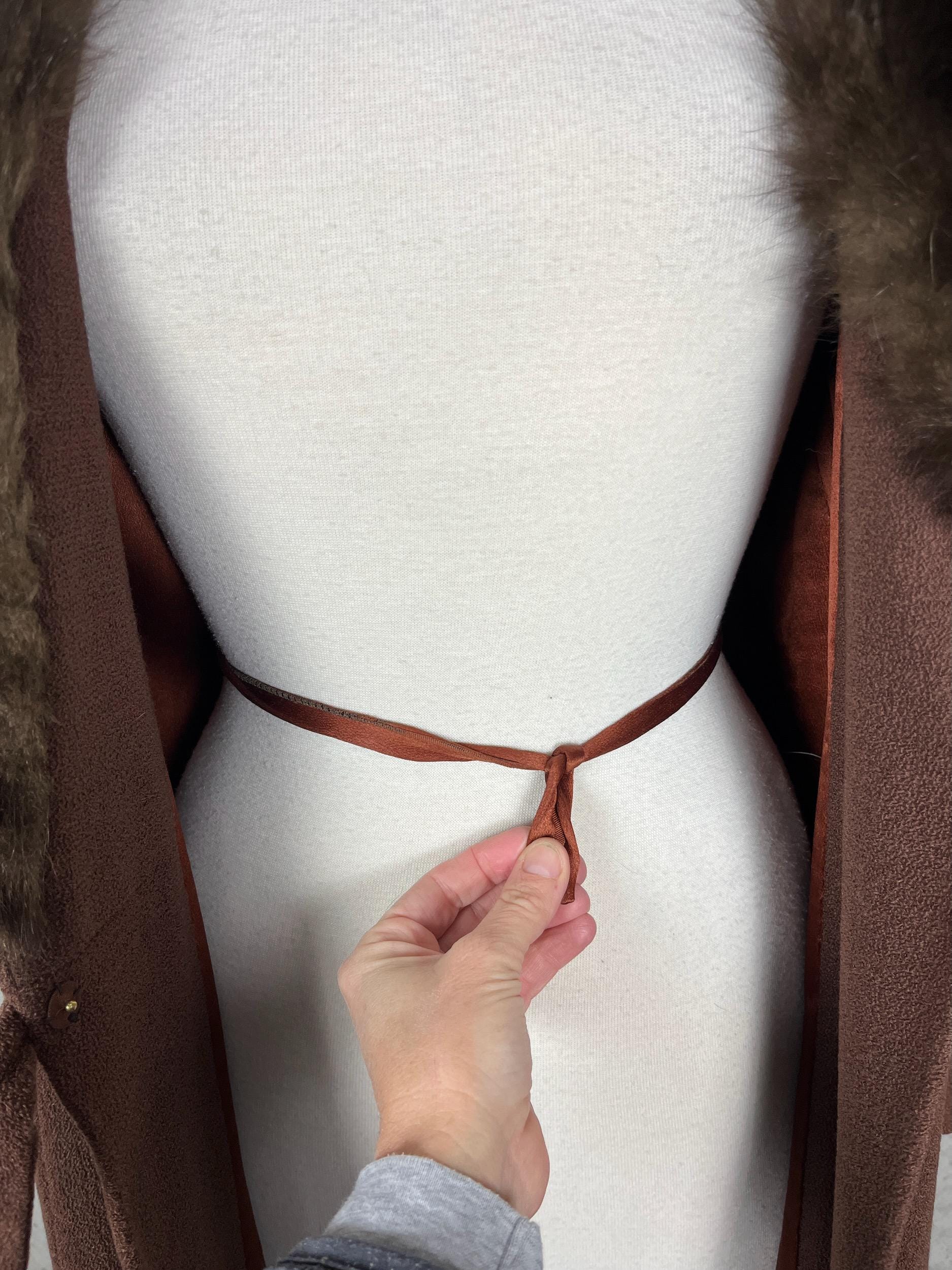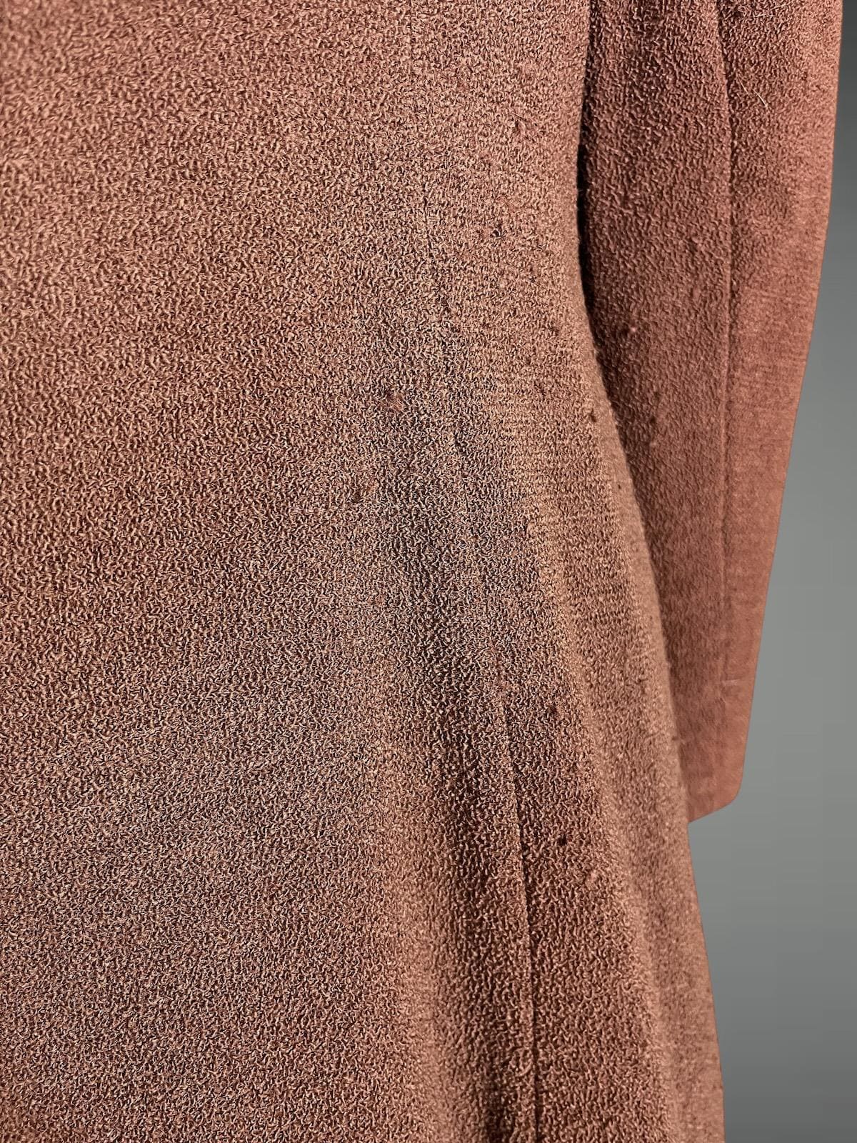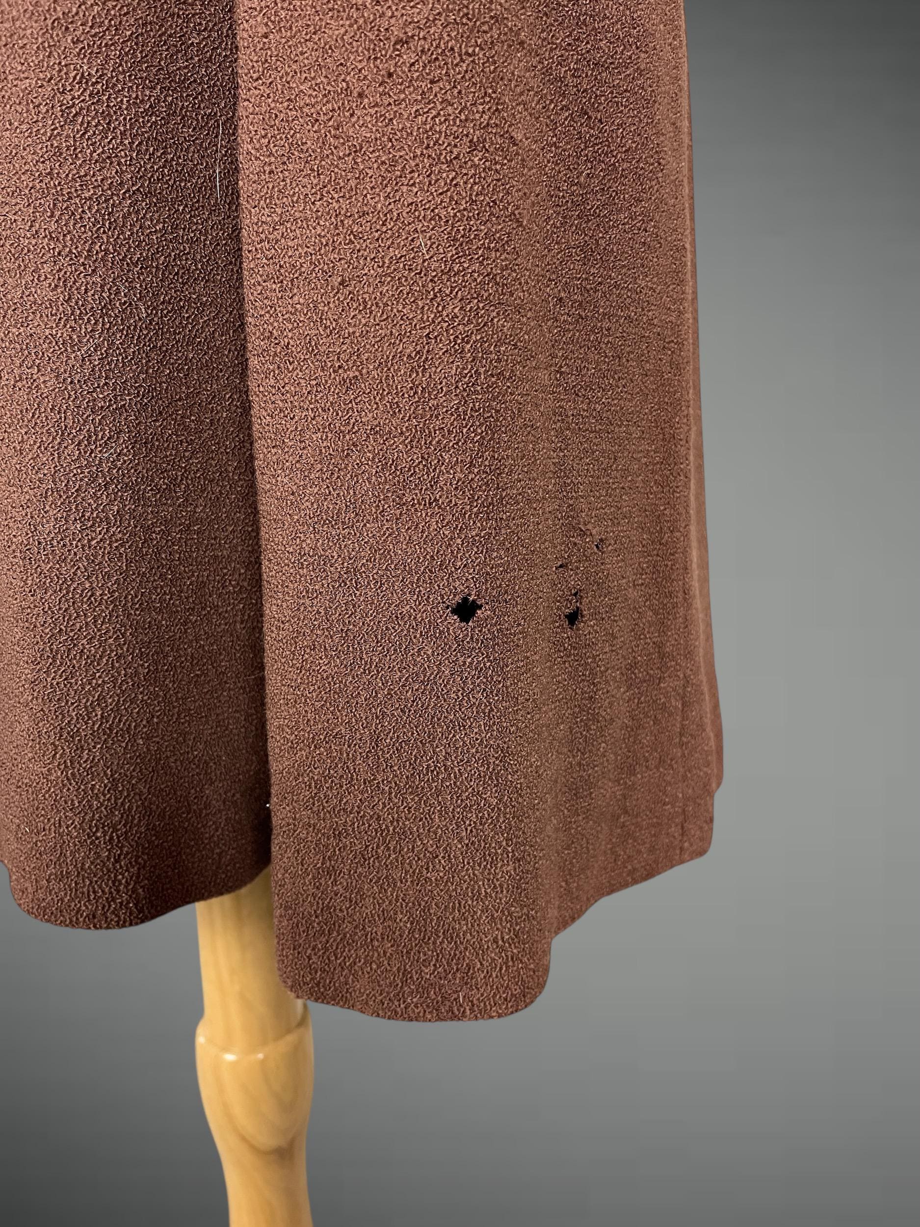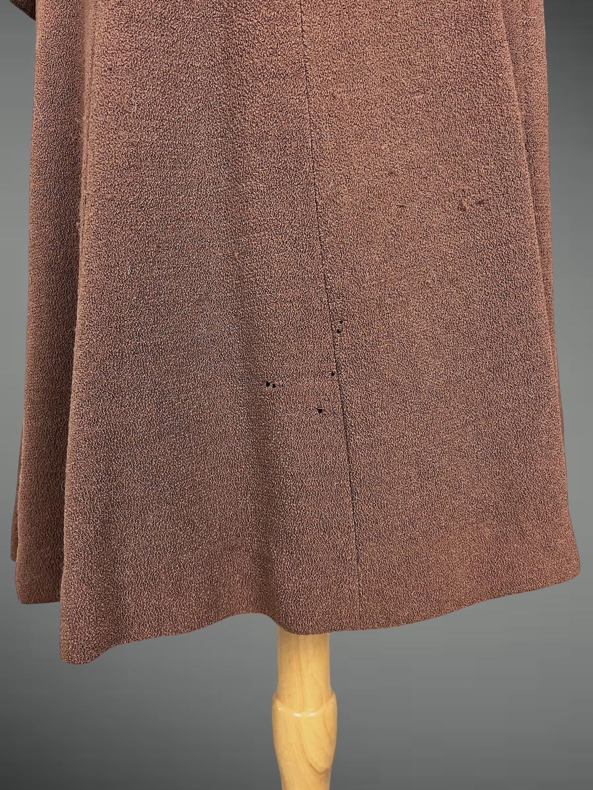 Beautiful late 1930s to early 1940s pre-war winter coat by high-end furrier company I.J. Fox, Fifth Avenue, New York, crafted in a richly textured warm brown bouclé wool and trimmed with a dramatic natural fox fur shawl collar. Fully lined in silk satin, this is a true luxury city coat with fantastic tailoring. The bouclé wool has that perfect looped, pebbly texture that gives softness without losing structure. The silhouette is wonderfully sculpted through the waist with fluid shaping through the hips and hem, finished with side slit pockets and a wrap-style front with snap closure and original side belt tie for an elegant, flattering fit. The fox fur collar is full and dimensional with deep brown tips and soft golden underfur. Hidden snap closures are added beneath each side of the fur collar, allowing you to fasten the under-fur into soft pleated pockets beneath the outer fur when closed — a beautifully functional and unusual design detail.