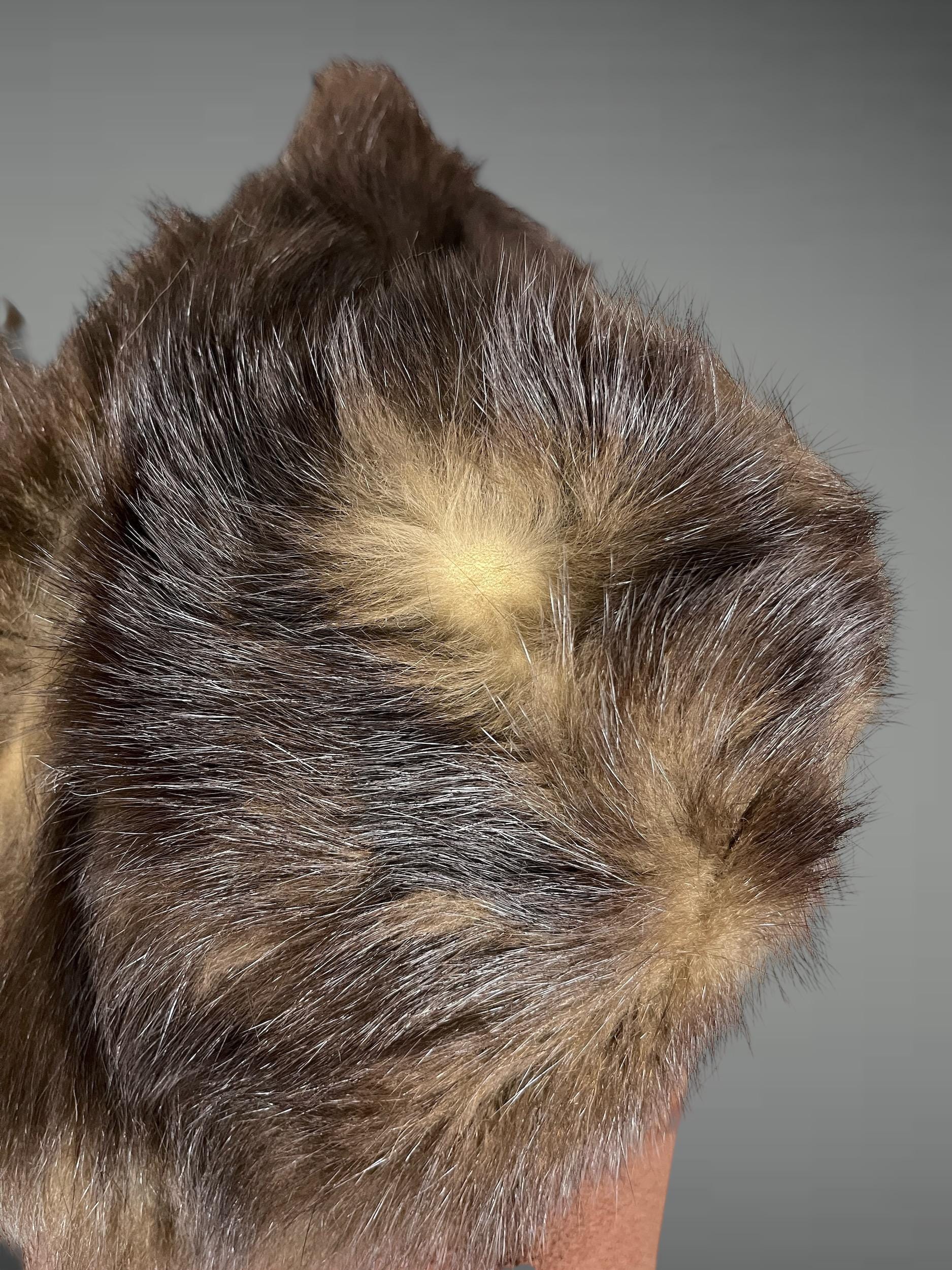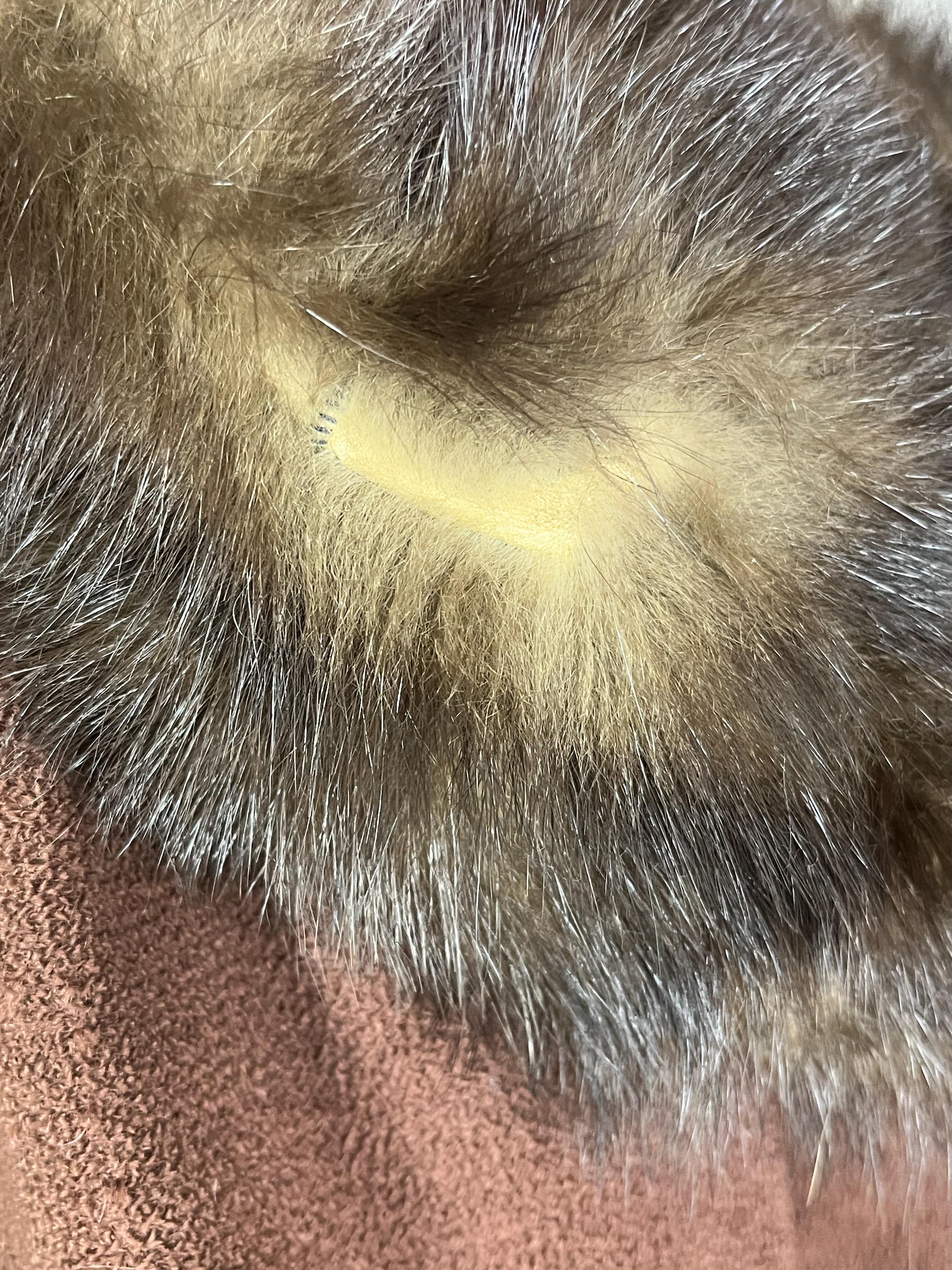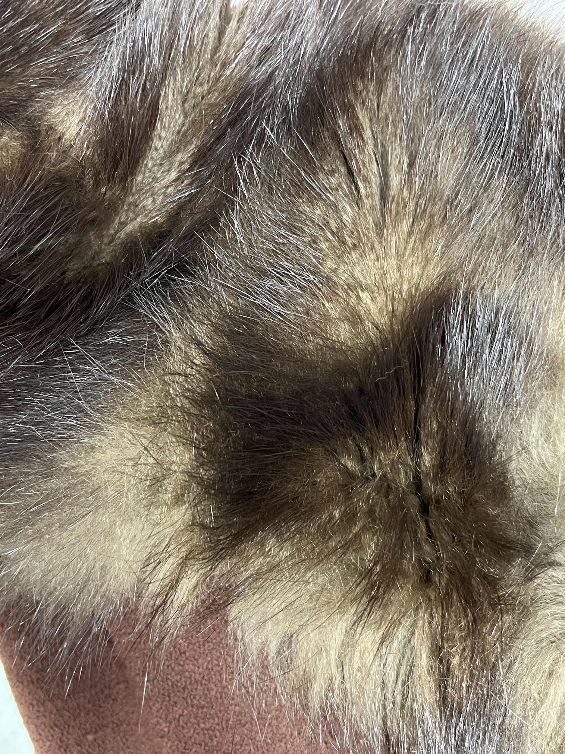 Condition: Good wearable condition with light wear. The fur remains soft and full - there are 2 'bald?' sections where you can see the leather underneath with some stitching (see last 2 close-up pics of fur). A few small holes near the lower skirt and some minor surface texture wear / pricks & pulls to the bouclé, as shown in photos.